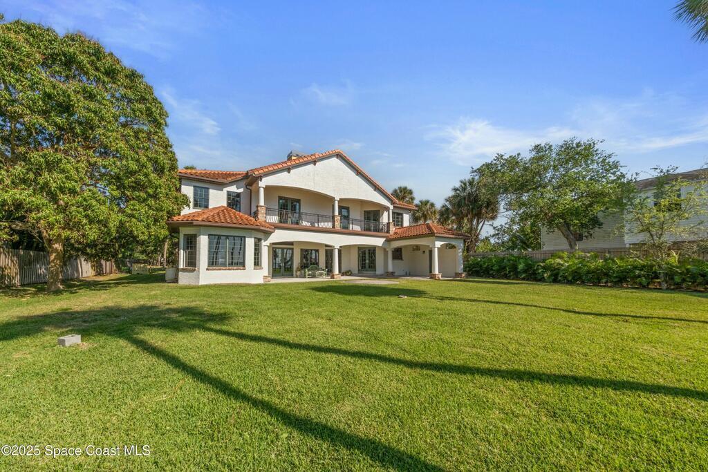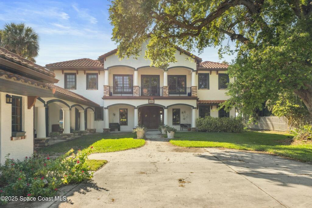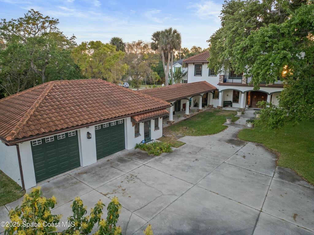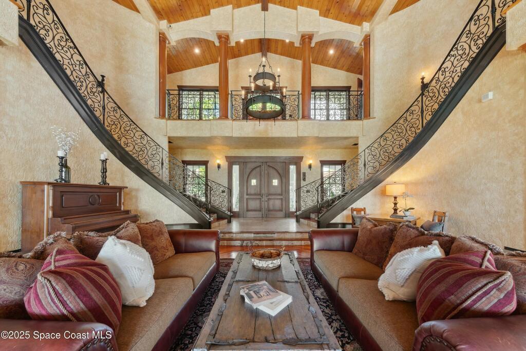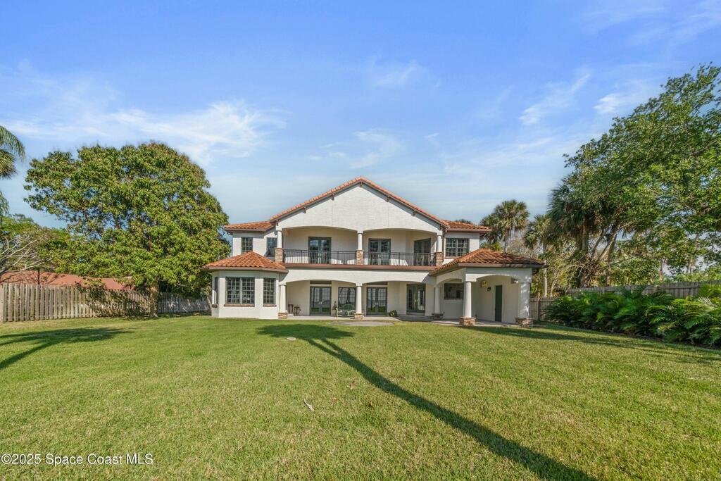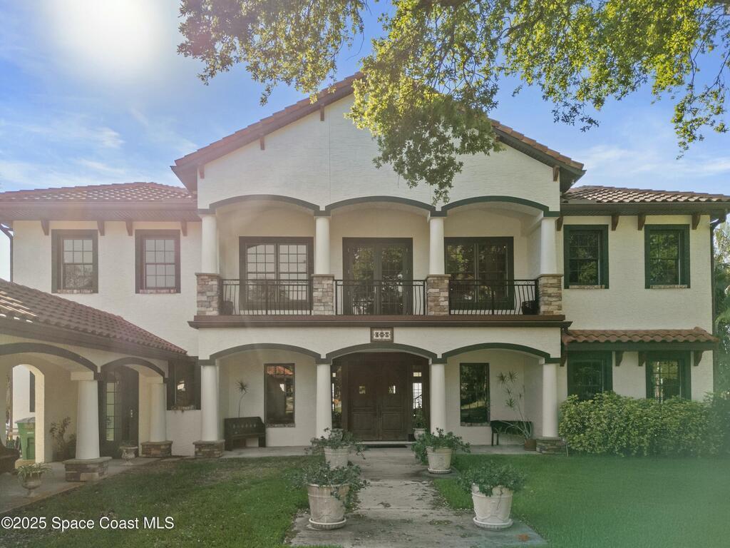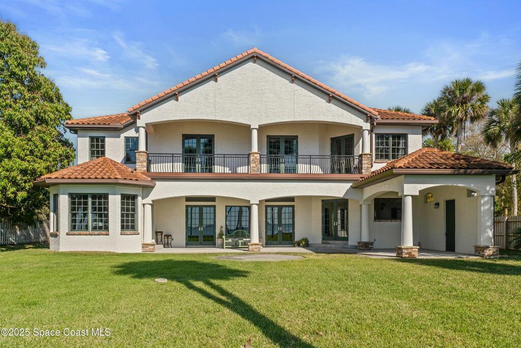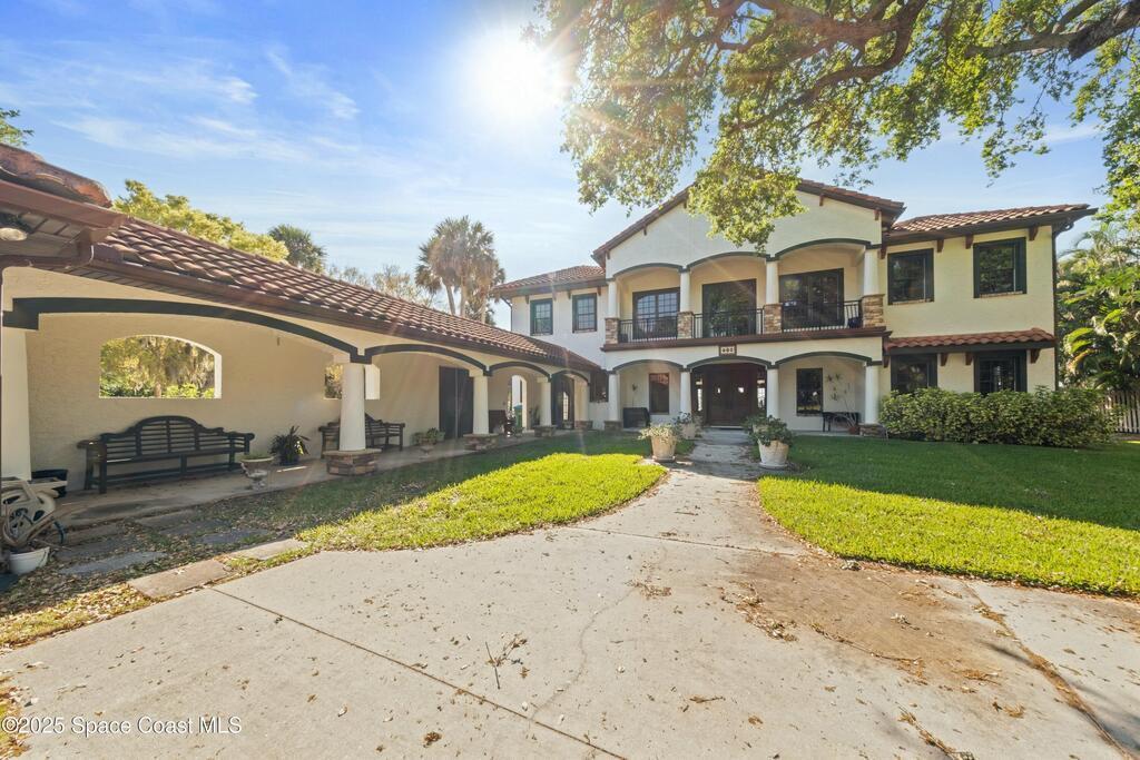 Discover this beautiful Spanish Mediterranean estate in Cape Canaveral, a custom 5, 300sq' home that blends elegance & comfort. Situated on an acre with sweeping views of the Banana River, this property includes 5 bedrooms, 4.5 bathrooms & a detached mother in law suite. It's a short walk to the beach, plus easy boating access from your own backyard. Inside you'll find soaring vaulted ceilings & 18 grand columns, creating an inviting space for gatherings. The reclaimed floors, sourced from a historic Aretesia home, combine beauty with tradition, while the gourmet kitchen impresses with two islands & an industrial style range, featuring brick from the original Cape Canaveral Lighthouse. The luxurious primary suite features an expansive bathroom & a dream closet. Additional highlights include five HVAC units, a tile roof, a generous driveway & a detached two car garage. Built in 2005, this exceptional home is conveniently located near Cocoa Beach, the Space Center & the magic of Disney.