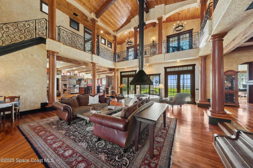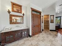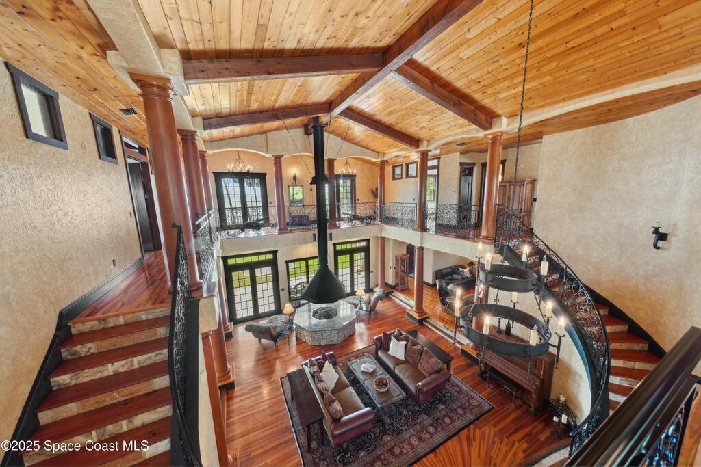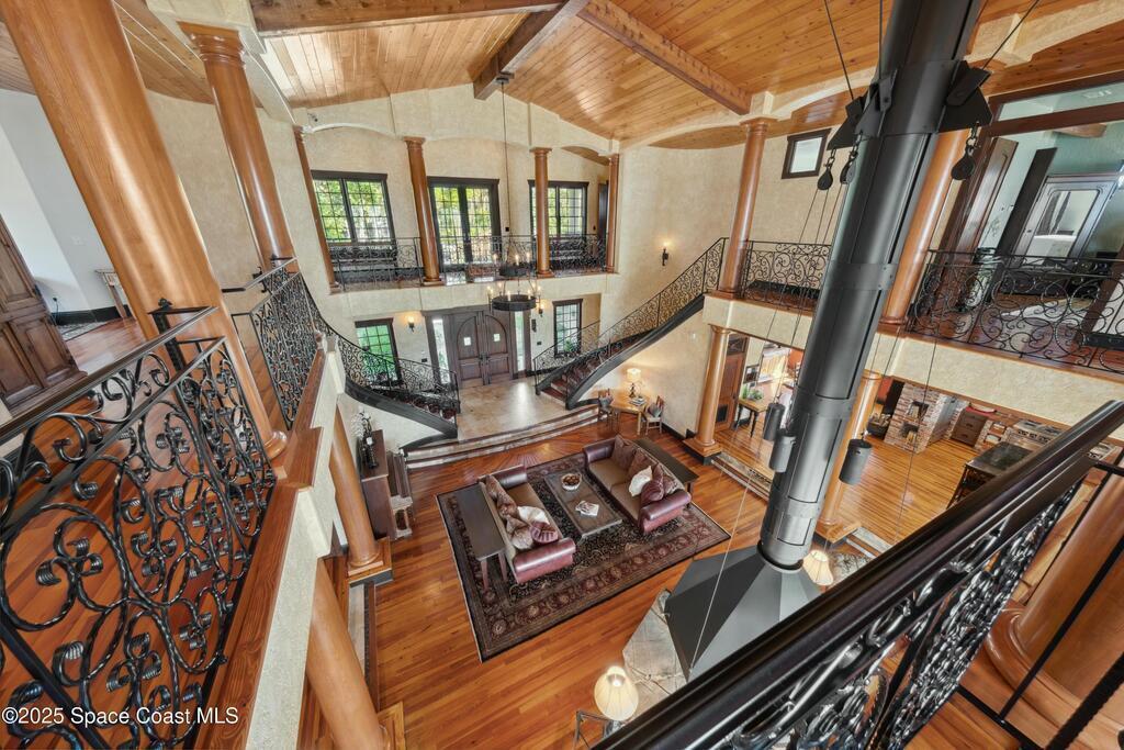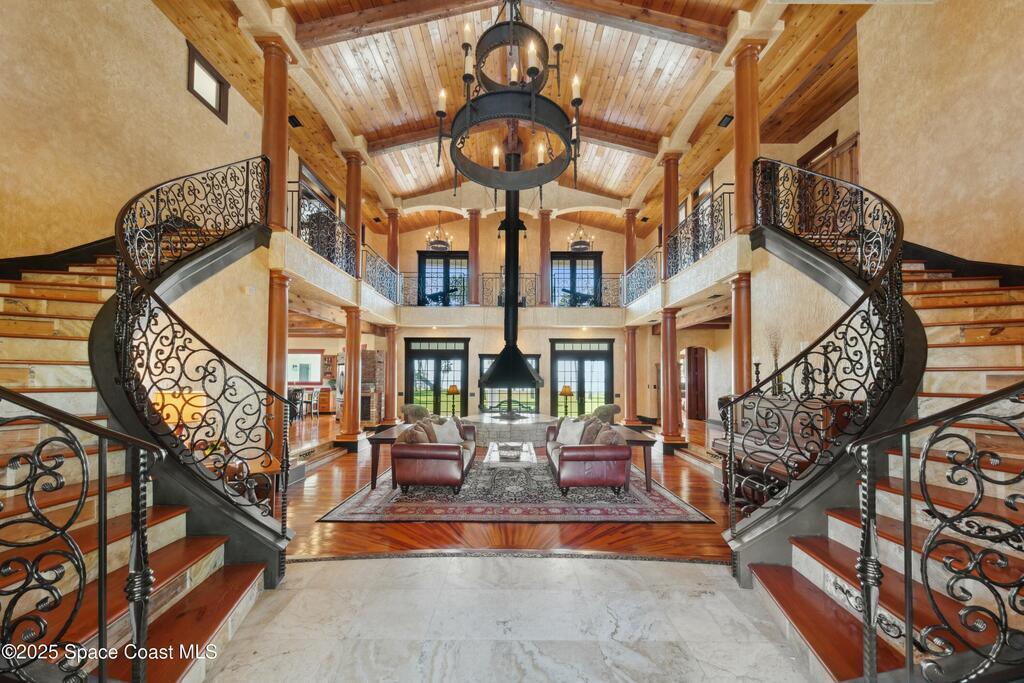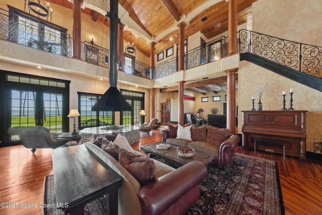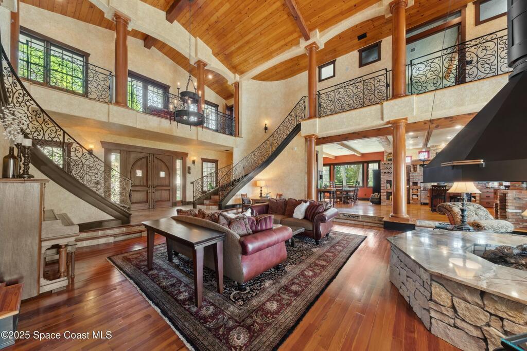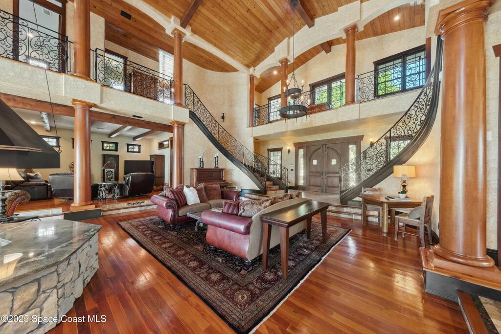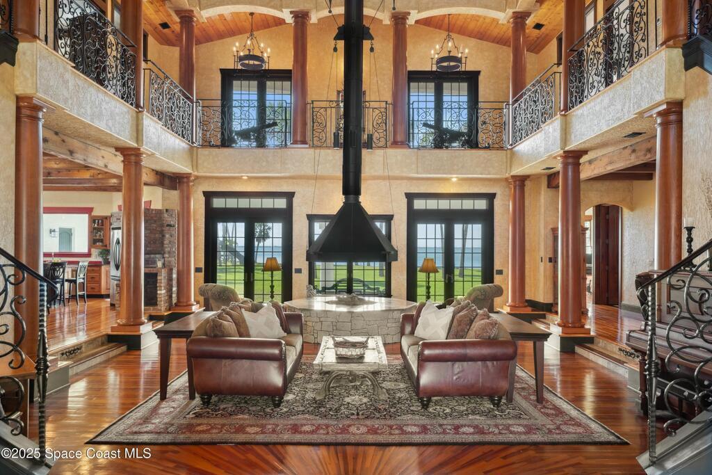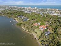 Discover this beautiful Spanish Mediterranean estate in Cape Canaveral, a custom 5, 300sq' home that blends elegance & comfort. Situated on an acre with sweeping views of the Banana River, this property includes 5 bedrooms, 4.5 bathrooms & a detached mother in law suite. It's a short walk to the beach, plus easy boating access from your own backyard. Inside you'll find soaring vaulted ceilings & 18 grand columns, creating an inviting space for gatherings. The reclaimed floors, sourced from a historic Aretesia home, combine beauty with tradition, while the gourmet kitchen impresses with two islands & an industrial style range, featuring brick from the original Cape Canaveral Lighthouse. The luxurious primary suite features an expansive bathroom & a dream closet. Additional highlights include five HVAC units, a tile roof, a generous driveway & a detached two car garage. Built in 2005, this exceptional home is conveniently located near Cocoa Beach, the Space Center & the magic of Disney.