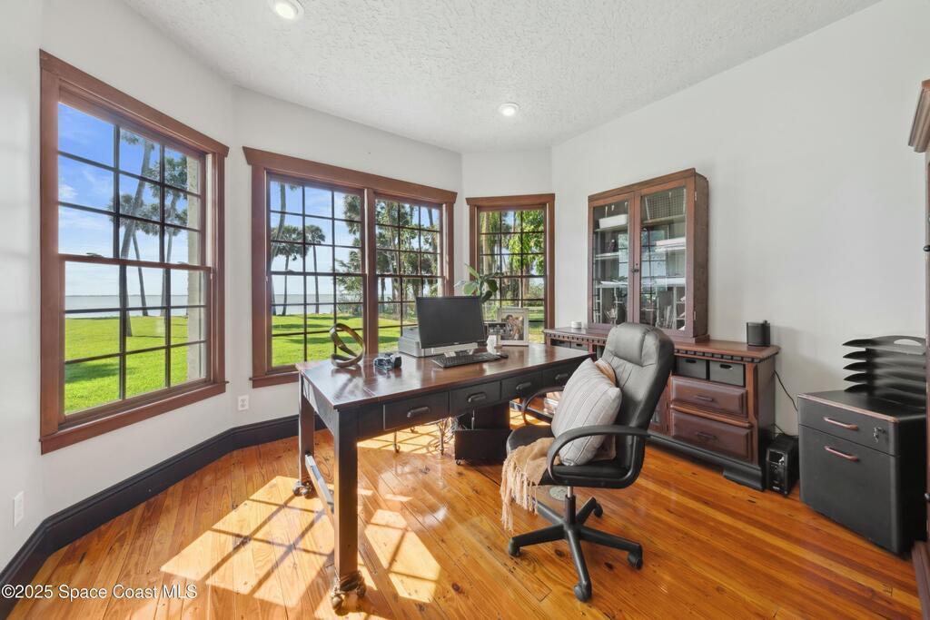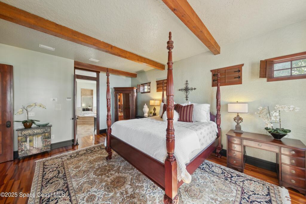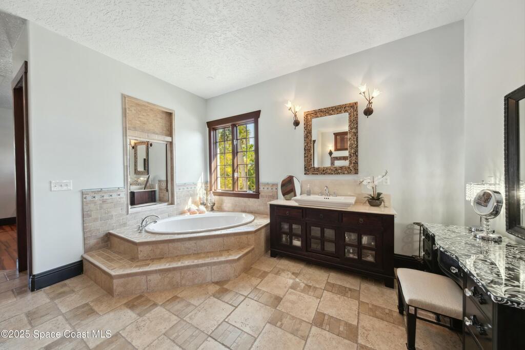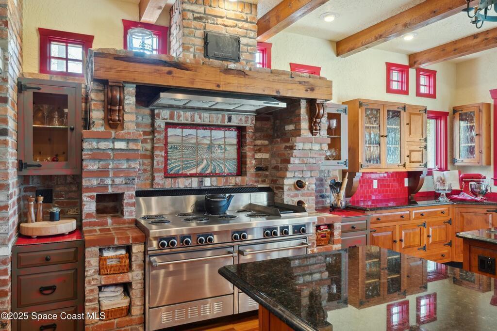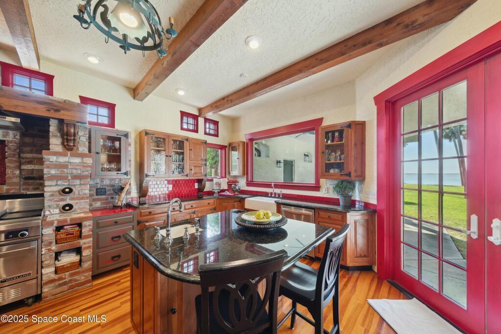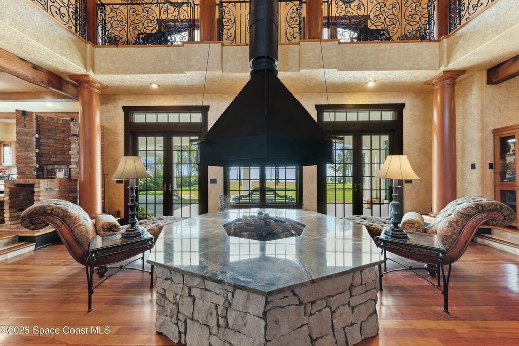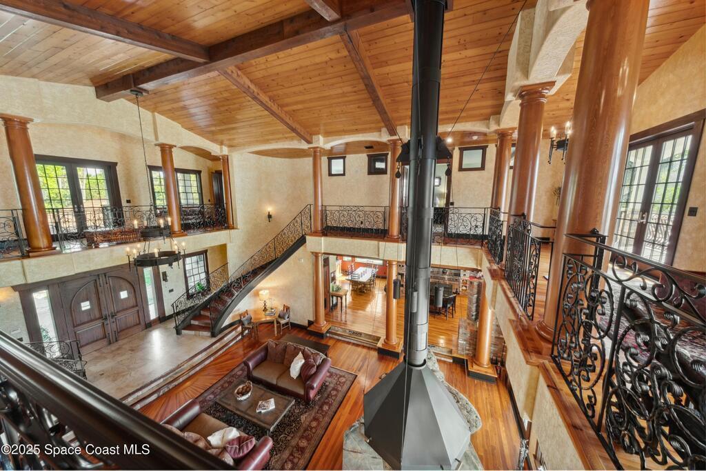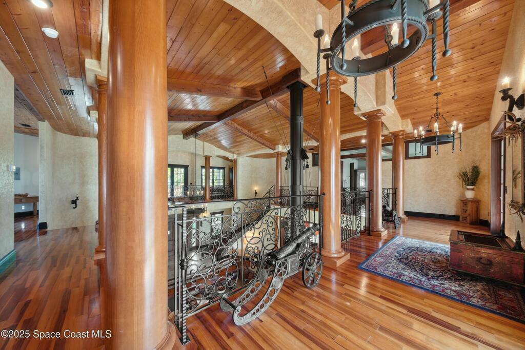 Discover this beautiful Spanish Mediterranean estate in Cape Canaveral, a custom 5, 300sq' home that blends elegance & comfort. Situated on an acre with sweeping views of the Banana River, this property includes 5 bedrooms, 4.5 bathrooms & a detached mother in law suite. It's a short walk to the beach, plus easy boating access from your own backyard. Inside you'll find soaring vaulted ceilings & 18 grand columns, creating an inviting space for gatherings. The reclaimed floors, sourced from a historic Aretesia home, combine beauty with tradition, while the gourmet kitchen impresses with two islands & an industrial style range, featuring brick from the original Cape Canaveral Lighthouse. The luxurious primary suite features an expansive bathroom & a dream closet. Additional highlights include five HVAC units, a tile roof, a generous driveway & a detached two car garage. Built in 2005, this exceptional home is conveniently located near Cocoa Beach, the Space Center & the magic of Disney.