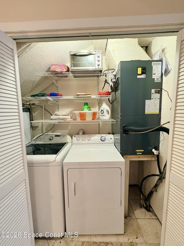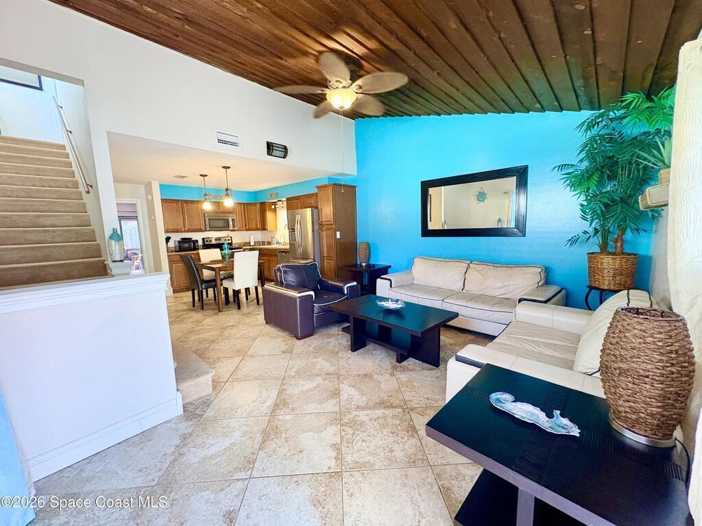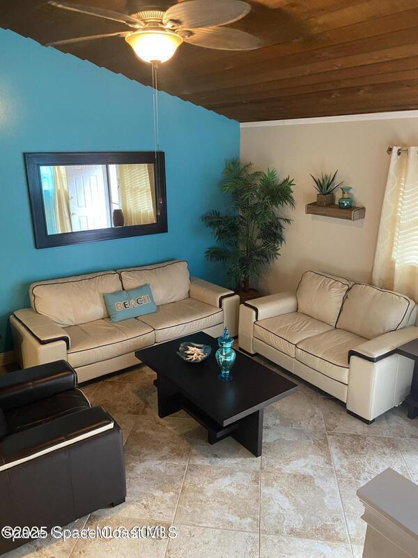 Beautifully furnished, beach-inspired townhome just blocks from the ocean, offering exceptional value and coastal charm--with no HOA. This inviting two-story residence features a fully tiled first floor and a private, gated courtyard off the driveway, creating a welcoming outdoor entry perfect for a relaxed coastal living.The home also offers a screened-in back porch overlooking a private, fenced backyard with a storage shed--ideal for creating your own tropical oasis with plantings, grass, or pavers. The kitchen is equipped with newer appliances, and the unit includes a washer and dryer for everyday convenience.The downstairs bedroom is furnished as a den/TV room, providing flexible space for guests, work, or relaxation. Move-in ready and thoughtfully furnished, this coastal retreat is well suited as a full-time residence, second home, or investment opportunity in a prime beachside location. No monthly minimum, just Cape Canaveral requirement of one week! Great home or investment