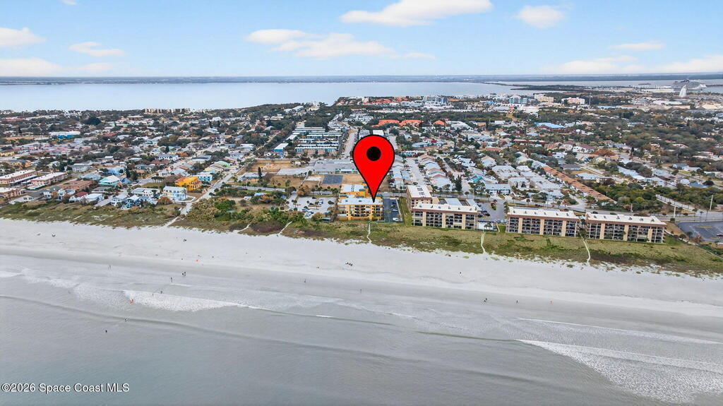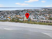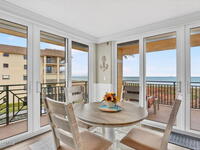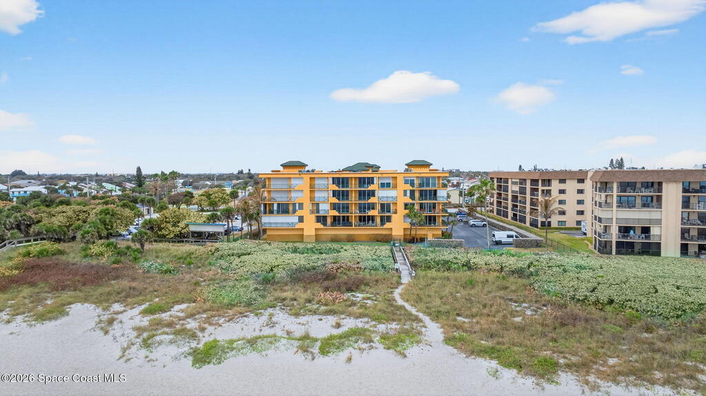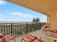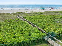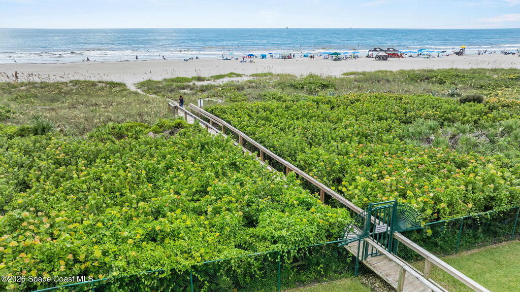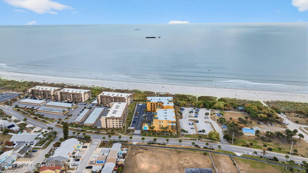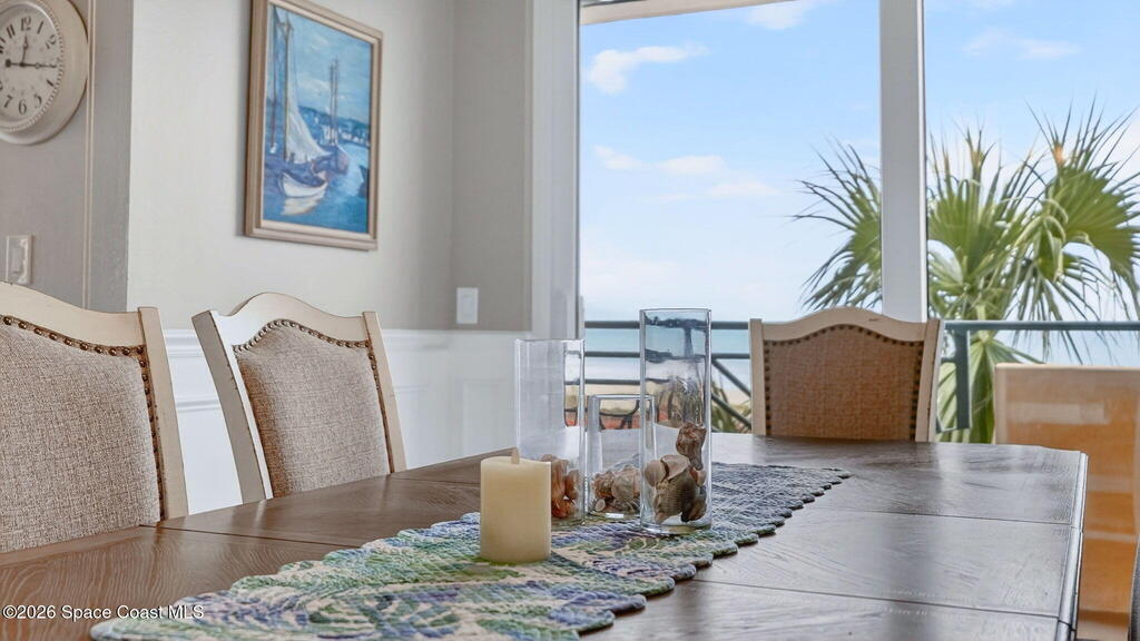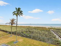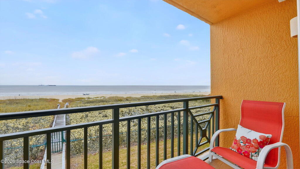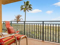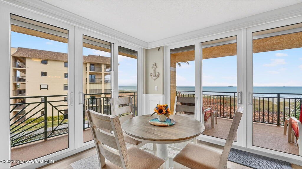 Gated stunning beachfront corner-unit condo fully remodeled and offering 4 bedrooms, 3 full baths, plus a private den. Enjoy sweeping ocean views from the spacious family room and dining area, both overlooking the beach. The luxurious primary suite features its own private balcony with gorgeous ocean views, a newly updated spa-style bath with double vanities, shaker cabinetry, quartz countertops, pedestal, soaking tub with shiplap accent wall, and large walk in closets. The updated kitchen offers shaker cabinets with soft-close hardware, quartz countertops, and a farmhouse sink. Guest baths are beautifully updated.Second primary with updated bathroom and private balcony. New Hurricane-rated sliding glass doors and new storm shutters provide peace of mind. Located in a gated community with heated pool, hot tub, fitness center with spa.New Luxury Vinyl thru out.Garage space and open parking. New roof.A/c 2022.Watch rocket launches from your balcony!Private beach boardwalk.