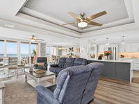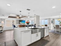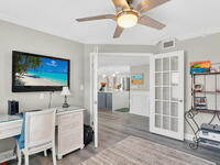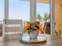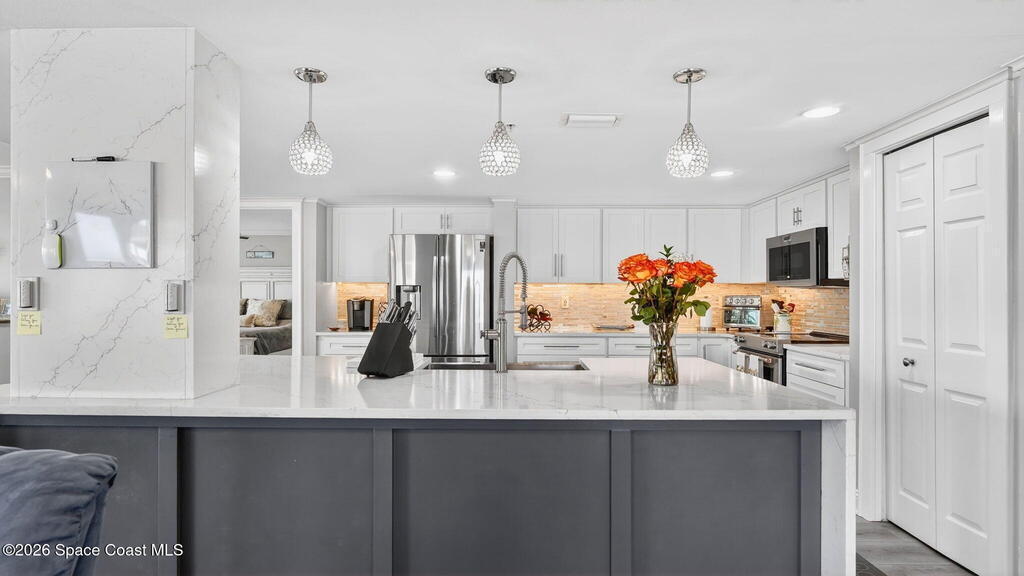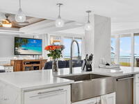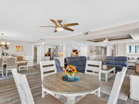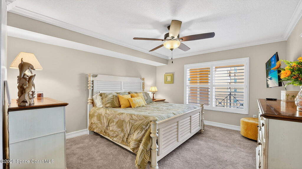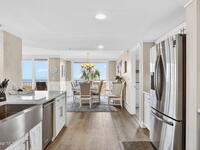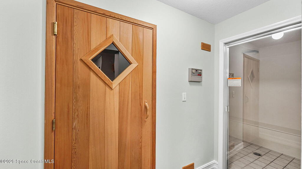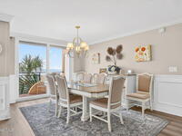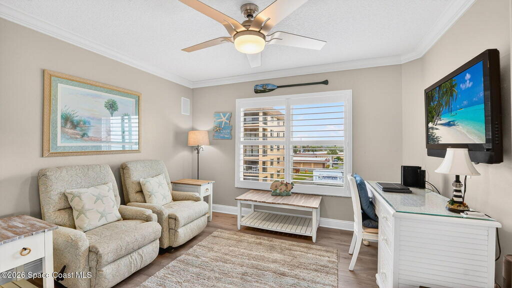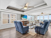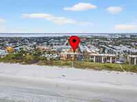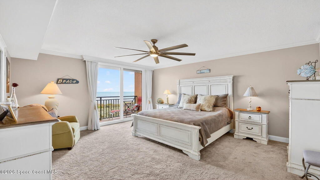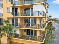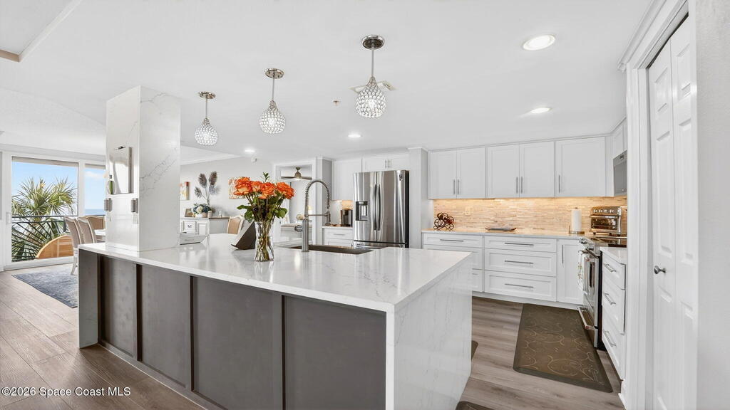Gated stunning beachfront corner-unit condo fully remodeled and offering 4 bedrooms, 3 full baths, plus a private den. Enjoy sweeping ocean views from the spacious family room and dining area, both overlooking the beach. The luxurious primary suite features its own private balcony with gorgeous ocean views, a newly updated spa-style bath with double vanities, shaker cabinetry, quartz countertops, pedestal, soaking tub with shiplap accent wall, and large walk in closets. The updated kitchen offers shaker cabinets with soft-close hardware, quartz countertops, and a farmhouse sink. Guest baths are beautifully updated.Second primary with updated bathroom and private balcony. New Hurricane-rated sliding glass doors and new storm shutters provide peace of mind. Located in a gated community with heated pool, hot tub, fitness center with spa.New Luxury Vinyl thru out.Garage space and open parking. New roof.A/c 2022.Watch rocket launches from your balcony!Private beach boardwalk.