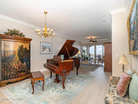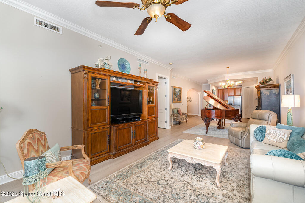 Penthouse Perfection with Panoramic Banana River Views. Three Bedrooms Three Baths Welcome to an exquisite penthouse residence that blends timeless elegance with modern luxury. This exceptional three-bedroom, three-bath home features 10-foot ceilings, impact-rated windows, and plantation shutters throughout, showcasing superior craftsmanship and thoughtful design.Step inside to discover expansive living areas adorned with beautiful crown molding and new architectural laminate flooring. The gourmet kitchen is a chef's dream, offering granite countertops, premium stainless steel appliances, and abundant cabinetry that pairs style with function. The master suite is a serene retreat, featuring a sliding door to the balcony, built-in closets with custom organizers, and a luxurious bath complete with a jetted tub and glass-enclosed shower. Every element has been designed for comfort, sophistication, and ease of living. Relax and unwind on the private screened patio....