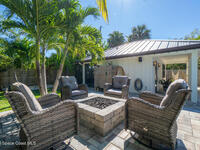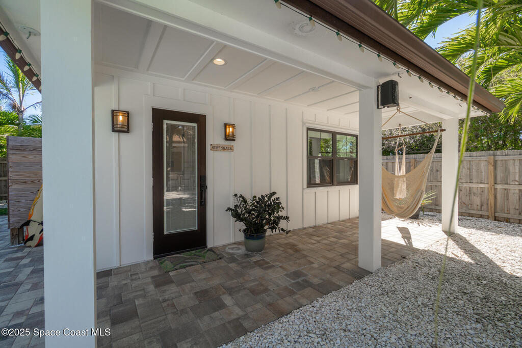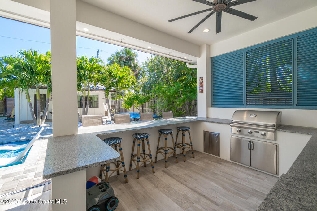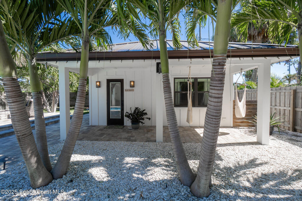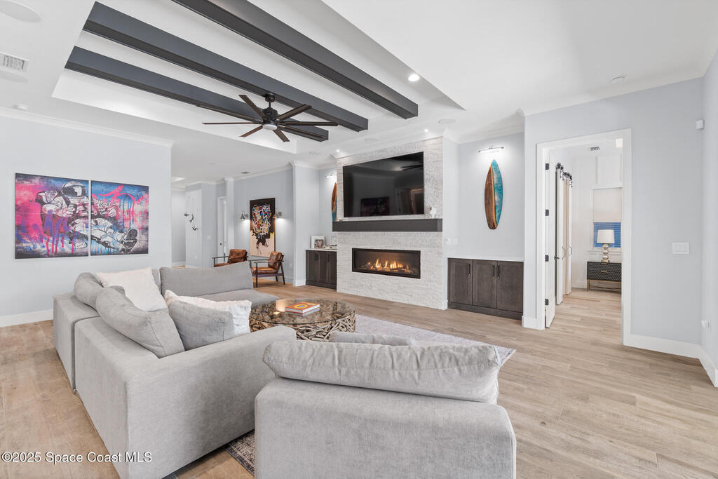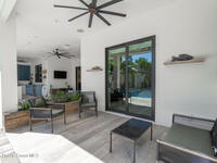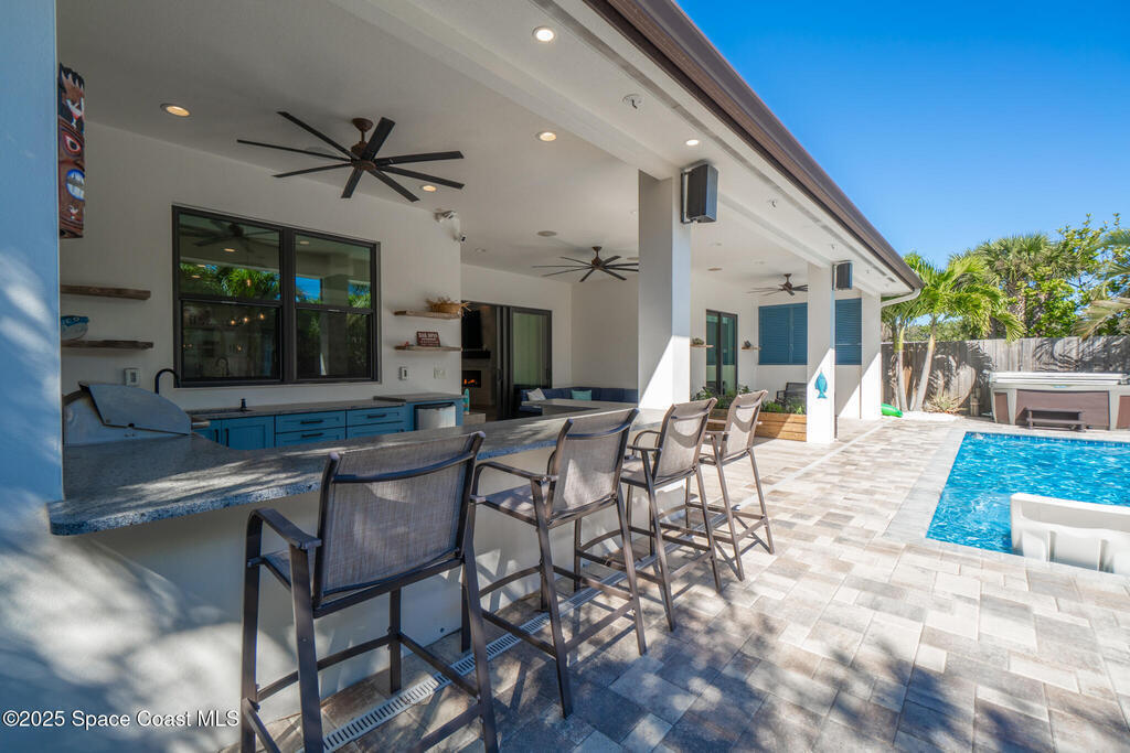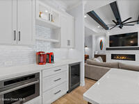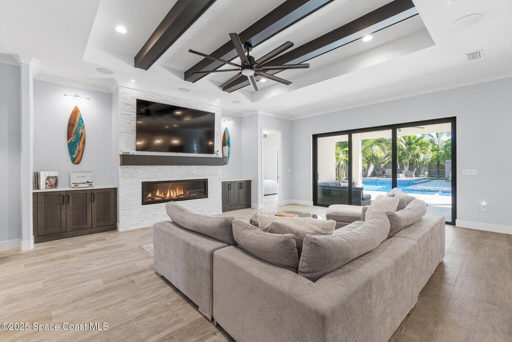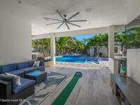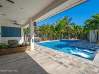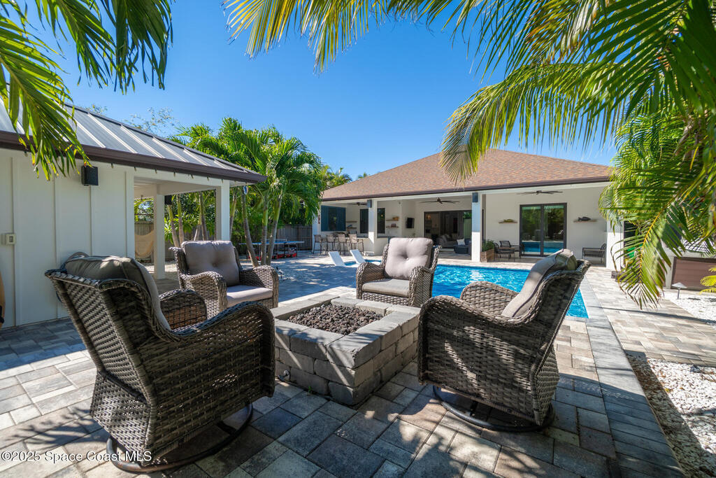 Welcome to your modern beachside oasis. Tucked between the Atlantic Ocean and the Banana River, in the coveted Snug Harbor community of Cocoa Beach. Built in 2020, this stunning 5-bedroom, 3.5-bath residence with nearly 2, 500 sqft of living space perfectly blends luxury, efficiency, and the laid-back Florida lifestyle. Every detail of this home was designed to impress, from the chef's kitchen and high end finishes to the resort style backyard that's truly an entertainer's dream. Step inside and experience an open, sun filled layout with vaulted ceilings, custom wood beam inlays and a cozy gas fireplace that anchors the living area. The heart of the home is a designer kitchen featuring an oversized island, induction cooktop, vented range hood, walk-in pantry, quartz countertops, and sleek cabinetry that combine style and function. Whether you're hosting friends or cooking a quiet meal at home, this space was built for connection. The primary suite feels like a private retreat,