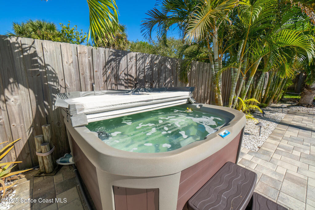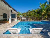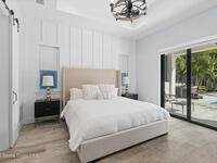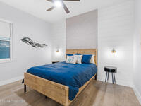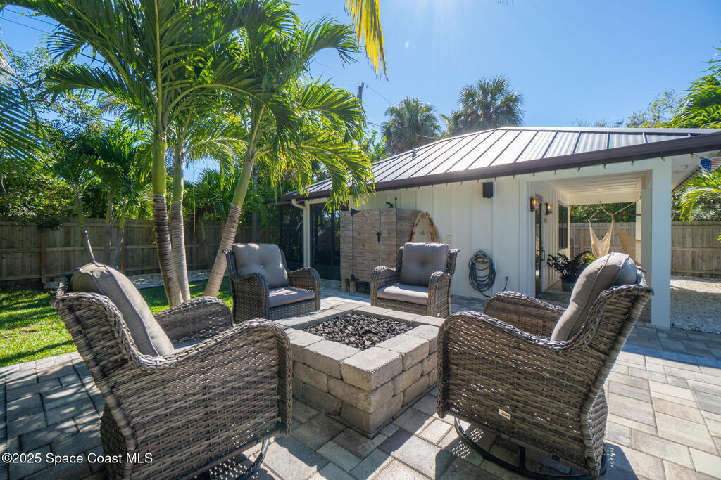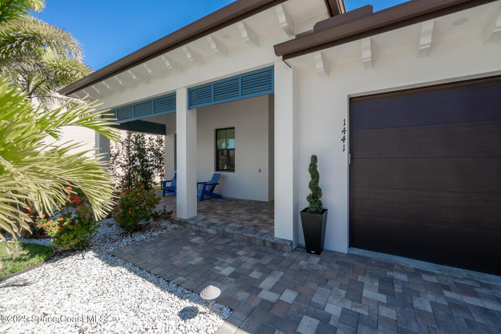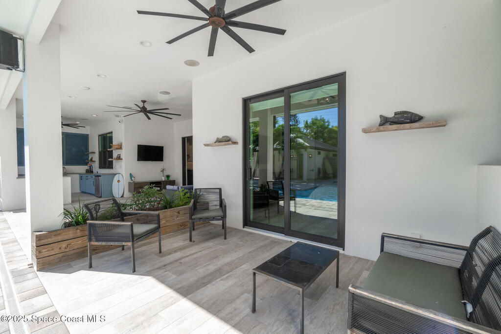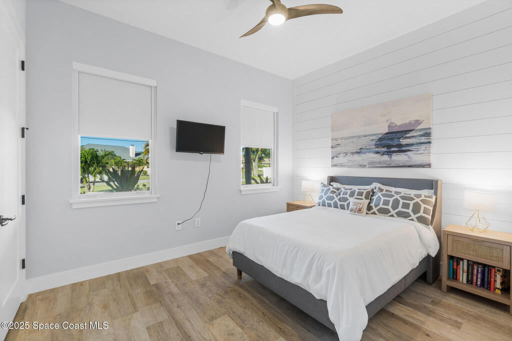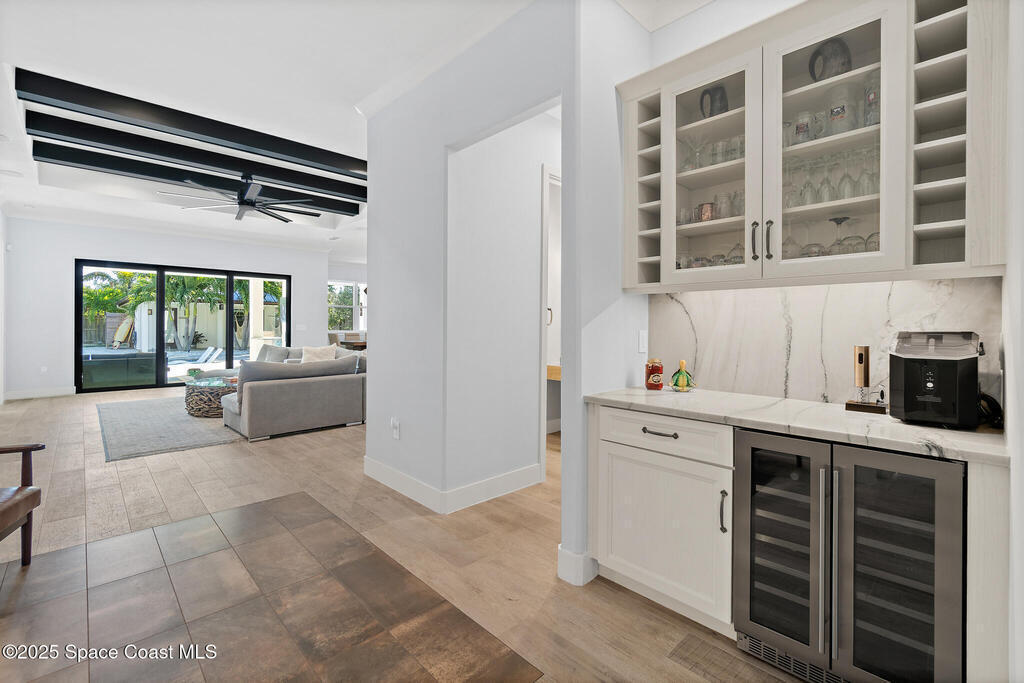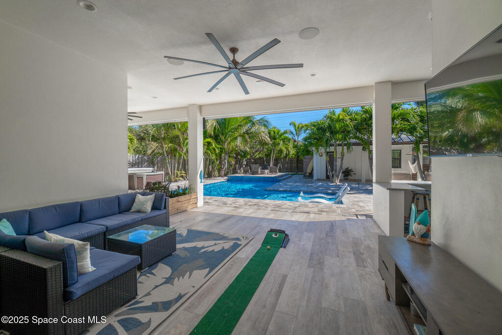 Welcome to your modern beachside oasis. Tucked between the Atlantic Ocean and the Banana River, in the coveted Snug Harbor community of Cocoa Beach. Built in 2020, this stunning 5-bedroom, 3.5-bath residence with nearly 2, 500 sqft of living space perfectly blends luxury, efficiency, and the laid-back Florida lifestyle. Every detail of this home was designed to impress, from the chef's kitchen and high end finishes to the resort style backyard that's truly an entertainer's dream. Step inside and experience an open, sun filled layout with vaulted ceilings, custom wood beam inlays and a cozy gas fireplace that anchors the living area. The heart of the home is a designer kitchen featuring an oversized island, induction cooktop, vented range hood, walk-in pantry, quartz countertops, and sleek cabinetry that combine style and function. Whether you're hosting friends or cooking a quiet meal at home, this space was built for connection. The primary suite feels like a private retreat,