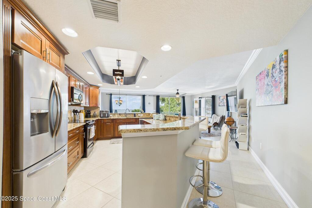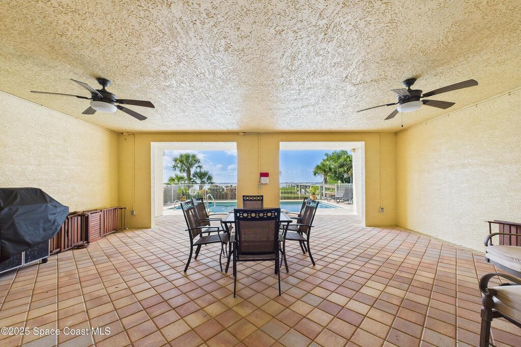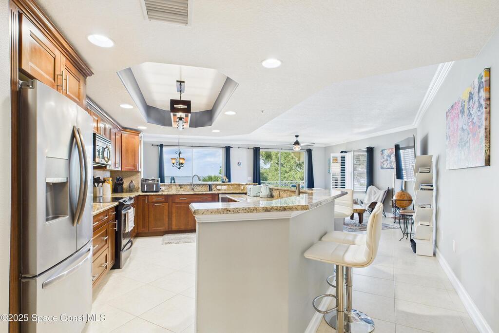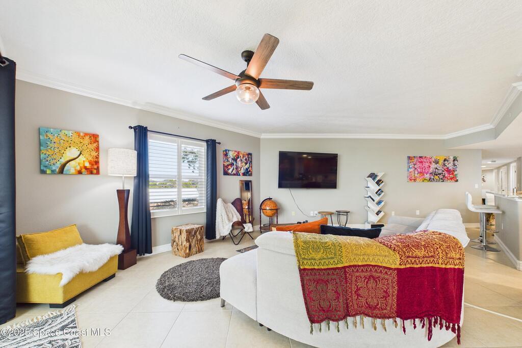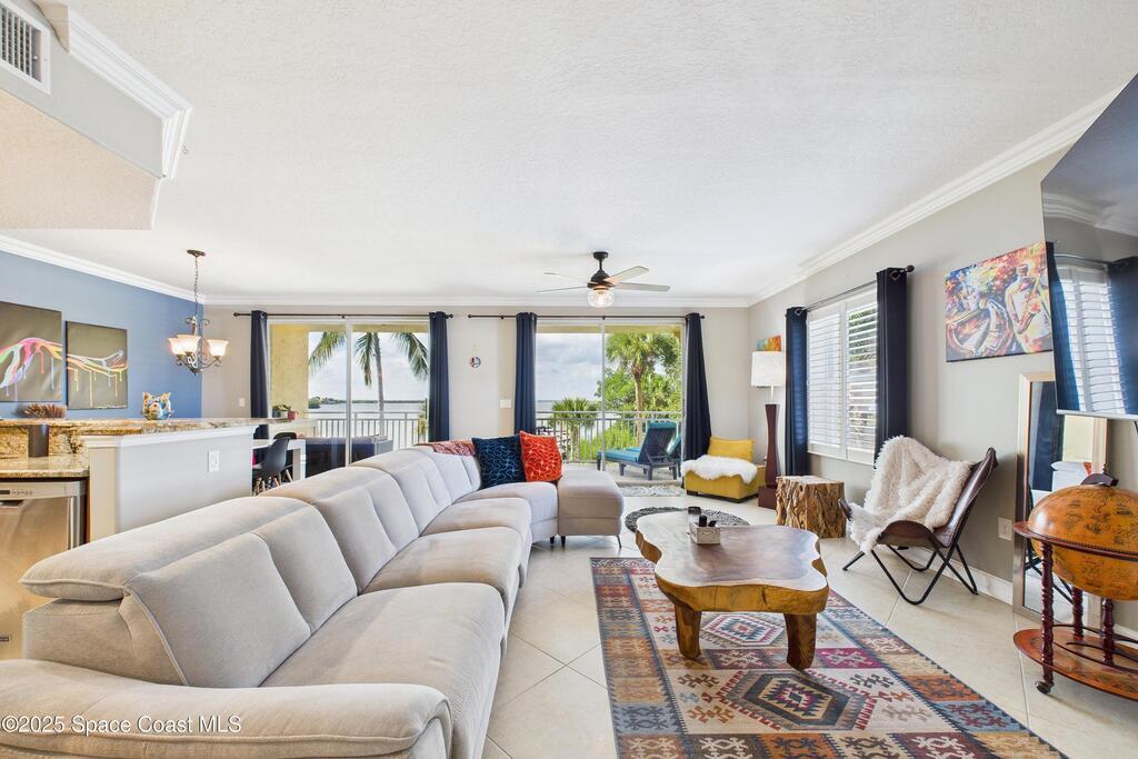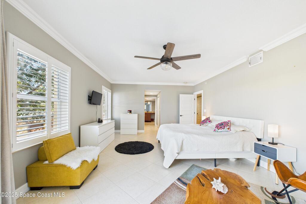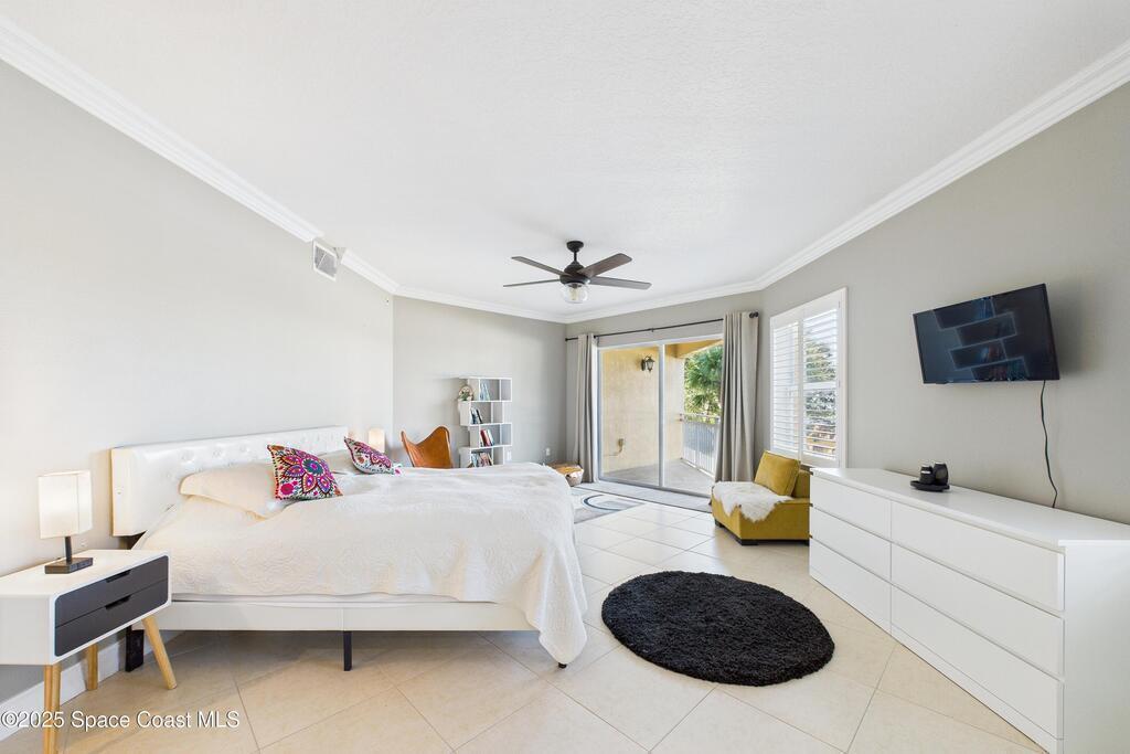 Spectacular DIRECT BANANA RIVERFRONT CORNER UNIT offering breathtaking views and a peaceful waterfront lifestyle in the boutique 11-unit community of Garden Bay. Rare opportunity to own an end unit in this highly desirable Cocoa Beach complex--just a short stroll to the ocean, restaurants, and shopping. Nearly 2, 600 sq ft of luxury living with 4 bedrooms, 3.5 baths, and a private 2-car garage. High 8.5' ceilings, crown molding, travertine and wood flooring (no carpet), and impact windows with plantation shutters throughout. The gourmet kitchen boasts granite countertops, custom cabinetry, tile backsplash, and newer stainless appliances overlooking the water. Spacious owner's suite features double walk-in closets, private balcony, and spa-inspired bath with jetted tub and marble shower. Each guest bedroom has its own ensuite bath for privacy and comfort.