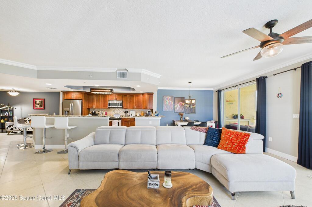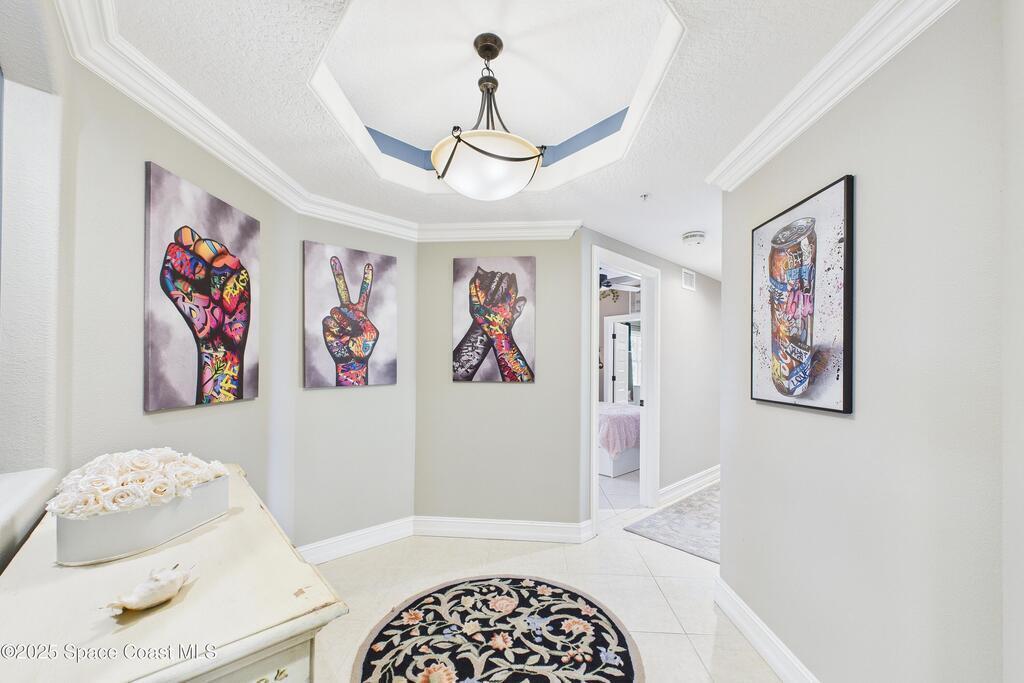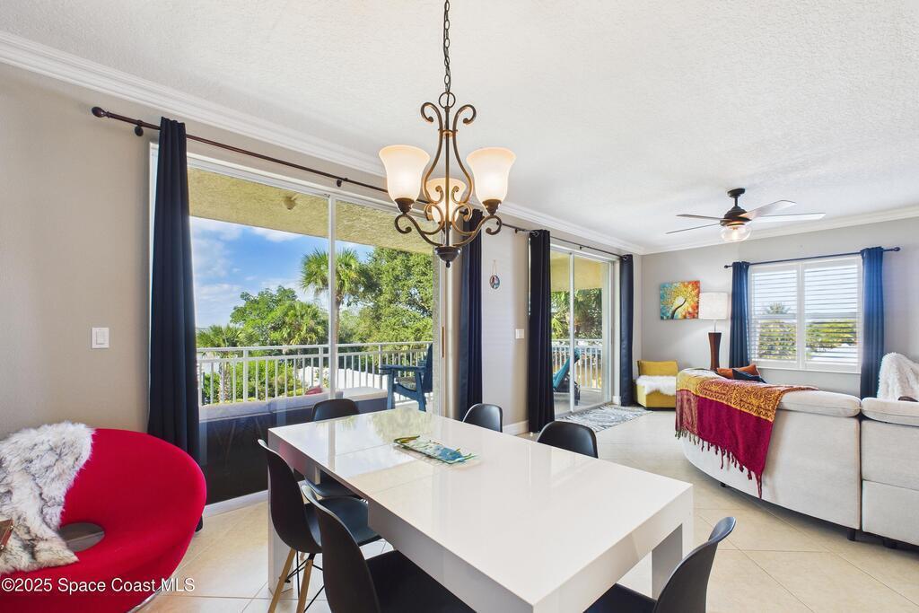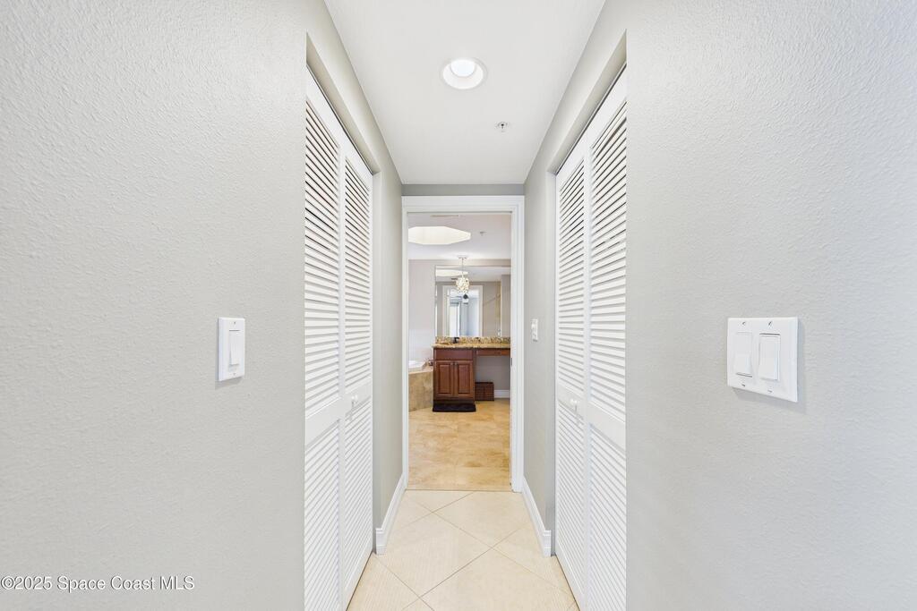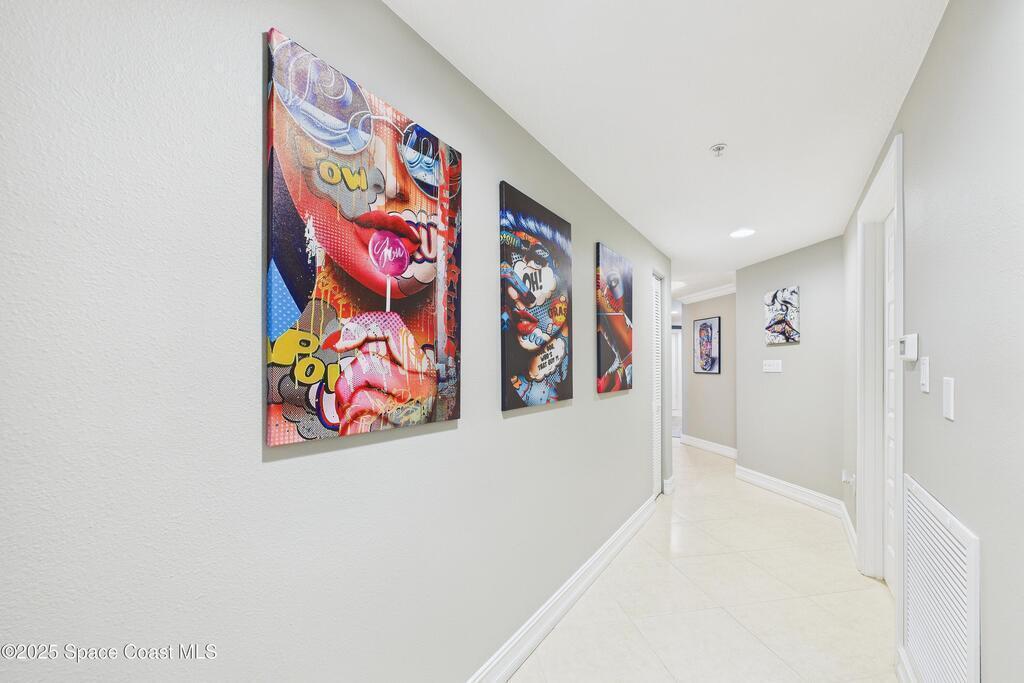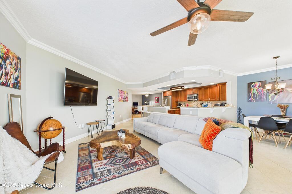 Spectacular DIRECT BANANA RIVERFRONT CORNER UNIT offering breathtaking views and a peaceful waterfront lifestyle in the boutique 11-unit community of Garden Bay. Rare opportunity to own an end unit in this highly desirable Cocoa Beach complex--just a short stroll to the ocean, restaurants, and shopping. Nearly 2, 600 sq ft of luxury living with 4 bedrooms, 3.5 baths, and a private 2-car garage. High 8.5' ceilings, crown molding, travertine and wood flooring (no carpet), and impact windows with plantation shutters throughout. The gourmet kitchen boasts granite countertops, custom cabinetry, tile backsplash, and newer stainless appliances overlooking the water. Spacious owner's suite features double walk-in closets, private balcony, and spa-inspired bath with jetted tub and marble shower. Each guest bedroom has its own ensuite bath for privacy and comfort.