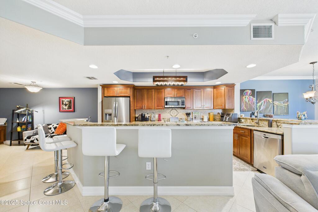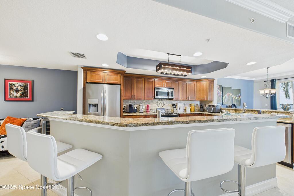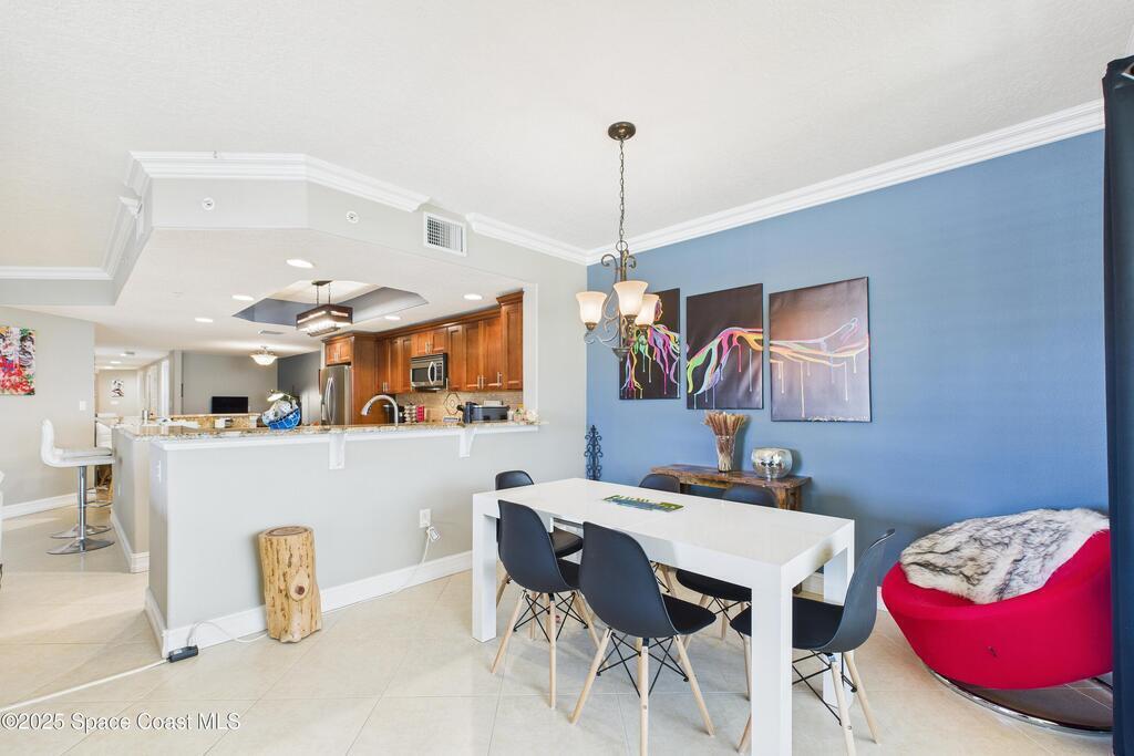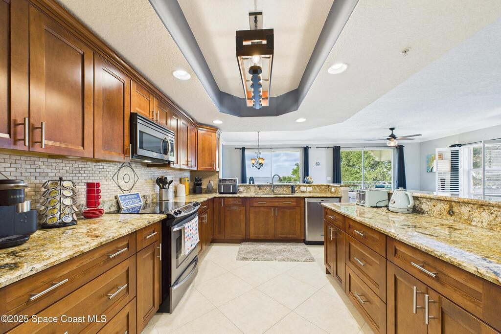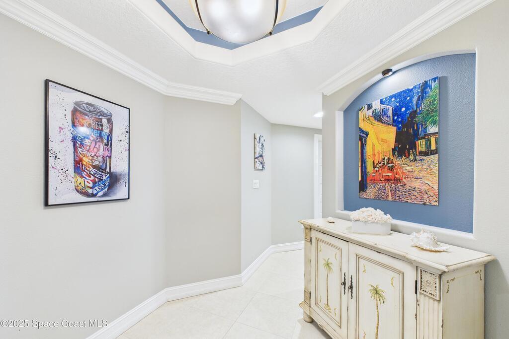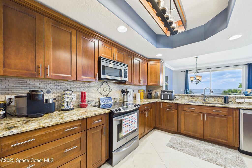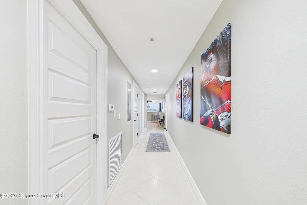Spectacular DIRECT BANANA RIVERFRONT CORNER UNIT offering breathtaking views and a peaceful waterfront lifestyle in the boutique 11-unit community of Garden Bay. Rare opportunity to own an end unit in this highly desirable Cocoa Beach complex--just a short stroll to the ocean, restaurants, and shopping. Nearly 2, 600 sq ft of luxury living with 4 bedrooms, 3.5 baths, and a private 2-car garage. High 8.5' ceilings, crown molding, travertine and wood flooring (no carpet), and impact windows with plantation shutters throughout. The gourmet kitchen boasts granite countertops, custom cabinetry, tile backsplash, and newer stainless appliances overlooking the water. Spacious owner's suite features double walk-in closets, private balcony, and spa-inspired bath with jetted tub and marble shower. Each guest bedroom has its own ensuite bath for privacy and comfort.