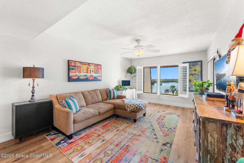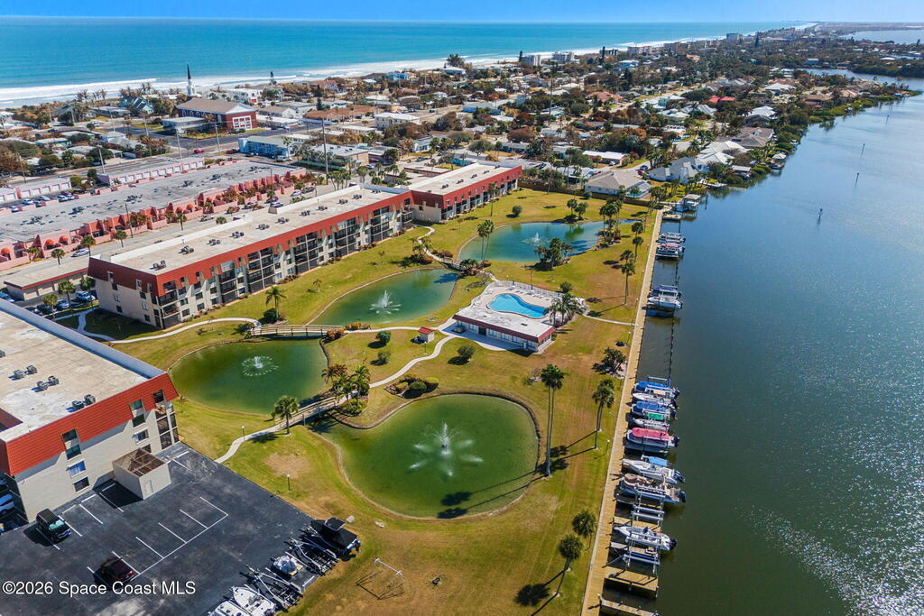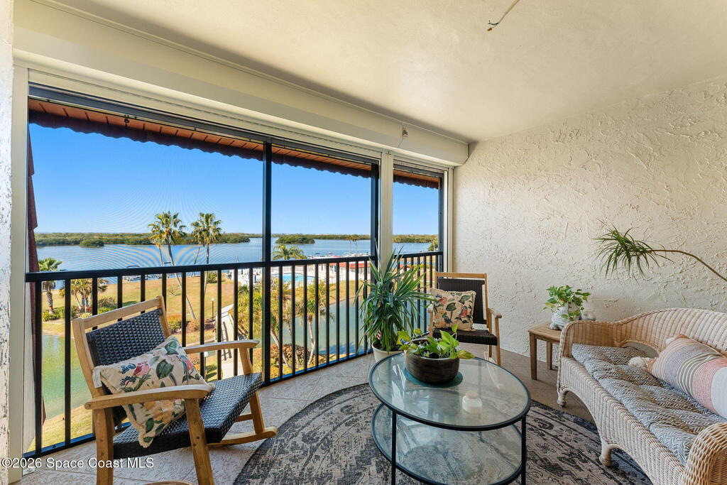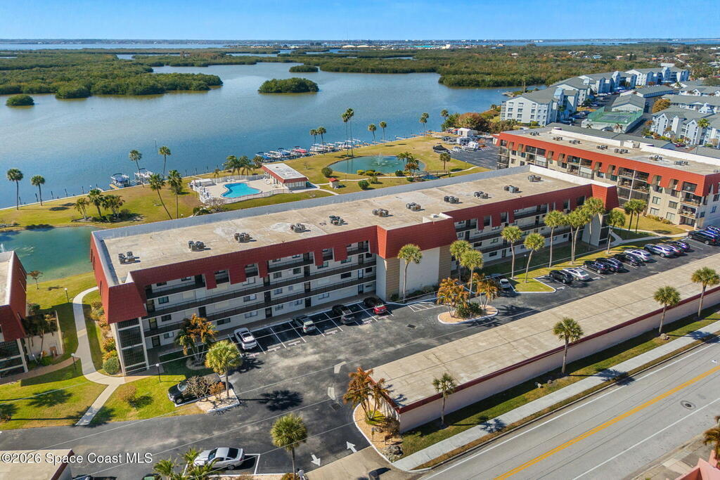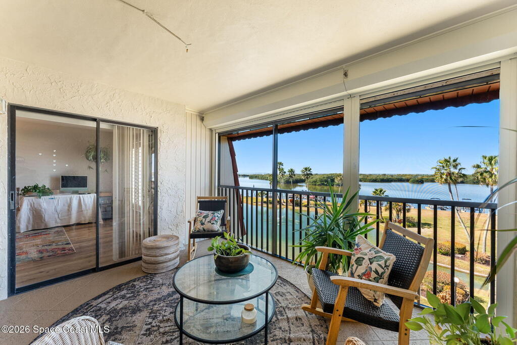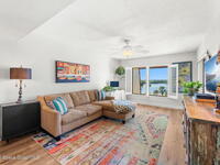 Wake up to sweeping lake and Banana River views from this top-floor 2 bedroom, 2 bathroom residence in the River Lakes riverfront community. Bright, breezy, and thoughtfully updated, this home features a beautifully renovated kitchen with quartz counters, refreshed baths, newer laminate flooring in the living spaces, and an open layout that captures the scenery from multiple rooms. A versatile bonus room provides space for a home office, second living area, or comfortable guest retreat. The primary suite opens to a screened balcony where you can relax while watching spectacular sunsets, dolphins, and manatees swimming in the water. Newer electric hurricane shutters, plantation shutters, and an HVAC system less than a year old offer comfort and peace of mind. A private garage adds convenience, and boat slips may be available for purchase or rent. Residents enjoy a scenic 725-foot river walk and a true Florida waterfront lifestyle just a short two-block walk to the ocean.