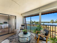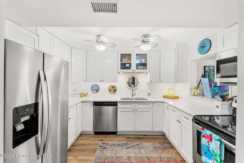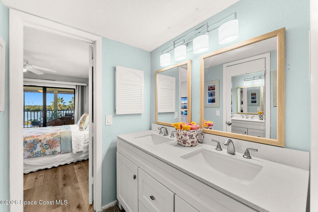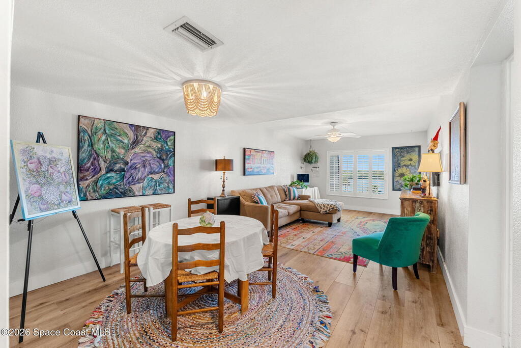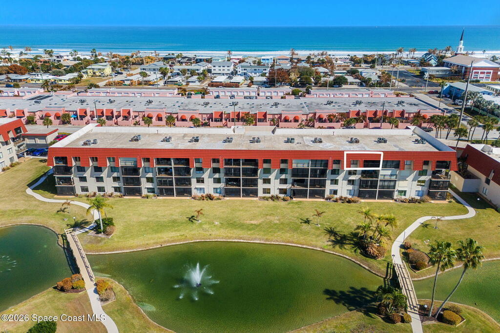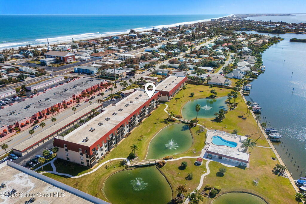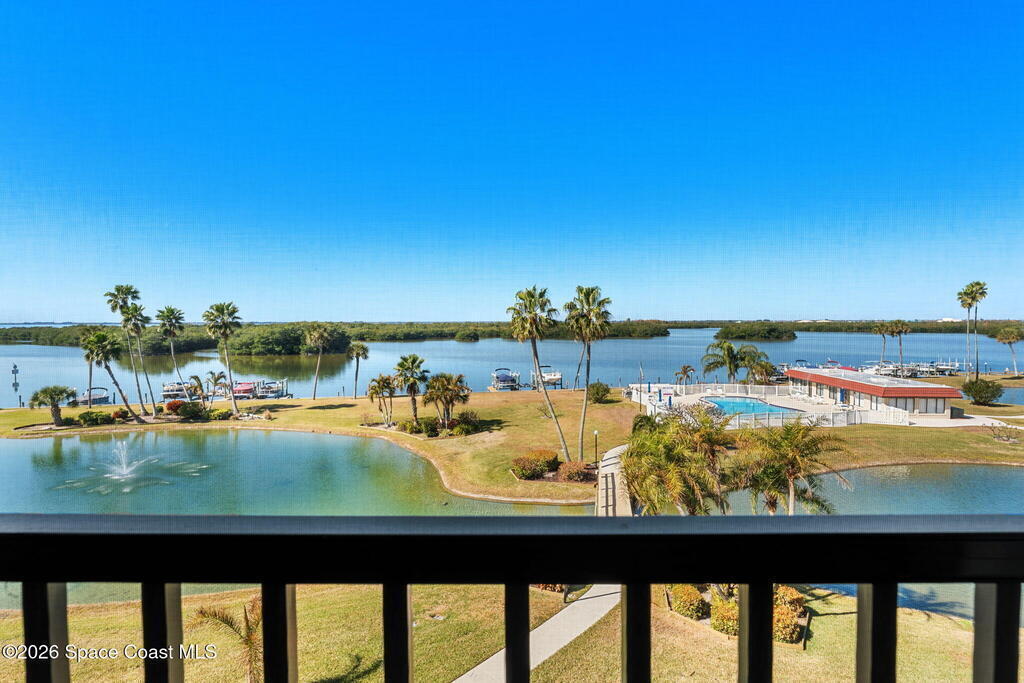 Wake up to sweeping lake and Banana River views from this top-floor 2 bedroom, 2 bathroom residence in the River Lakes riverfront community. Bright, breezy, and thoughtfully updated, this home features a beautifully renovated kitchen with quartz counters, refreshed baths, newer laminate flooring in the living spaces, and an open layout that captures the scenery from multiple rooms. A versatile bonus room provides space for a home office, second living area, or comfortable guest retreat. The primary suite opens to a screened balcony where you can relax while watching spectacular sunsets, dolphins, and manatees swimming in the water. Newer electric hurricane shutters, plantation shutters, and an HVAC system less than a year old offer comfort and peace of mind. A private garage adds convenience, and boat slips may be available for purchase or rent. Residents enjoy a scenic 725-foot river walk and a true Florida waterfront lifestyle just a short two-block walk to the ocean.