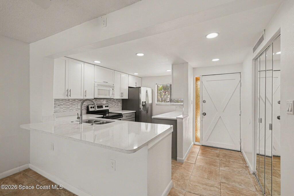 Wake up to breathtaking Banana River views in this beautifully updated condo, perfectly situated in a peaceful Cocoa Beach setting. This light-filled residence features a modern kitchen with quartz countertops, stainless-steel appliances, and stylish finishes throughout. The updated bathrooms include a Bluetooth-enabled mirror in the primary bath, while new flooring and fresh interior paint create a clean, move-in-ready feel. The flexible layout offers two comfortable bedrooms plus a spacious bonus room ideal for a home office, fitness area, or additional living space. The enclosed lanai with impact glass provides a serene spot to relax, entertain, or watch spectacular rocket launches over the river. Residents enjoy access to a community pool and dock, with potential boat slip availability, all just minutes from the Atlantic Ocean, local dining, shopping, and parks. Experience the perfect blend of modern updates, coastal lifestyle, and waterfront tranquility.HVAC-2024, Water Heater-2025