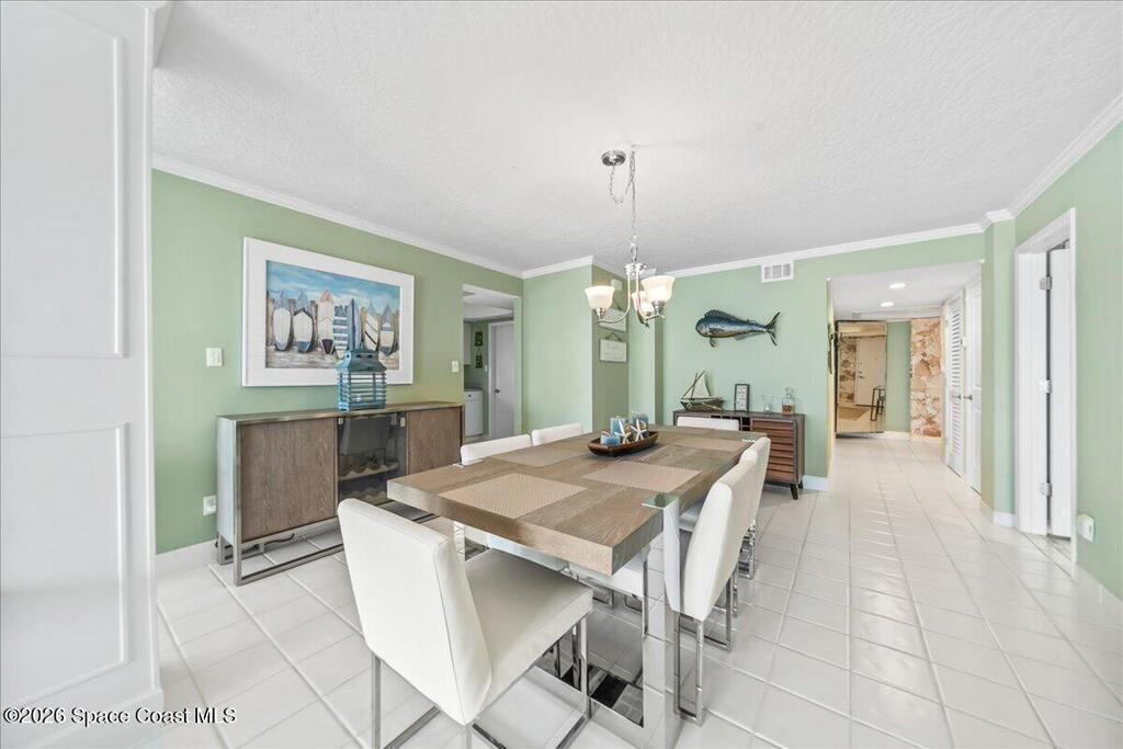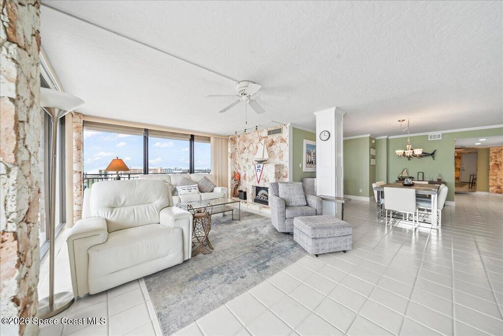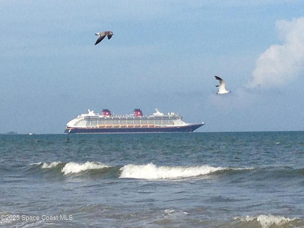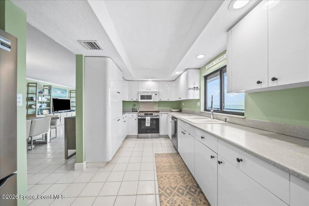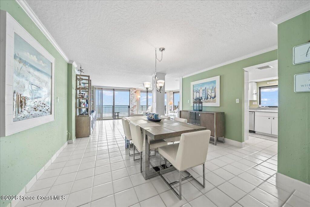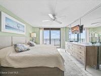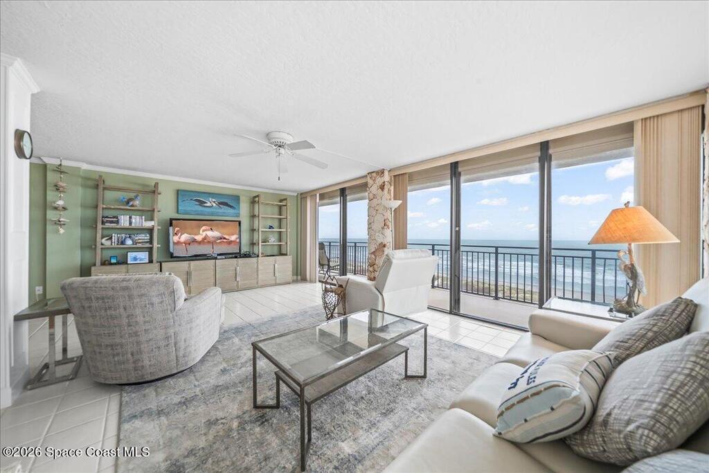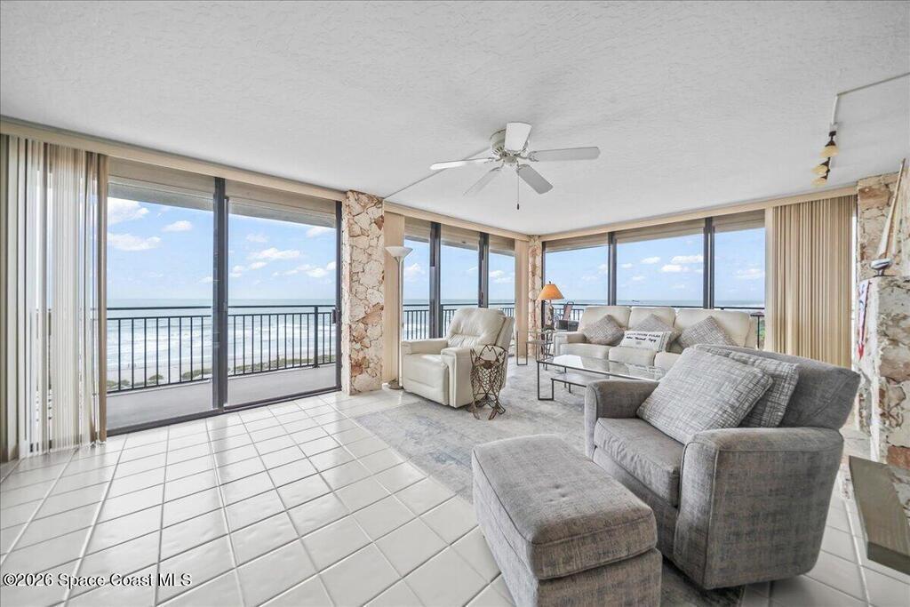 Incredible panoramic Ocean Views from this SE Corner 2 bedroom 2 bath Condo. Includes all new furnishings, and garage. Large wrap around private balcony to watch sunrises over the Ocean , sunsets over the river and Rocket Launches! Complex boast heated pool, private beach access, club house, tennis court and exercise room. Great location close to shopping and restaurants. Easy commute to Orlando Airport. Theme Parks, Kennedy Space Center, and Cape Canaveral Port ,