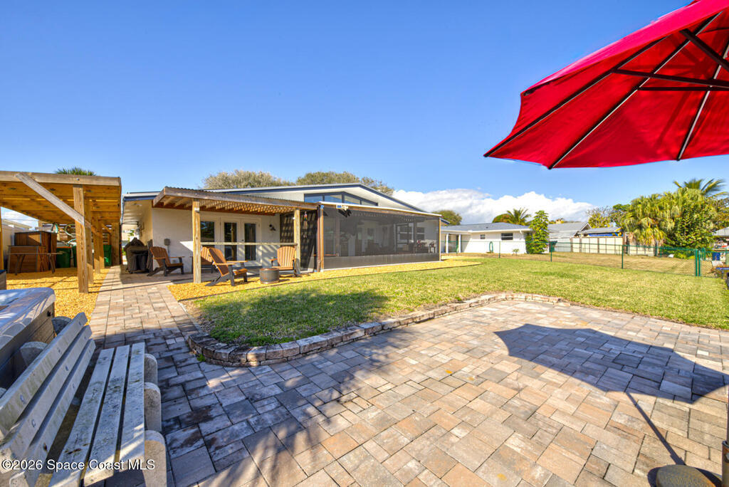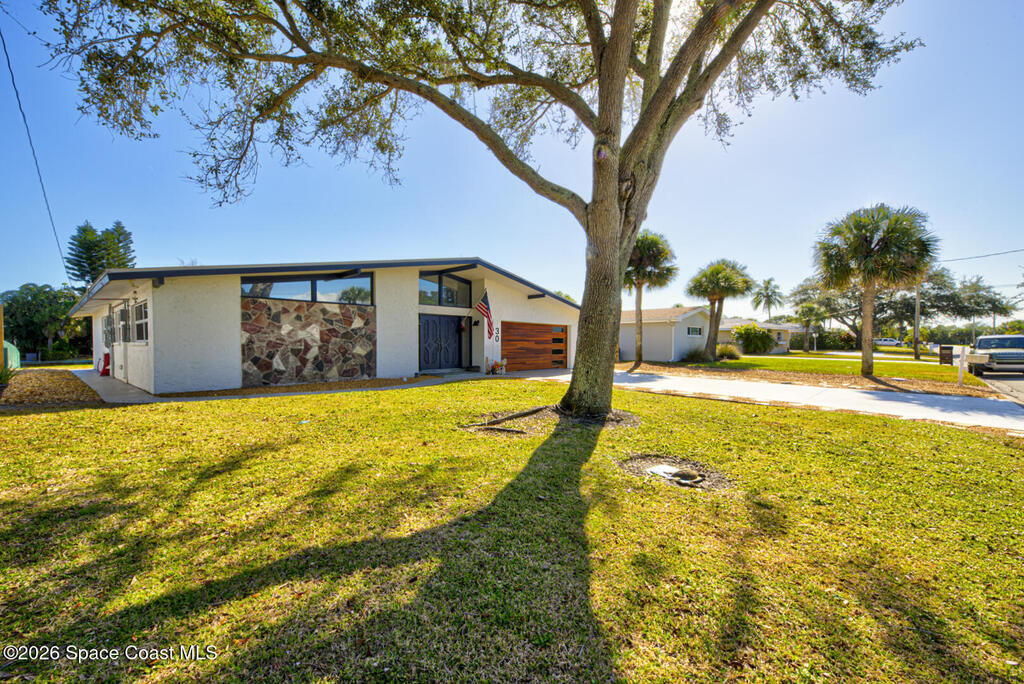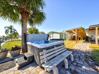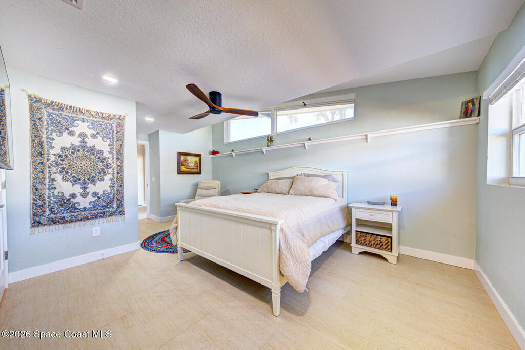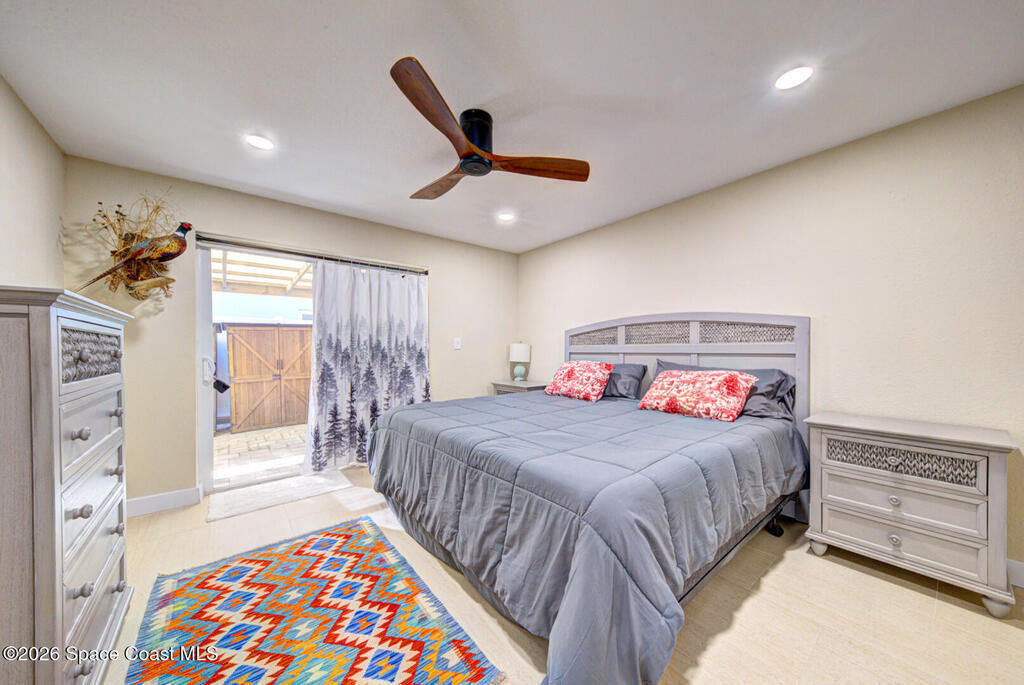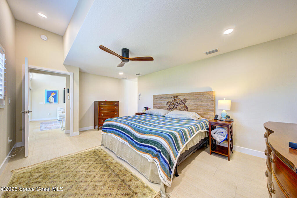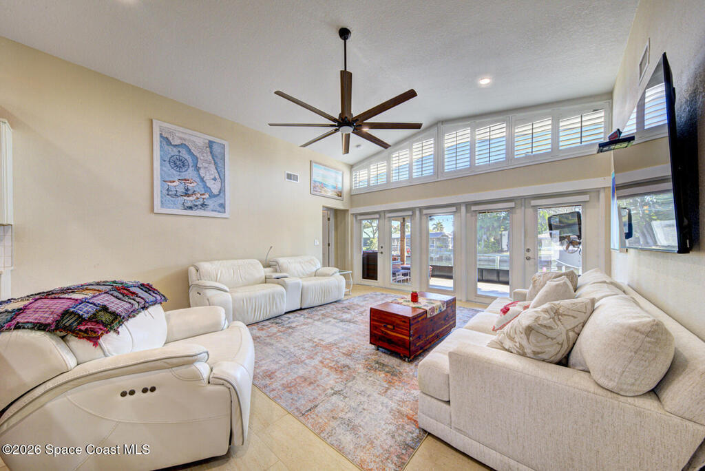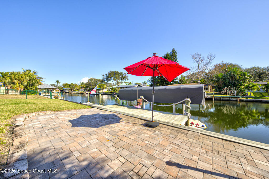 Luxury canal-front living in desirable Surfside neighborhood of Cocoa Beach--NO HOA. This beautifully designed 4-bedroom, 3-bath home features double-primary suites and direct access to a waterfront lifestyle with private floating dock. The open floor plan is filled with natural light and seamless indoor-outdoor flow. The kitchen, dining, and great room connect effortlessly, offering tranquil water views. The kitchen boasts SS appliances, abundant cabinetry, ample counter space, and recessed lighting. Elegant tile flooring imported from Ukraine runs throughout, complemented by plantation shutters and hurricane-rated windows, doors, and garage door. Primary suite provides a retreat with a spa-like bath, double-sink vanity, shower, and soaker tub. Highlights include epoxy-coated driveway and garage with extensive storage, solar panels producing approx. 3, 000 kWh/month. A fenced backyard, screened patio, pergola, garden arbor, hot tub are perfect for boating and year-round enjoyment.