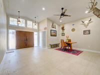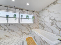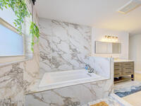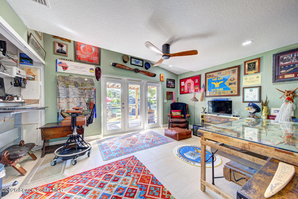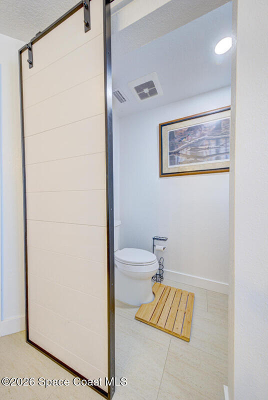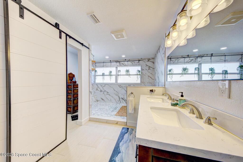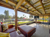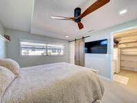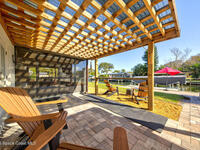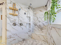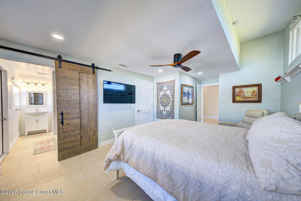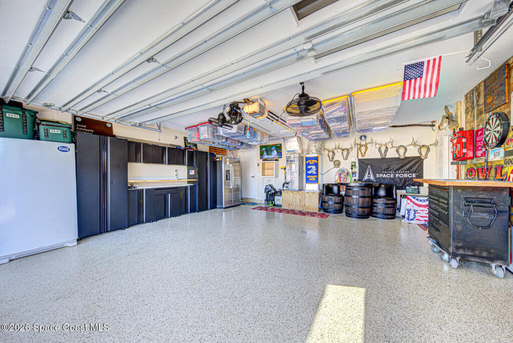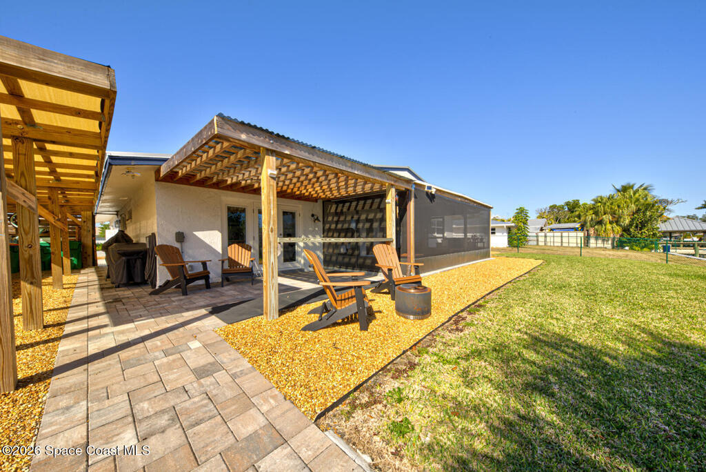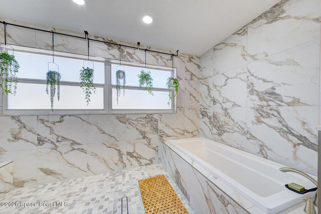 Luxury canal-front living in desirable Surfside neighborhood of Cocoa Beach--NO HOA. This beautifully designed 4-bedroom, 3-bath home features double-primary suites and direct access to a waterfront lifestyle with private floating dock. The open floor plan is filled with natural light and seamless indoor-outdoor flow. The kitchen, dining, and great room connect effortlessly, offering tranquil water views. The kitchen boasts SS appliances, abundant cabinetry, ample counter space, and recessed lighting. Elegant tile flooring imported from Ukraine runs throughout, complemented by plantation shutters and hurricane-rated windows, doors, and garage door. Primary suite provides a retreat with a spa-like bath, double-sink vanity, shower, and soaker tub. Highlights include epoxy-coated driveway and garage with extensive storage, solar panels producing approx. 3, 000 kWh/month. A fenced backyard, screened patio, pergola, garden arbor, hot tub are perfect for boating and year-round enjoyment.