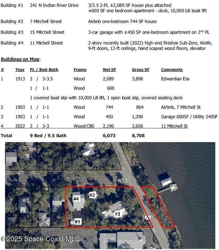 Rare opportunity to own a unique, income-producing waterfront property in Historic Cocoa Village! This Edwardian era fully furnished main house (former B&B) and furnished cottage (thriving Air BnB) sit on 133' of Indian River frontage with dock and 10, 000 lb. boat lift. A stunning 2 level 2022 built home with elevator features a gourmet kitchen with Wolf gas range, Miele coffee maker, wine bar, brick accents, hand-scraped hardwood floors, and gorgeous views. Three spacious bedrooms and baths provide modern comforts. Property also includes a 3-car garage, utility room for tenants and a 1 bedroom apt above with patio and garden planters. All furniture in three buildings conveys, along with three active leases. Walk to Cocoa Village, watch rocket launches, walk, bike and run along the Indian River. Ideal for investors or multi-generational living!