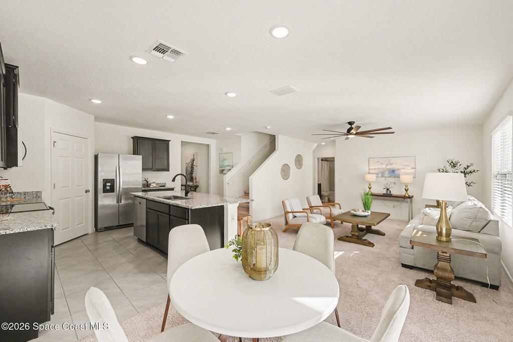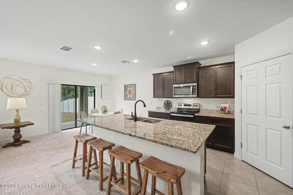 Spacious 5-bedroom, 3-bath, two-story contemporary home offers room to grow & flexible living spaces throughout. A versatile flex room on the first floor can serve as a home office, playroom, formal dining area, or secondary living space. The open floor plan features a dedicated dining area, large kitchen island, & stainless steel appliances, perfect for everyday living & entertaining. A first-floor bedroom provides convenience & privacy. Upstairs, the primary suite includes a walk-in shower & double sinks, along with 3 additional bedrooms that share a hall bath, a large bonus room, & a second-floor laundry room. Enjoy a fully fenced backyard with preserve views from the patio. Seller-owned & PAID IN FULL solar panels add efficiency. Major updates include roof (2023), HVAC (2023), water heater (2023), & solar panels (2024). Community amenities include a pool, playground, sidewalks, & walking trails. Plenty of space to stretch out and make this home your own.