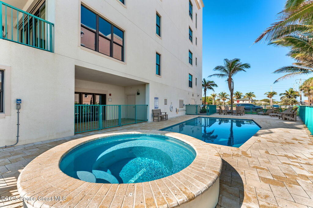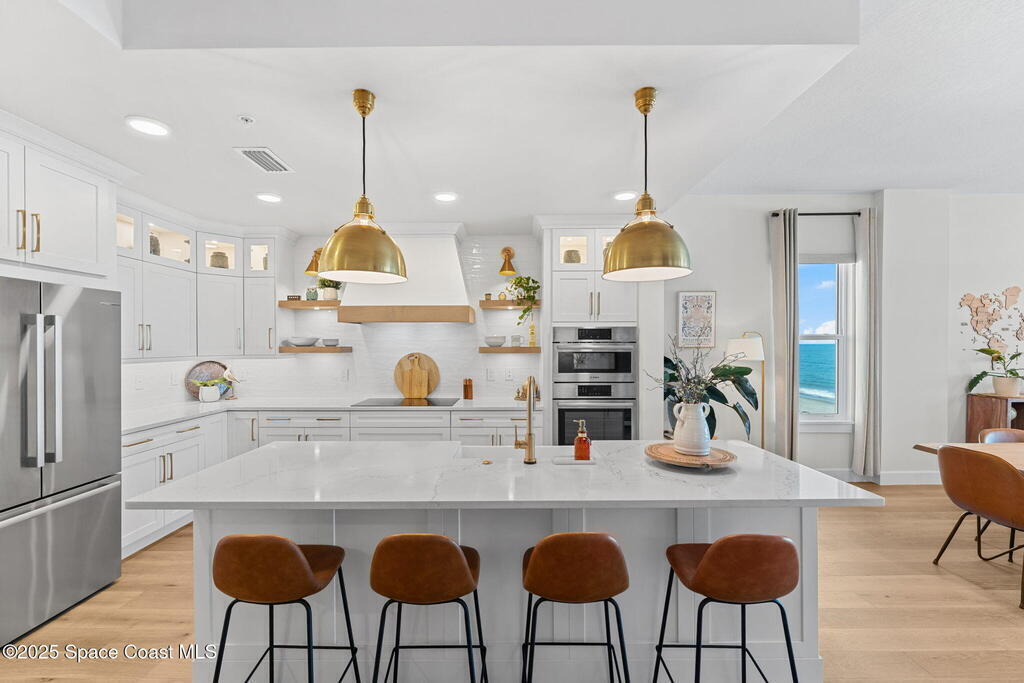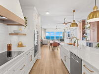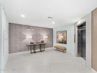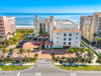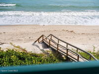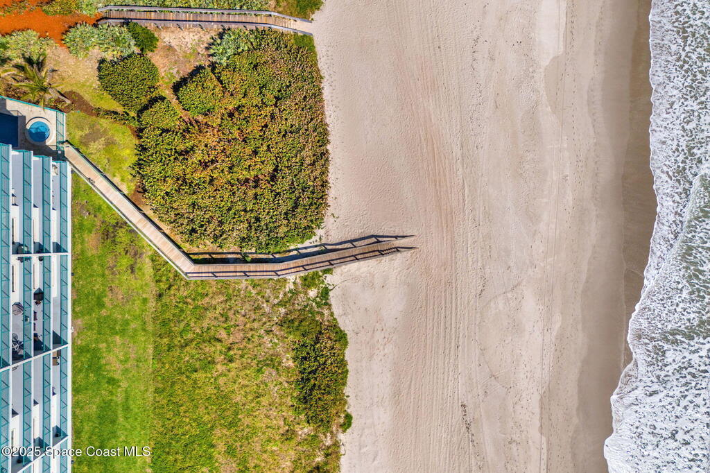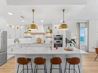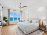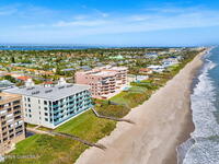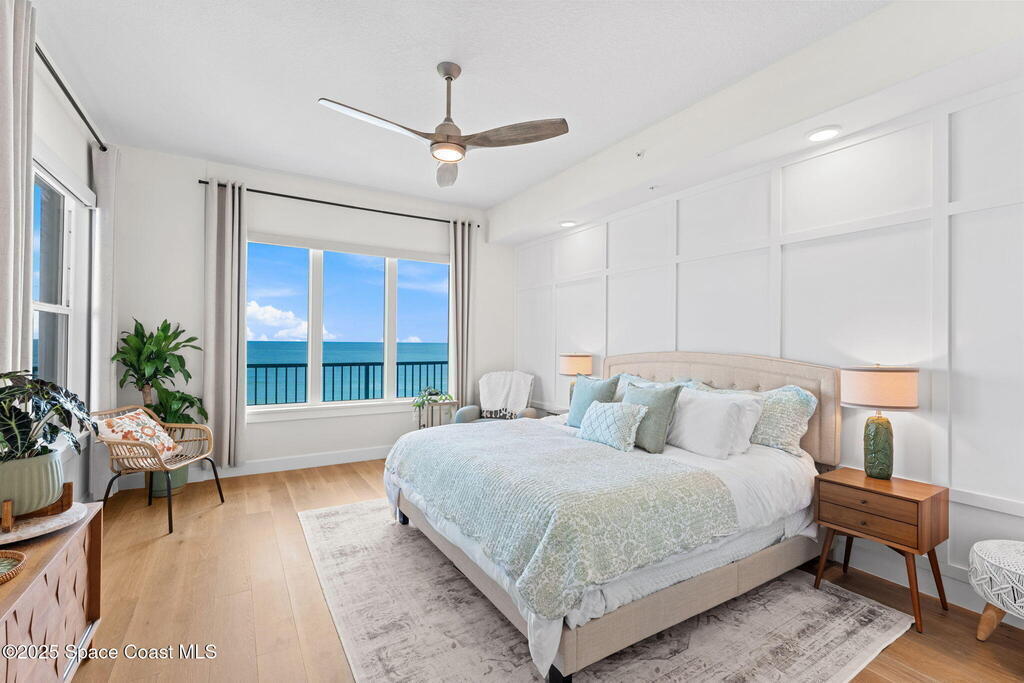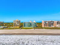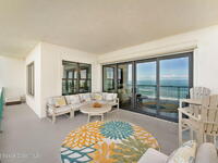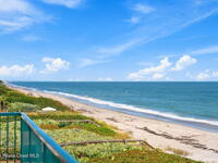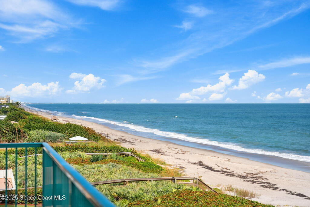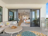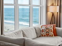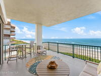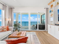 Built in 2022, this NE-corner condo delivers a modern beachfront lifestyle with unobstructed views of the ocean & rocket launches. Elevated 10' ceilings & floor-to-ceiling glass frame the horizon, while sliding doors open to a nearly 300 sq ft terrace that blurs the line between indoors & out. High-end finishes define every space, from custom cabinetry, quartz counters & stainless appliances in the kitchen to the custom bar/buffet at dining, built-in media center, window treatments & closet systems. Impact-rated glass, 1 3/4 solid core interior doors & concrete block walls provide peace of mind, complemented by fire sprinkler protection for safety. Community amenities elevate every day with a clubhouse, fitness facility, heated pool, hot tub & putting green. Blending sleek style with coastal ease, this residence is designed for both comfort & connection, offering an unmatched opportunity to embrace oceanfront living at its most effortless.