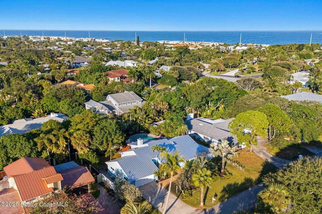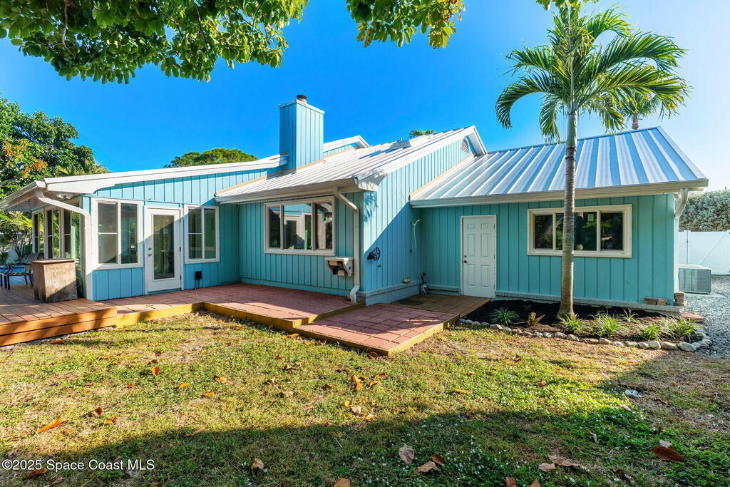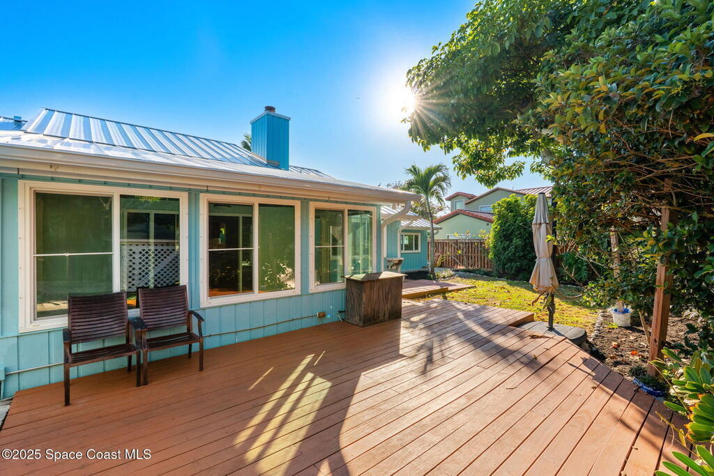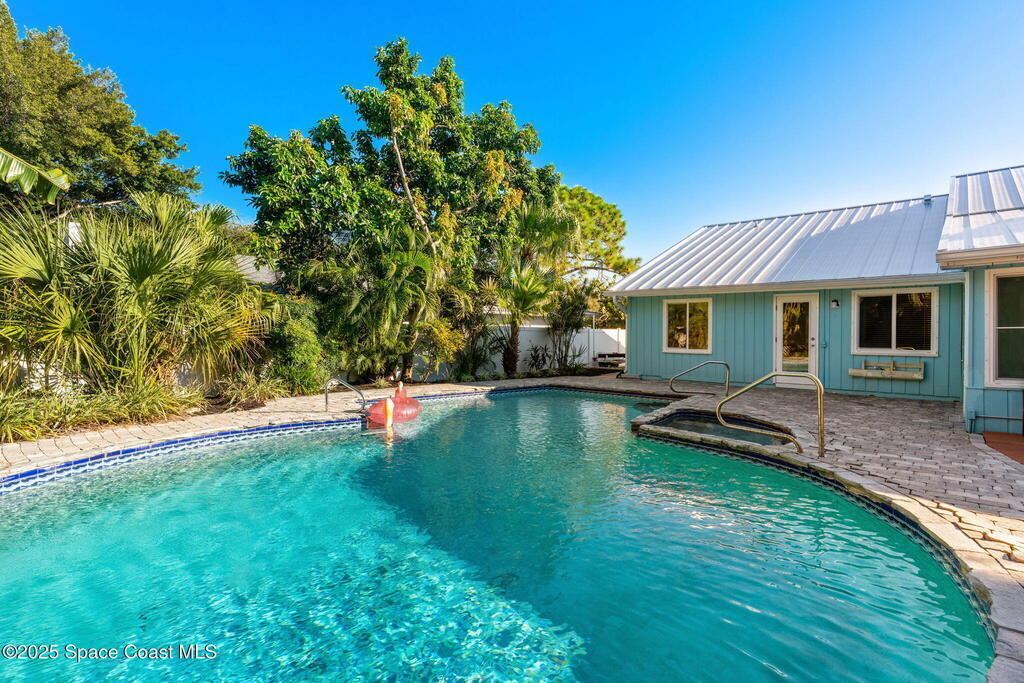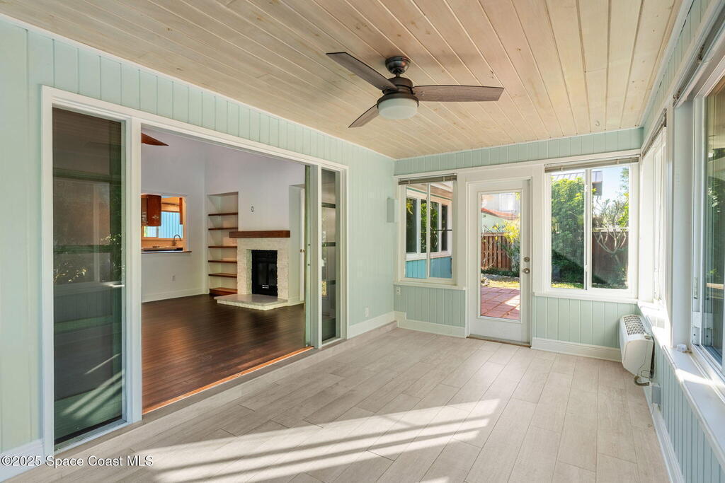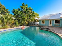 Nestled South of Fifth Ave and just one block from the beach, this blissful beachside cottage features a brand-new standing seam metal roof, impact windows, and a private backyard pool retreat surrounded by lush, tropical landscaping. Inside, charm fills every corner with a double-sided fireplace connecting the formal dining and living rooms, with wainscoting accents in the dining, and the living crowned by a vaulted tongue-and-groove ceiling and warm wood beams. The cozy kitchen offers wood cabinetry, quartz countertops, a double oven, and a built-in breakfast nook. Take your coffee in the Florida room, or relax in your fully fenced private paradise with a poolside deck perfect for unwinding. An indoor laundry room, half bath, and ample storage embody life's simple luxuries and everyday convenience, while the generous, oversized garage is ideal for storing surfboards, beach gear, a golf cart and more. Minutes to dining, shopping, the beach and Orlando Park for easy coastal living.