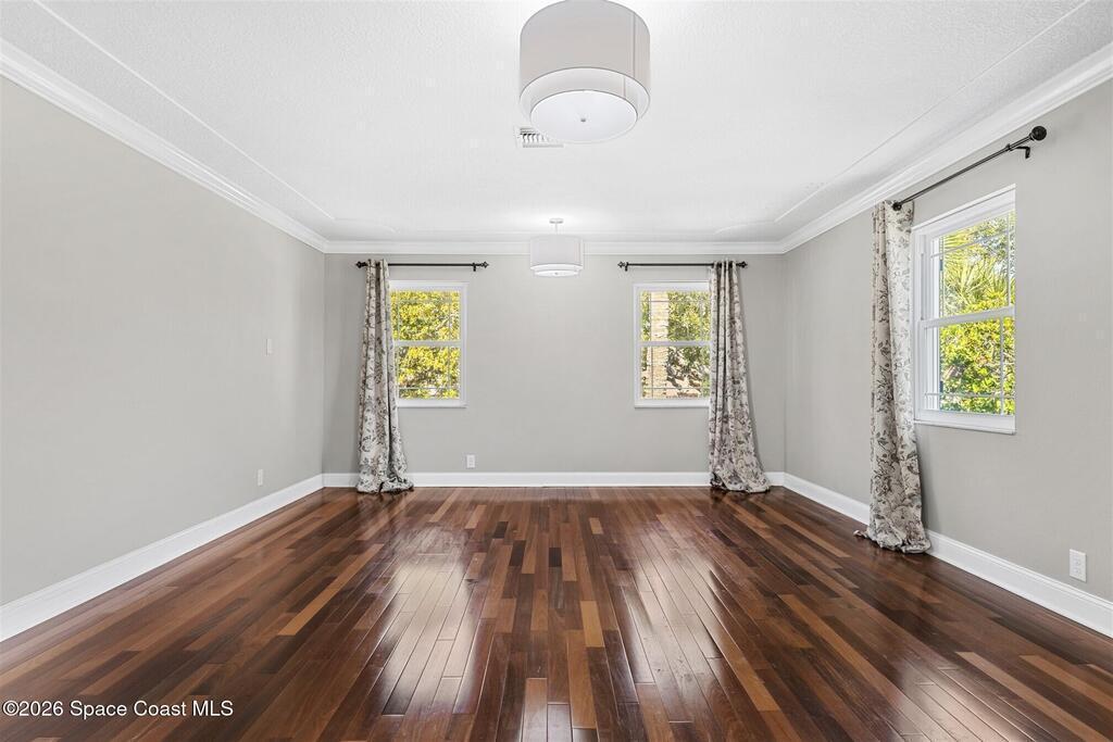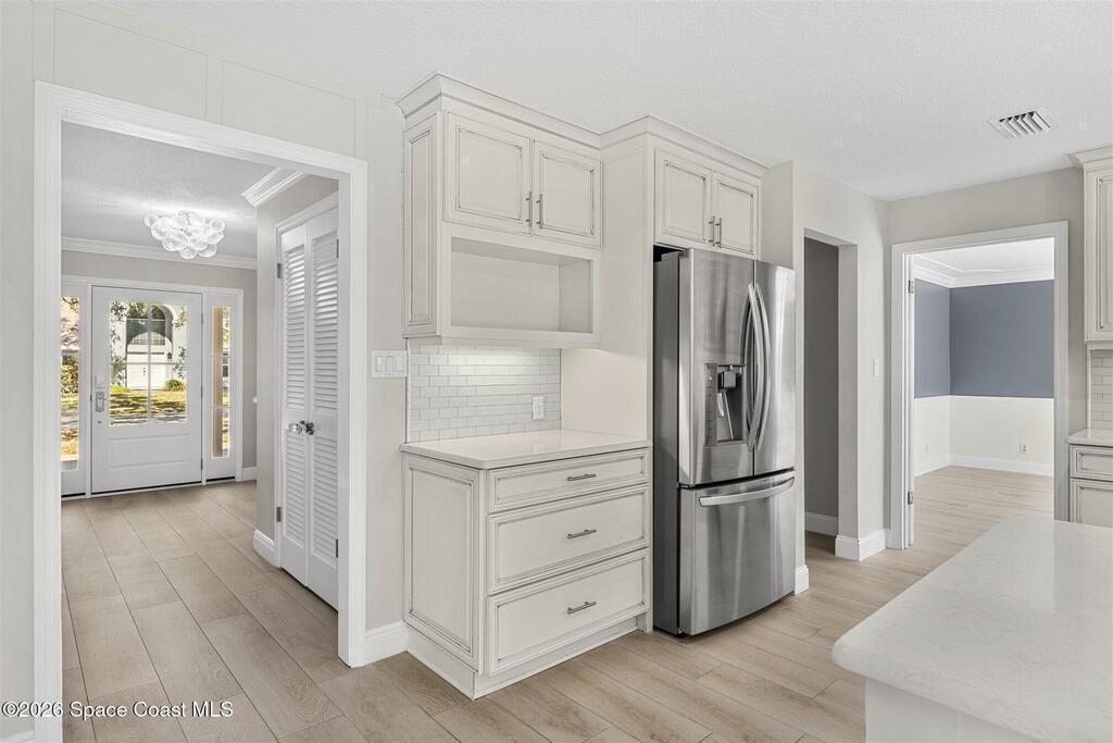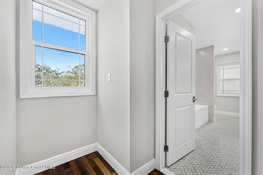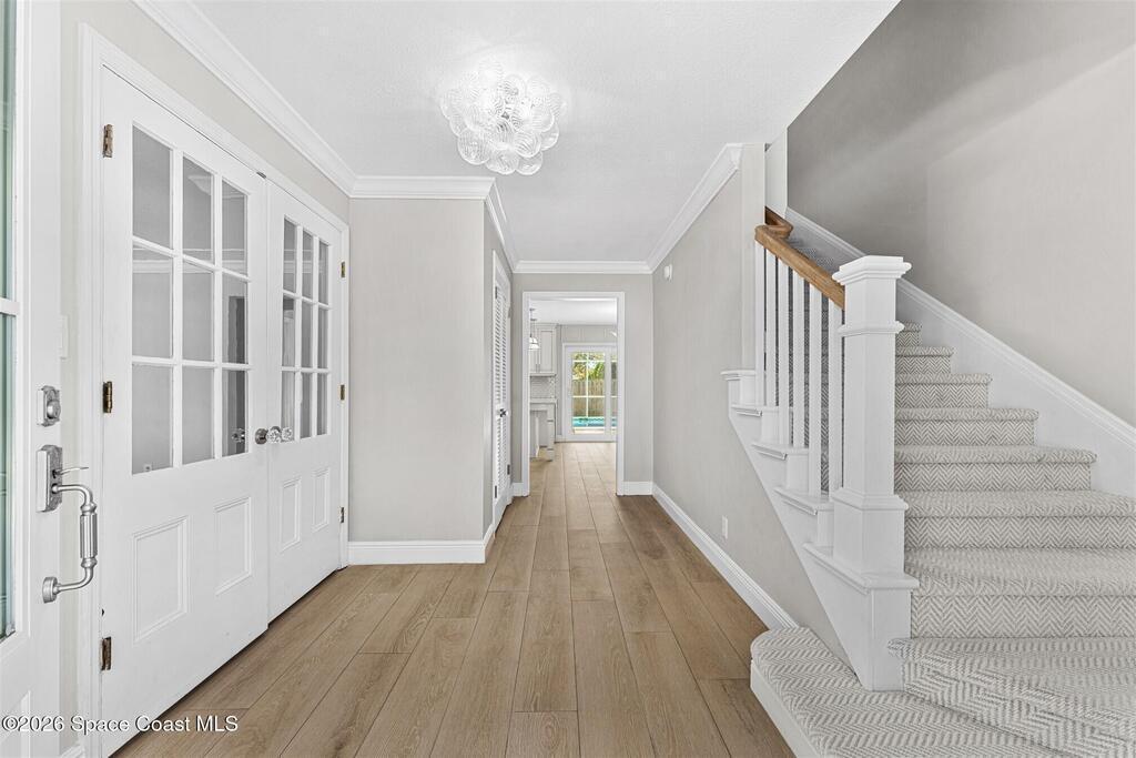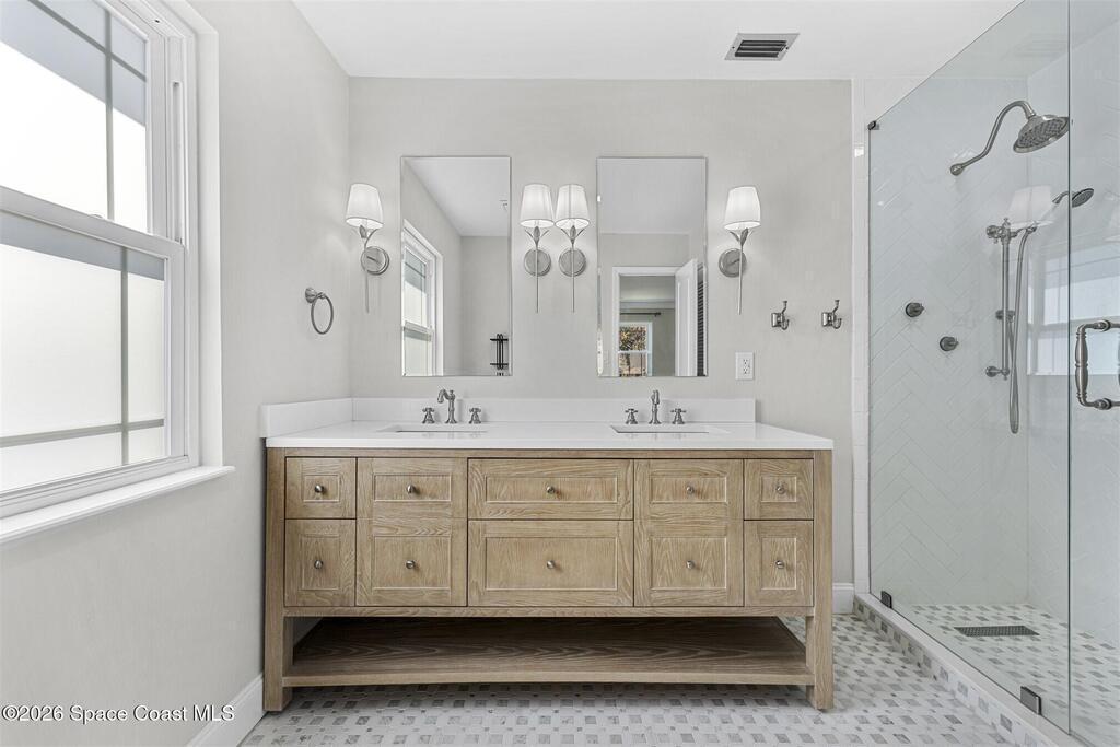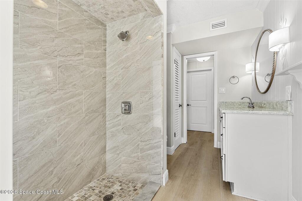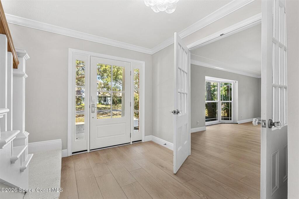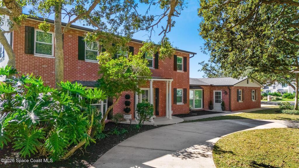 Remodeled in 2025 with impact windows, new 1st floor owner's suite, roof new in 2020, acs 2021 and 2025! Enjoy crisp river breezes in Indialantic in this gorgeous traditional concrete block house featuring 4 beds and 4 baths (2 owner suites) on a large corner lot. Stately oaks grace the grounds and a circular drive allows for guest parking. Neutral plank tile throughout the first floor reflects the feeling of sand beneath your feet. The charming contemporary kitchen includes a breakfast bar, ample cabinetry, a stylish tile backsplash, and stainless steel appliances. Nearby, a spacious living and dining room offer the perfect space for entertaining, and the huge family room features a cozy fireplace. A dedicated office makes the perfect area for a WFH setup, home gym, or studio. The stunning new owners' suite on the first floor offers a spa-like bathroom with a soaking tub, frameless shower, and large walk-in closet. Step outside to find a huge, fenced backyard where you can ''SEE MORE