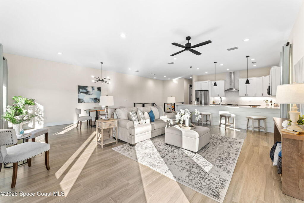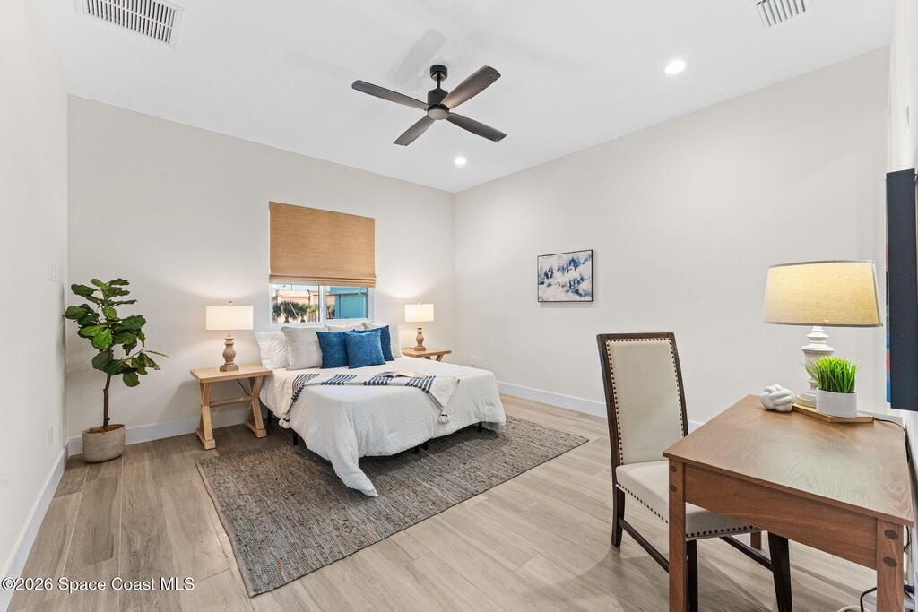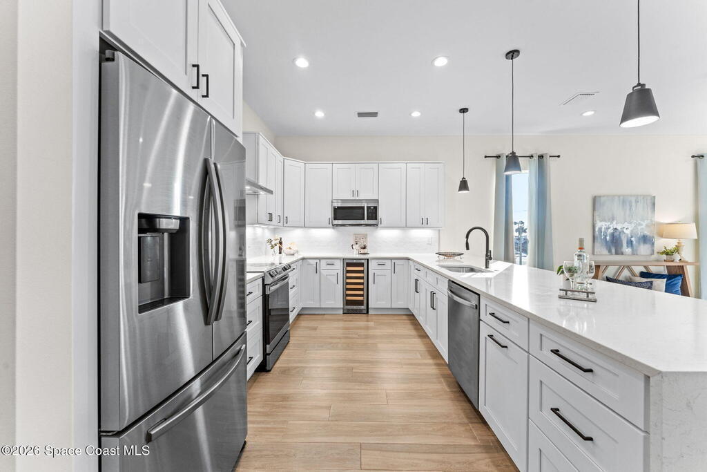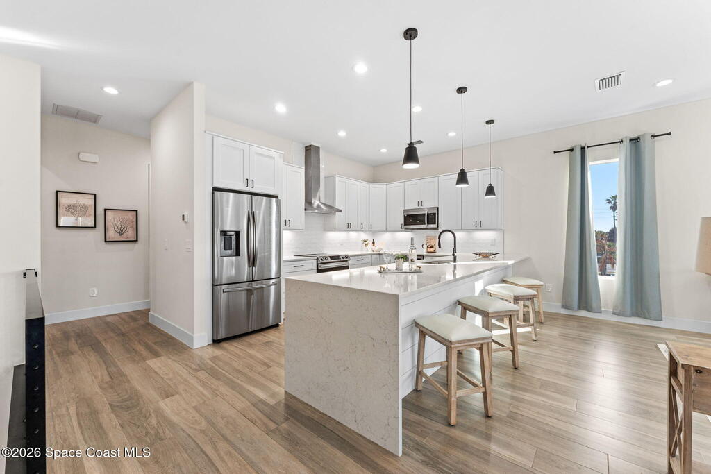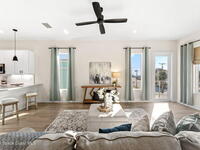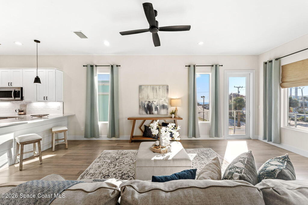 Wake up to ocean breezes and unwind with sunset views from your wraparound balcony in this beachside stunner just moments from the sand. This 3 bedroom, 2.5 bath home delivers an airy open floorplan with split bedrooms and sleek tile flowing throughout. The kitchen is designed to impress with crisp white quartz countertops, a bar refrigerator/wine cooler, and effortless flow for entertaining. Impact windows, a smart thermostat, and an upgraded smart garage bring peace of mind and modern convenience. Step outside to a private courtyard retreat featuring custom pavers and professionally installed artificial turf with bubble sprinklers for easy care and year-round beauty. Inside, custom luxury drapes and shades elevate every space. All just minutes from beach access, great dining, markets, and shopping. A rare blend of style, comfort, and location that truly stands out.