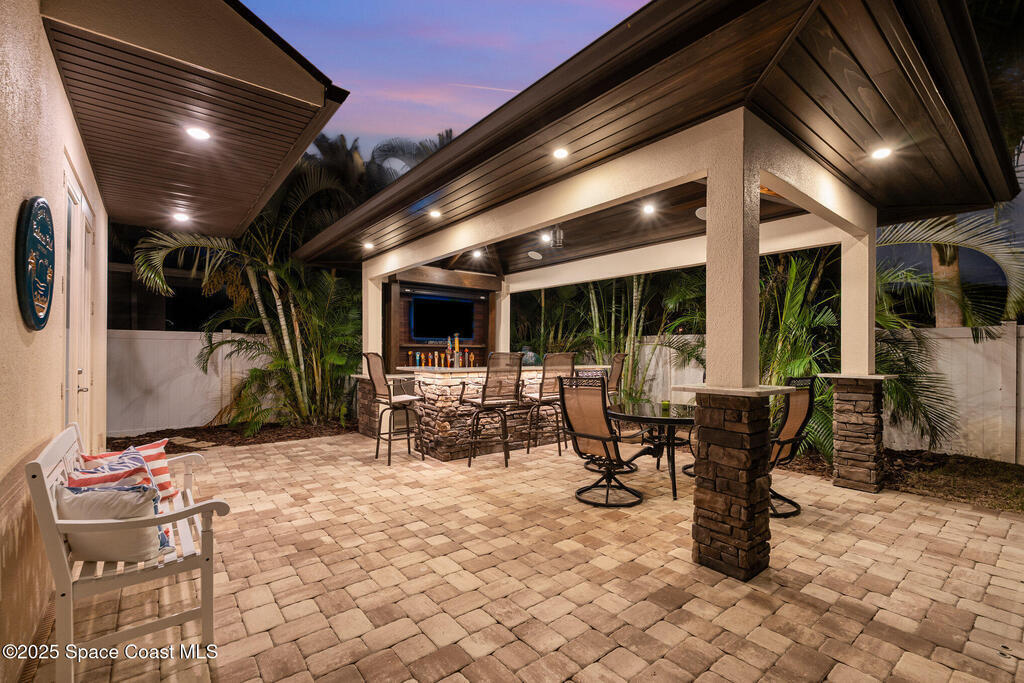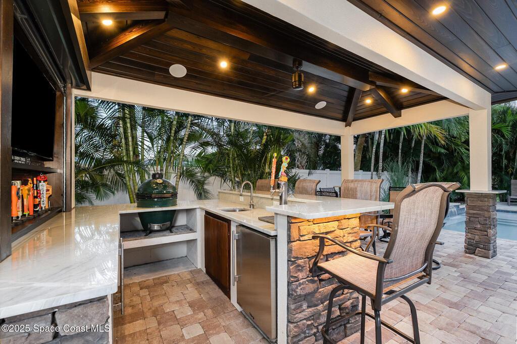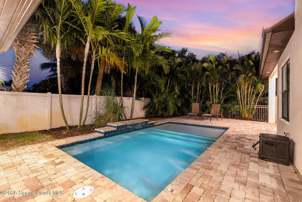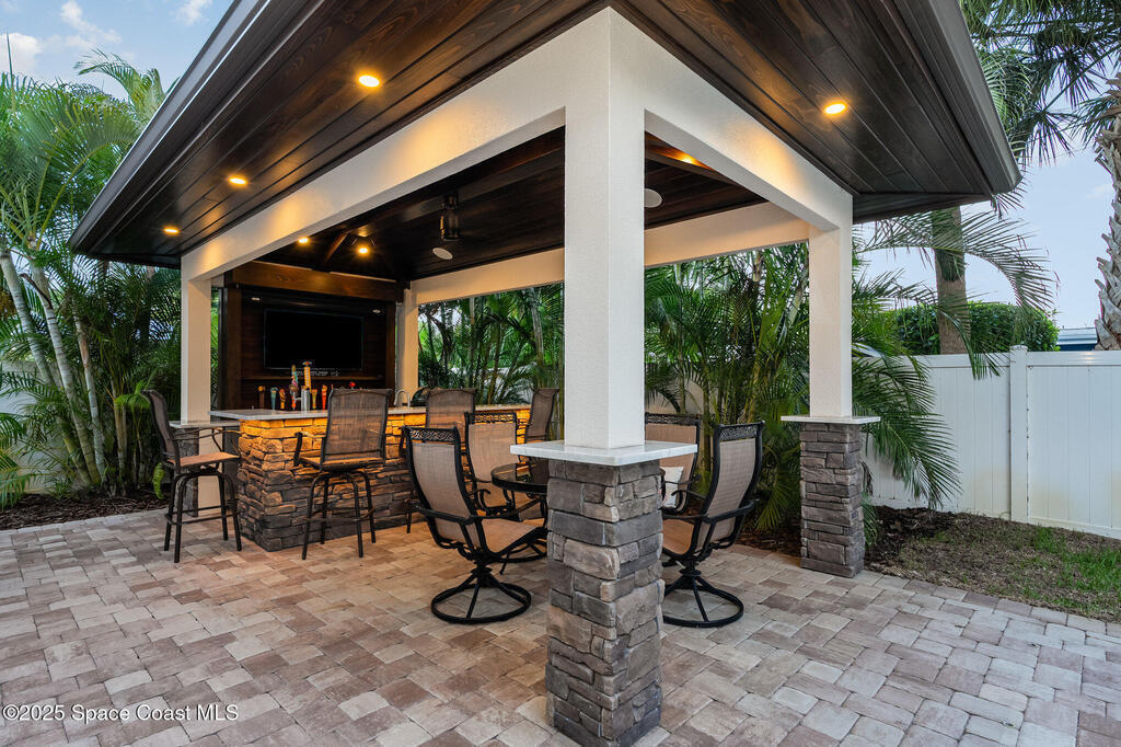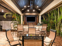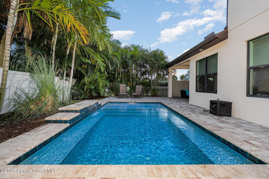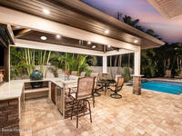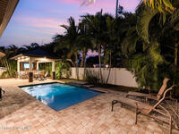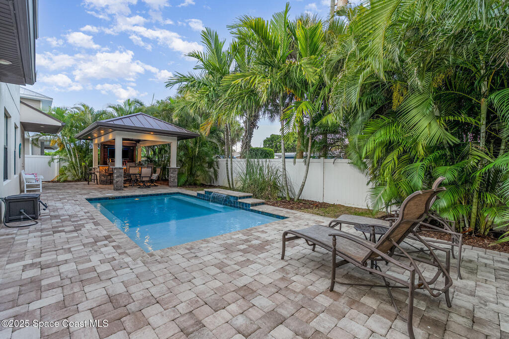 New Price! Reduced $70K! Live the luxury coastal vibe with the beach only 5 blocks away. Newly built pool home in an upscale beachside gated community of the Enclave! Curb appeal begins with the paver driveway, modern architecture, metal roof, & new CBS construction in 2019. The owners added a tropical poolside retreat with a new inground pool, waterfall and baja shelf. The pool is also a gas heated spa, but the star of the exterior is the high-end cabana complete with a custom TV cabinet with rolldown hurricane shutters, wood cypress ceiling, pocket lights, and surround sound. Entertain and grill on Green Egg grill at the custom bar with dual bar fridges and kegerator too! A gourmet kitchen with granite counters, island and breakfast bar plus stainless-steel appliances. The first floor has an open floor plan with the primary bedroom and en-suite bathroom plus the 2nd bedroom and bathroom on the main floor. Upstairs is a family room loft, balcony, 2 additional bedrooms and bathroom.