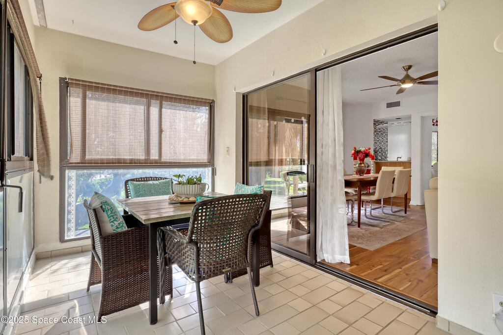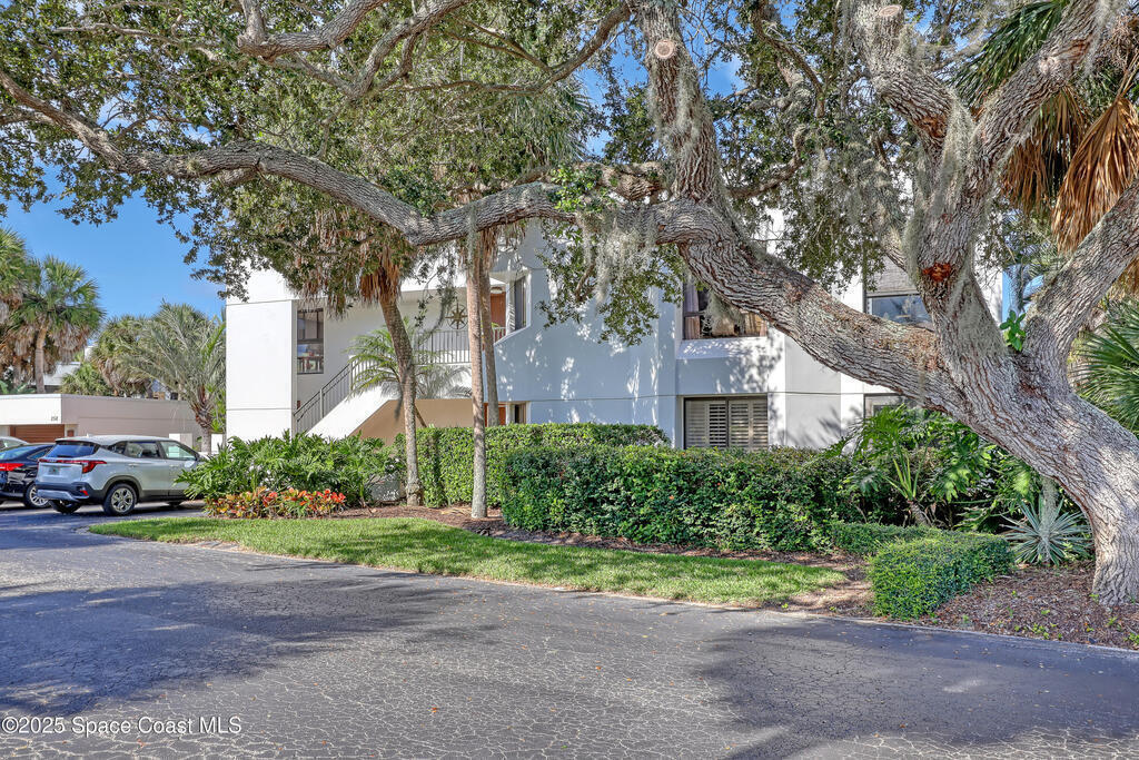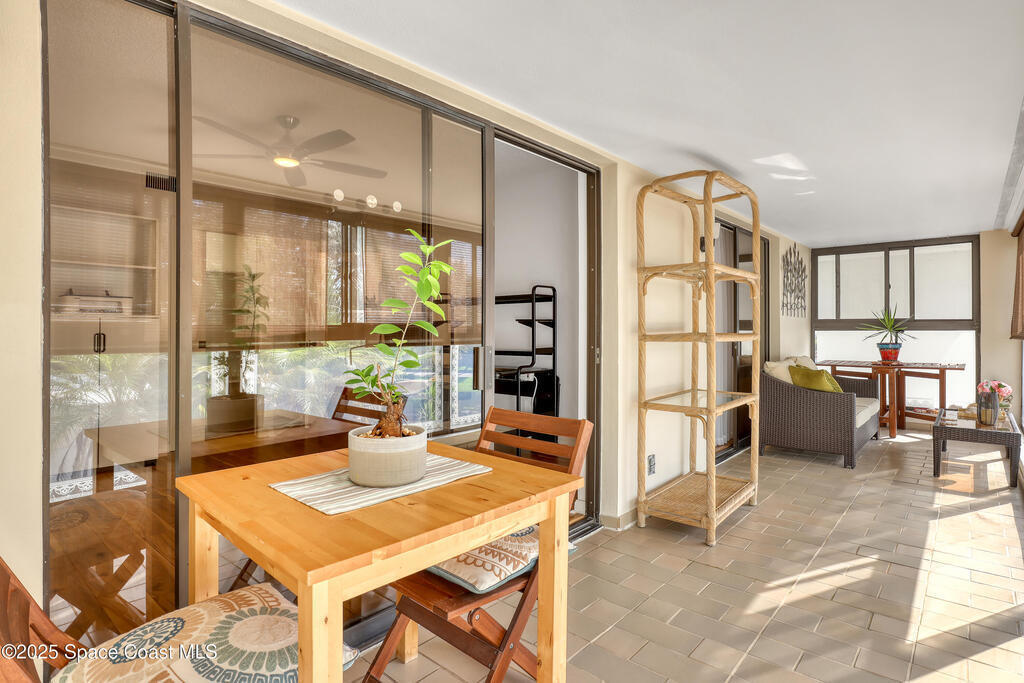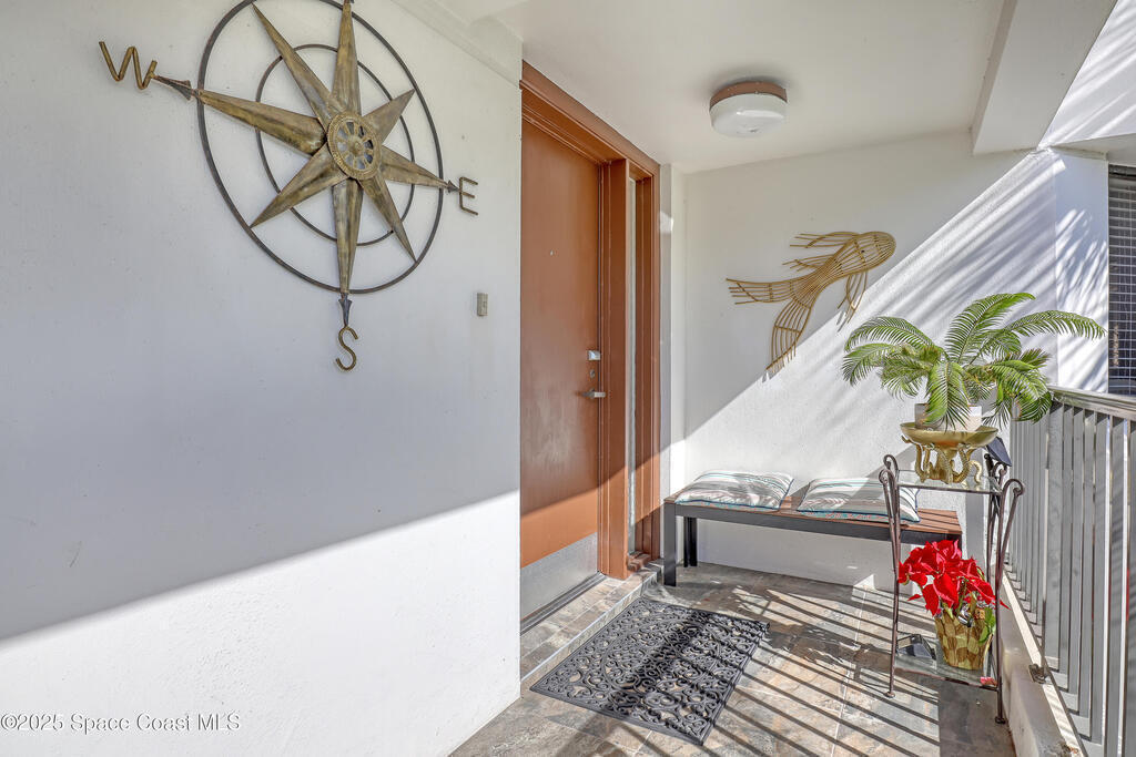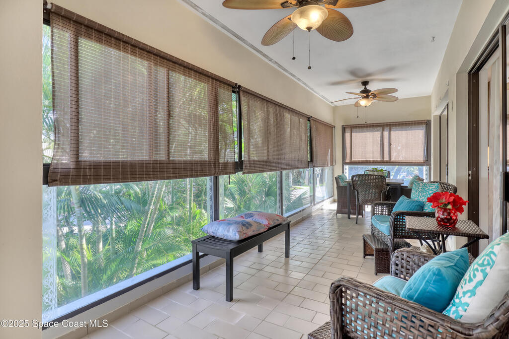 THIS IS NOT YOUR TYPICAL BARRIER ISLAND CONDO LOCATED IN THE MUCH-SOUGHT-AFTER AQUARINA BEACH & COUNTRY CLUB OCEAN-TO RIVER BEACH RESORT COMMUNITY! FULLY FURNISHED with 3 bedrooms, 2 & a half baths, large living room with wood-burning FP, spacious primary suite, walk-in closets, wet bar & wrap-around glassed-in porches offering stunning tropical views from every room. This unit is full of upgrades! New LVP flooring, updated kitchen cabinets with new quartz countertops & new appliances. New paid for roof & community pool! Thoughtfully appointed bohemian-chic decor & modern furniture with everything you need to live your BEST FLORIDA LIFE right here-right down to 3 high-end tvs & orbi wireless mesh network. An extra-long detached garage provides storage for all of your beach toys including the negotiable golf cart. Community amenities include Golf & Tennis clubs with limited play included, Beach Club with private beach access, fitness center, boat launch & fishing dock, restaurant.
