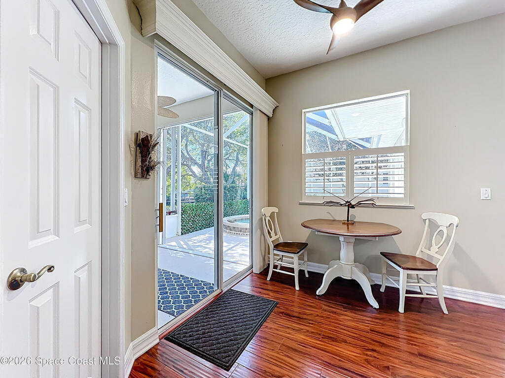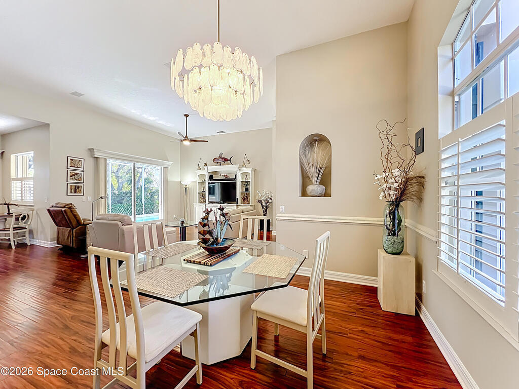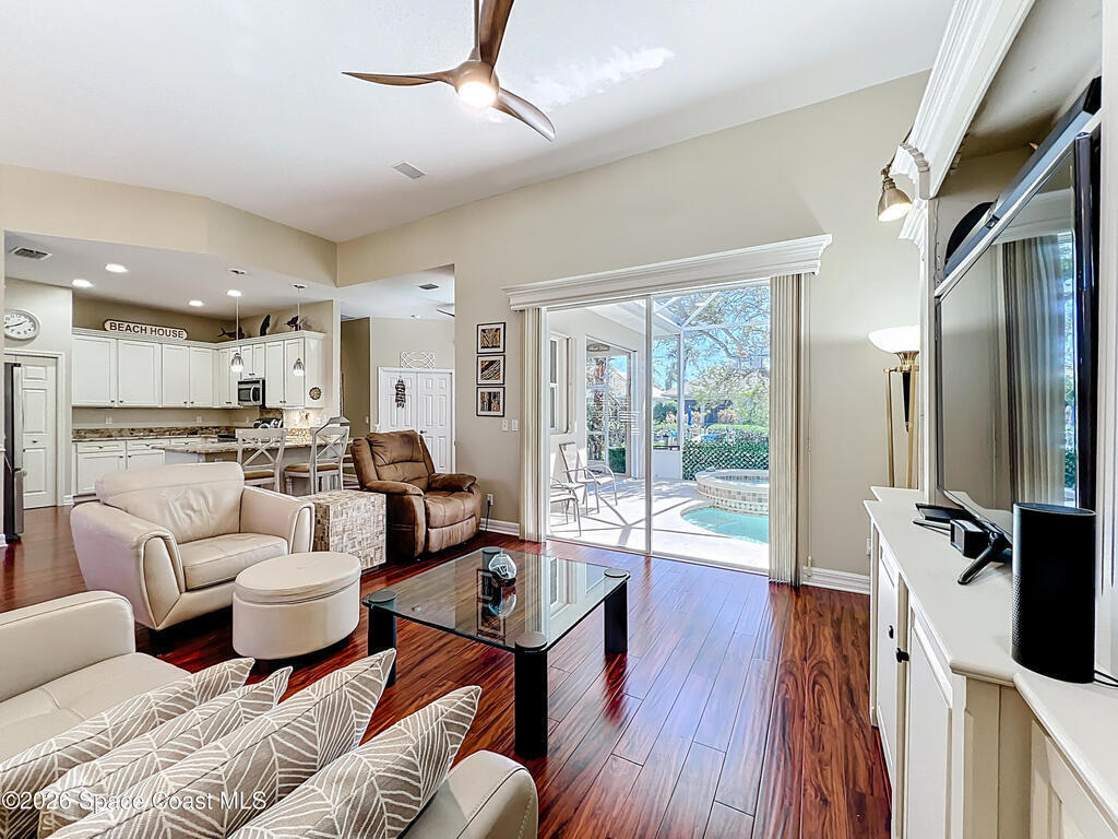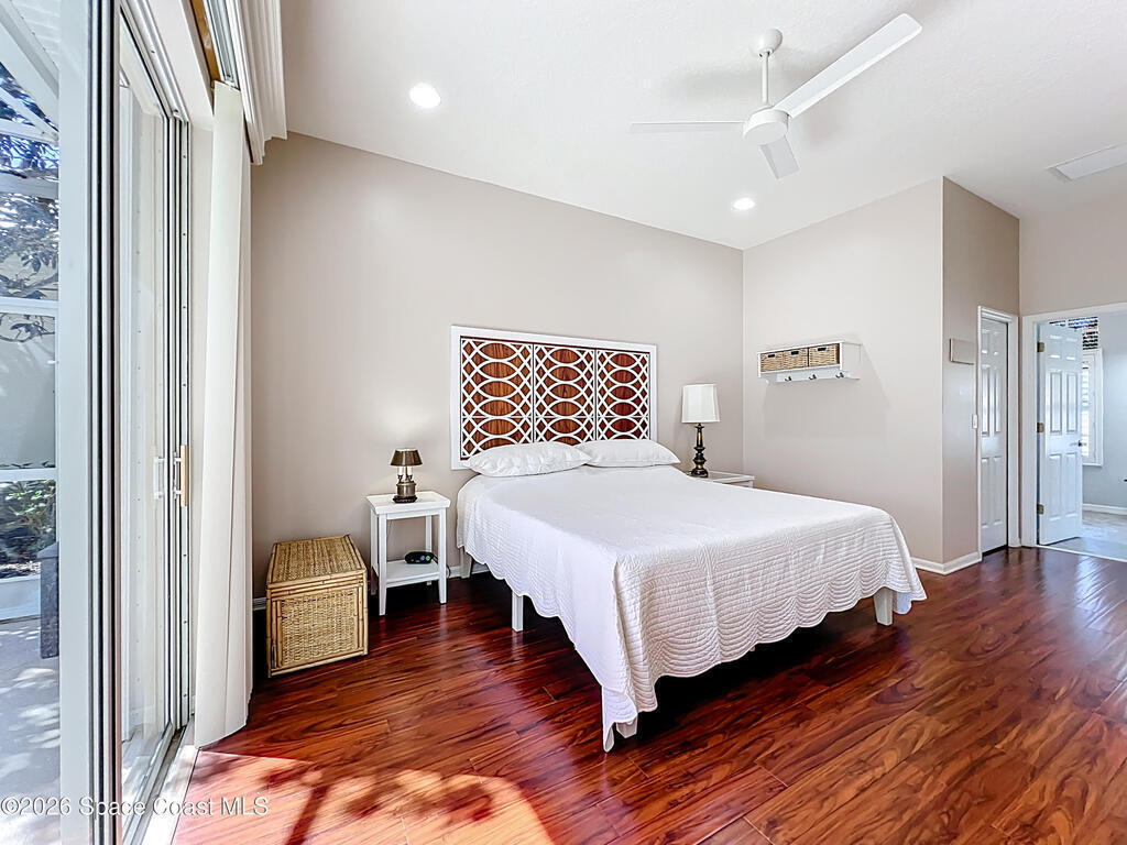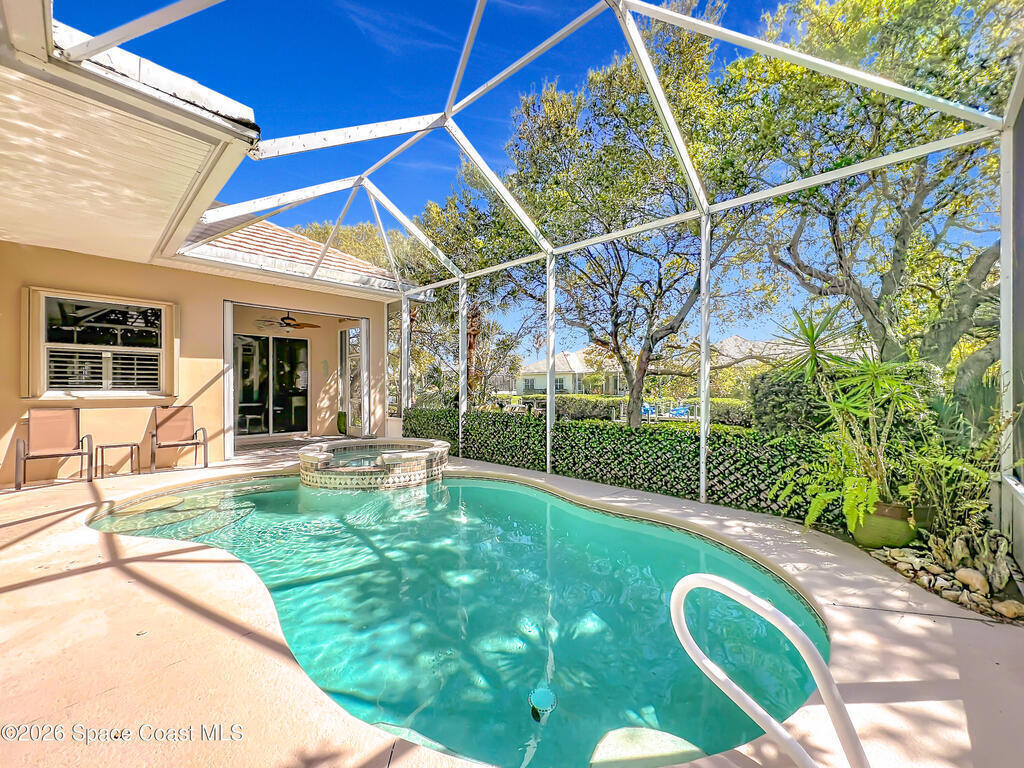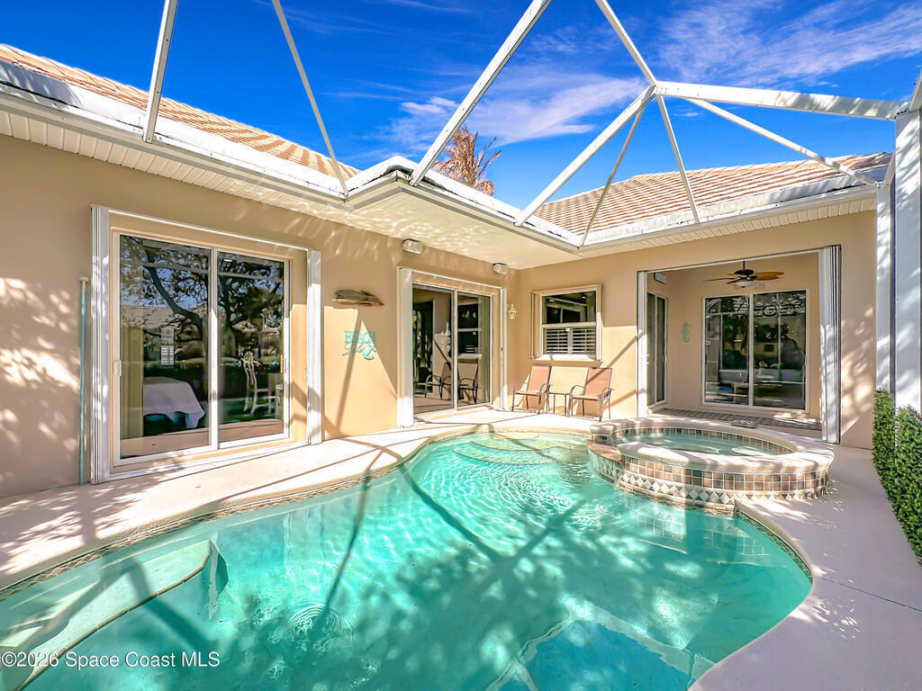 BEACHSIDE PARADISE FOUND! Fantastic 3 bedroom 2 bath 2 car garage waterfront pool home in the beautiful, gated community of Indian Landing. See manatees and dolphins from your private backyard dock, perfect for launching Kayaks and paddleboards for adventure on the Indian river! Truely a boater's paradise, this home includes a rare deeded dry slip for your power boat in the secure boat storage and launch ramp area. Private beach access is just a short stroll away. Beautiful clubhouse, pool, fishing pier and tennis courts make every day a vacation. Home features soaring ceilings, custom cornices, split floorplan, remodeled kitchen and bathrooms, beautiful wood flooring throughout, tropical landscaping that surrounds a private screened pool with spa, recently re planked dock, accordion hurricane shutters. TILE roof is 2005, A/C is 2025. HOA takes care of yard maintenance, pest control and sprinklers. City Sewer, no septic issues to deal with here. Bring your boat and your beach chair