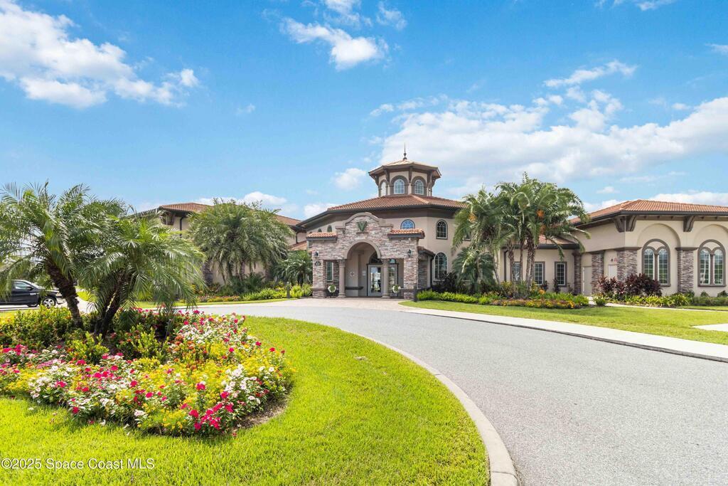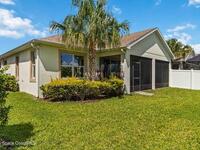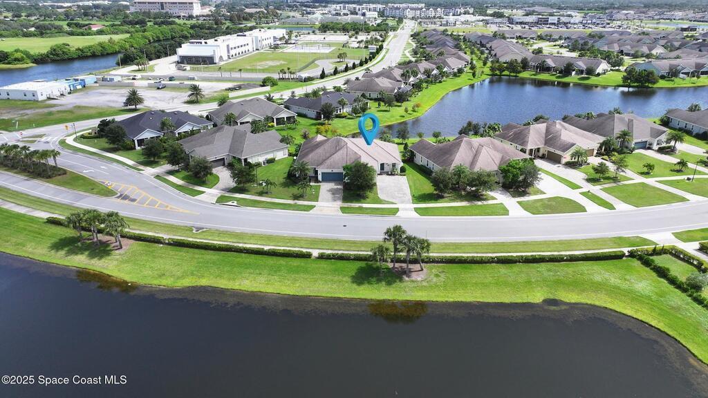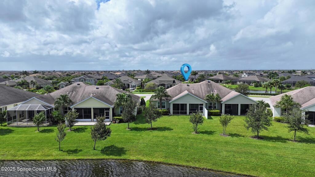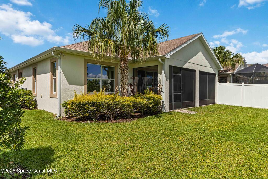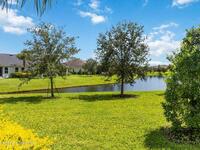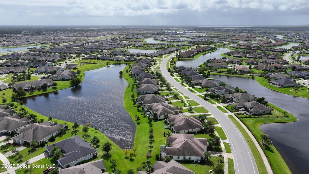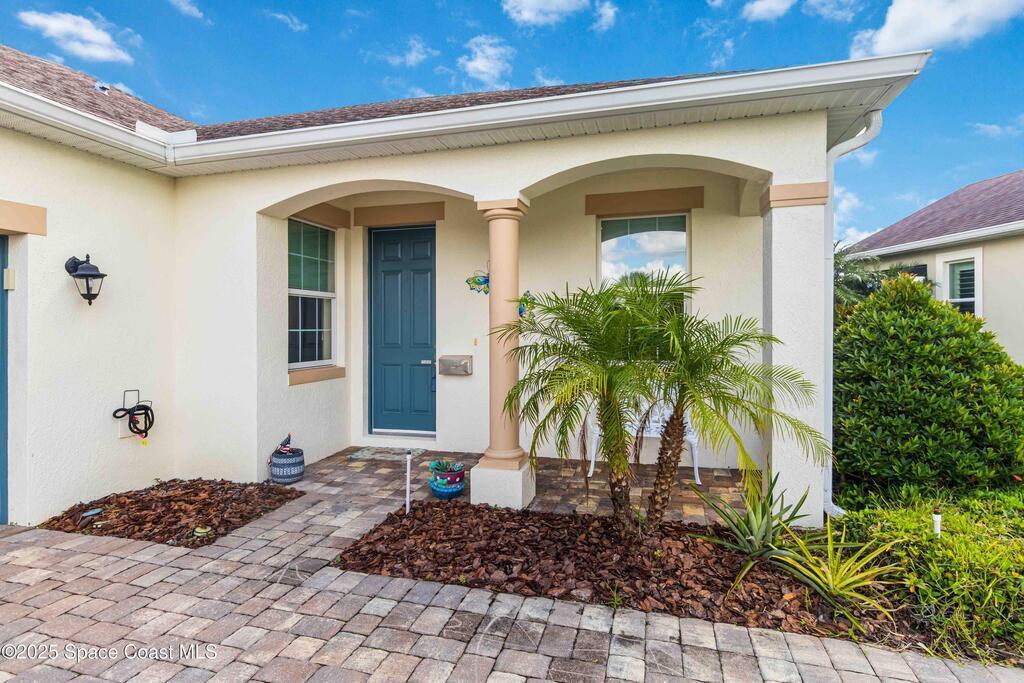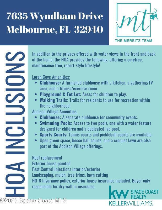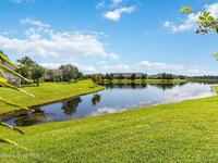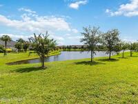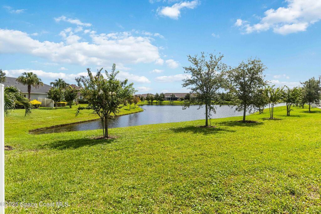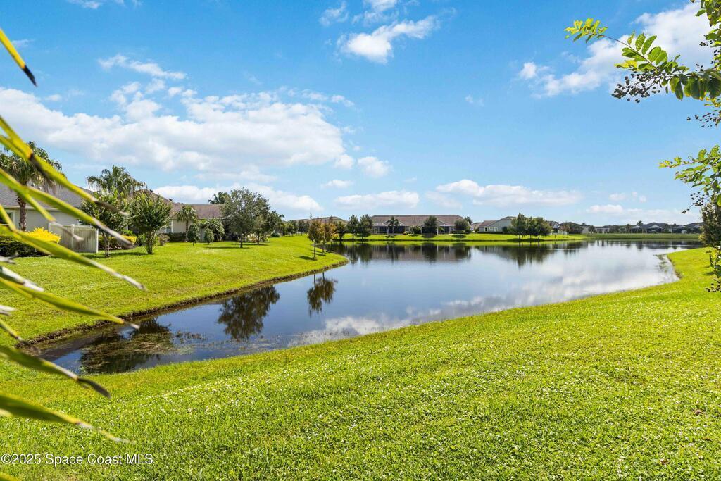 Welcome Home! This thoughtfully designed home offers modern upgrades such as high quality wood-look tile flooring, stylish lighting & crown molding. The open floor plan has 2 bedrooms PLUS office/den & spacious living room that flows seamlessly into the chef-inspired kitchen & dining room. Light & bright kitchen boasts quartz countertops, tile backsplash, pantry, large island/breakfast bar, stainless appliances (including new LG ThinQ fridge), an ideal space for entertaining. Owners suite w/en suite bath features double vanity & walk-in tiled shower. Triple sliders open to the brick paver, screened-in patio w/serene WATER VIEW & large yard. Waterview from front porch provides additional privacy. Living here is truly maintenance free, giving you more time to enjoy the resort-style amenities! This home offers comfort, convenience & community. Conveniently located near shopping, dining, movies, hospital, 20 min to beaches, 40 min to KSC, NASA, SpaceX, Blue Origin, 45 min to Orlando!