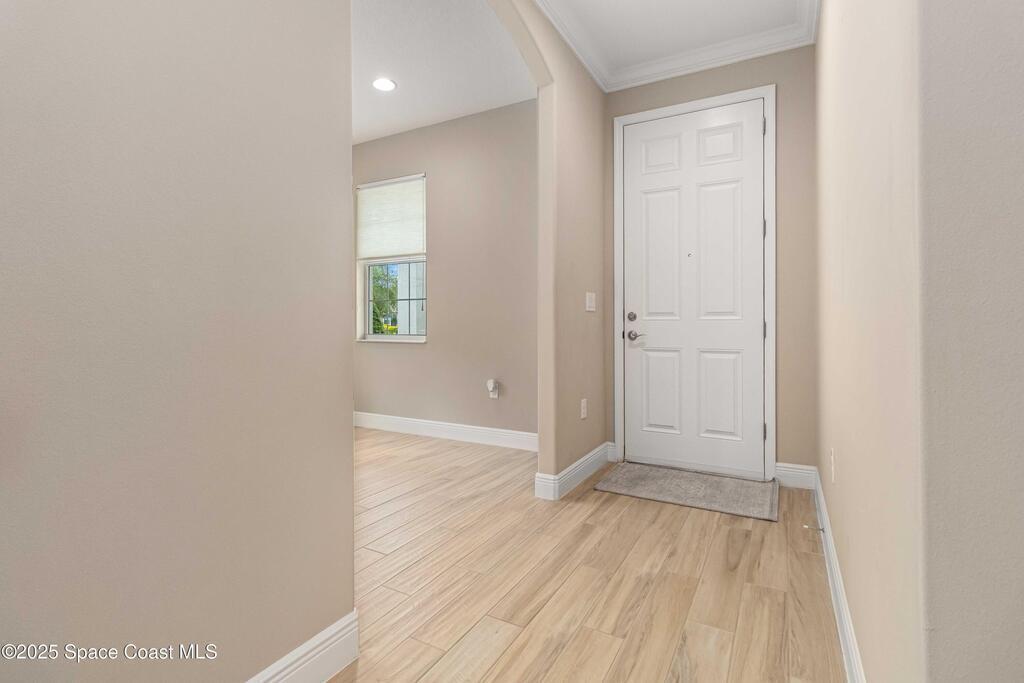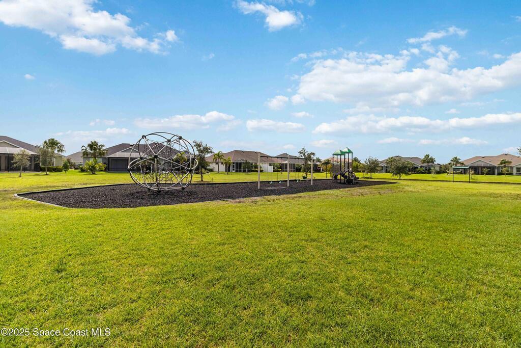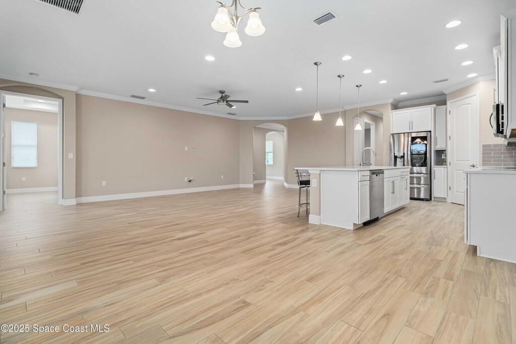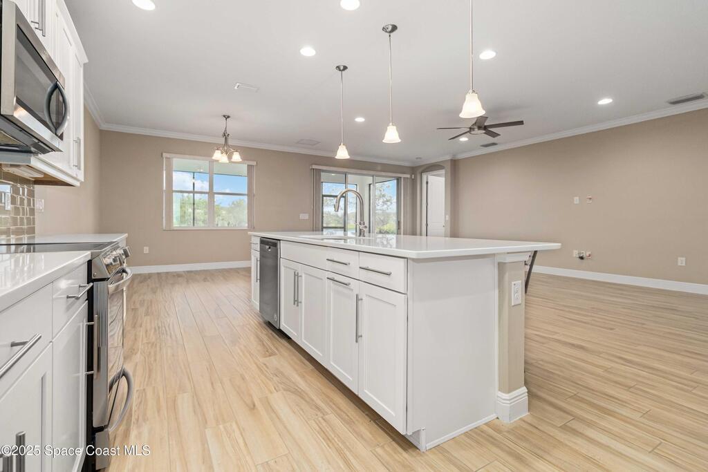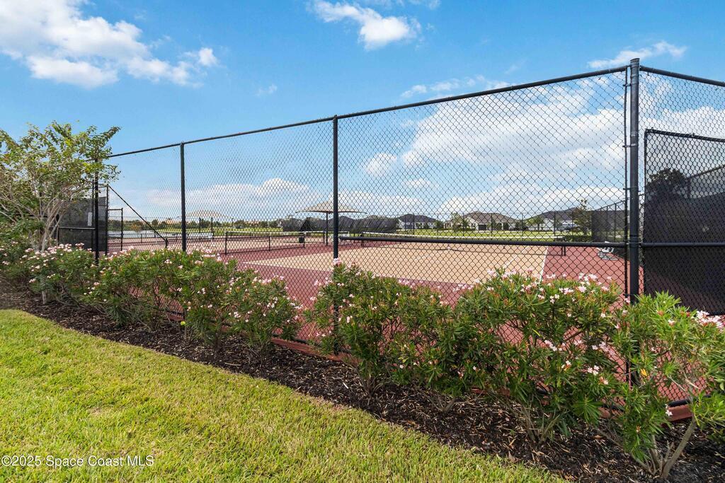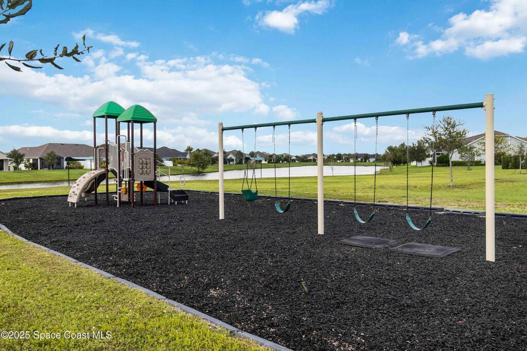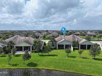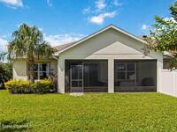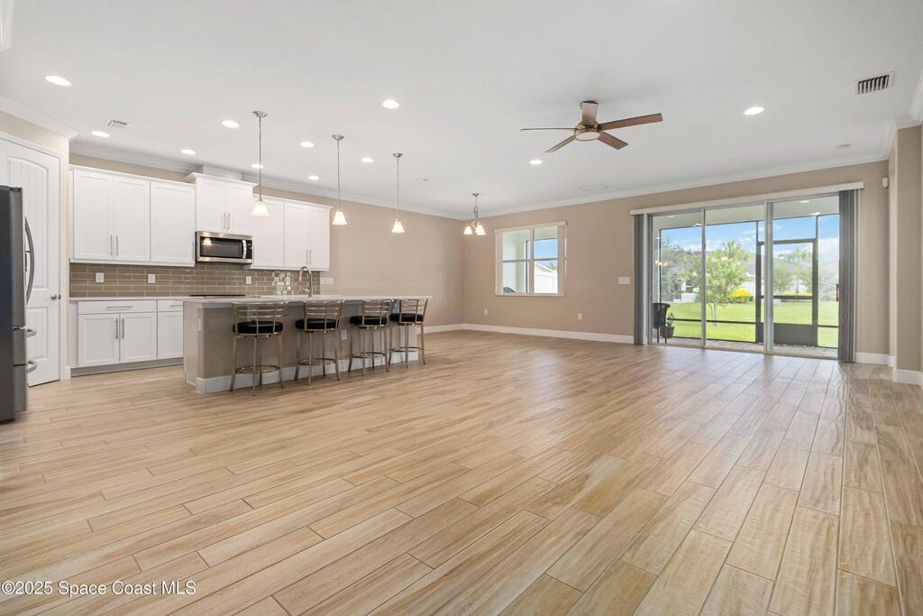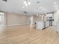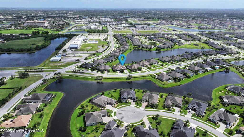 Welcome Home! This thoughtfully designed home offers modern upgrades such as high quality wood-look tile flooring, stylish lighting & crown molding. The open floor plan has 2 bedrooms PLUS office/den & spacious living room that flows seamlessly into the chef-inspired kitchen & dining room. Light & bright kitchen boasts quartz countertops, tile backsplash, pantry, large island/breakfast bar, stainless appliances (including new LG ThinQ fridge), an ideal space for entertaining. Owners suite w/en suite bath features double vanity & walk-in tiled shower. Triple sliders open to the brick paver, screened-in patio w/serene WATER VIEW & large yard. Waterview from front porch provides additional privacy. Living here is truly maintenance free, giving you more time to enjoy the resort-style amenities! This home offers comfort, convenience & community. Conveniently located near shopping, dining, movies, hospital, 20 min to beaches, 40 min to KSC, NASA, SpaceX, Blue Origin, 45 min to Orlando!