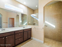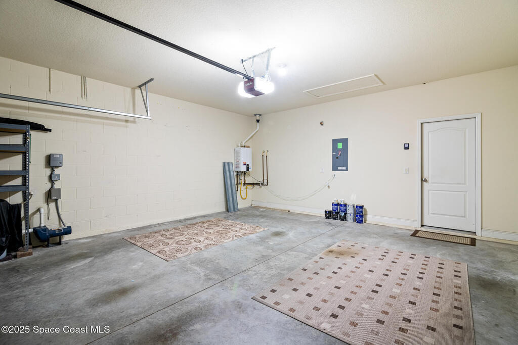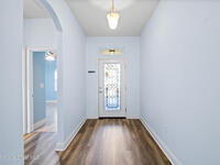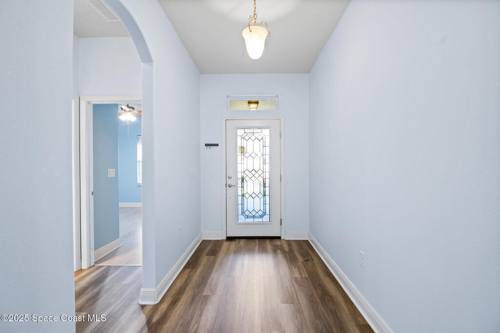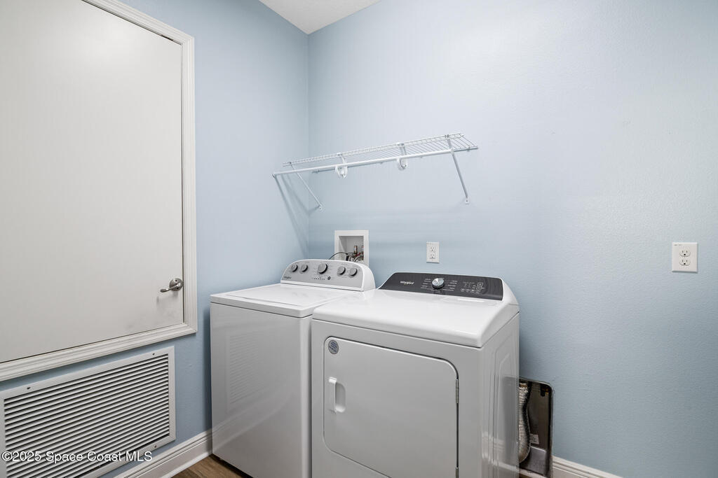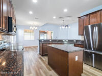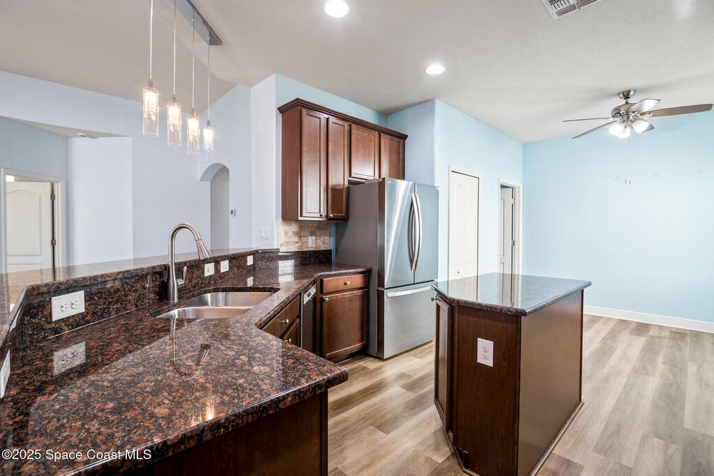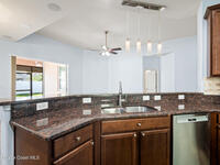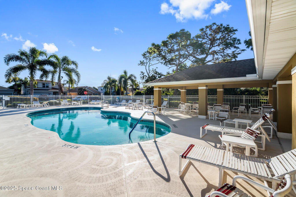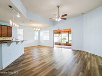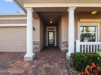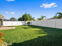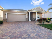 Charming curb appeal sets the tone in this gated community, where tropical landscaping, stone filled edged plantings beds & pavers lead from the driveway to the charming front porch & leaded-glass front door. Inside, gorgeous new vinyl plank flooring - no carpet - flows through a bright modern open floorplan designed for effortless living & entertaining. The kitchen shines with solid wood 42'' high cabinets, granite counters & newer stainless appliances. The spacious owner's suite offers a peaceful retreat with a huge walk-in closet & stunning ensuite featuring a zero-entry shower & granite-topped double sink vanity. Two generous guest bedrooms & a guest bath provide comfort for visitors. Step out of the great room to enjoy Florida living on the large under-truss porch & pavered patio overlooking the expansive, fully fenced backyard. Updates include a 2020 HVAC, 2023 tankless water heater, electric roll-down shutters at the front window & back porch, & accordions on remaining windows.
