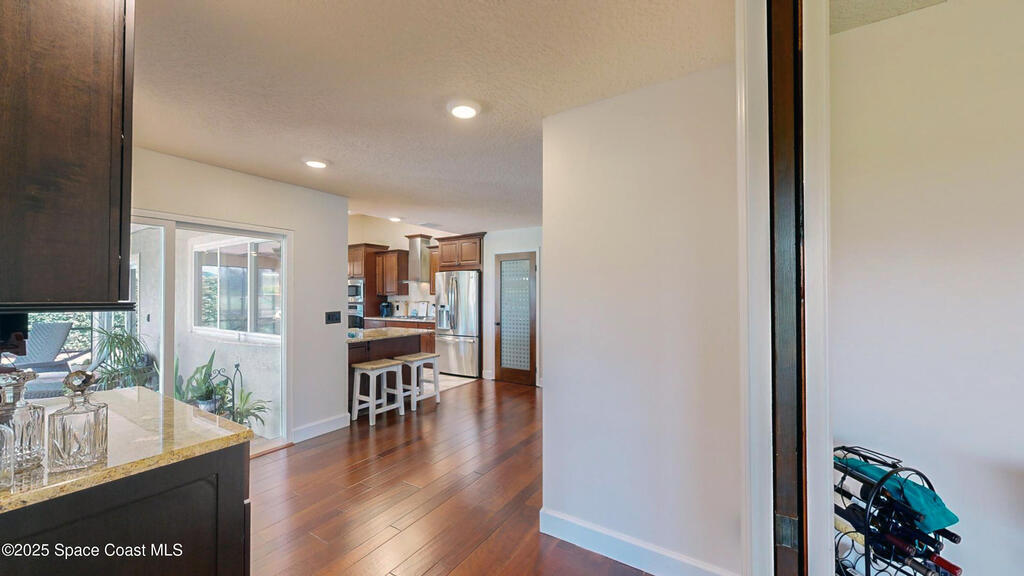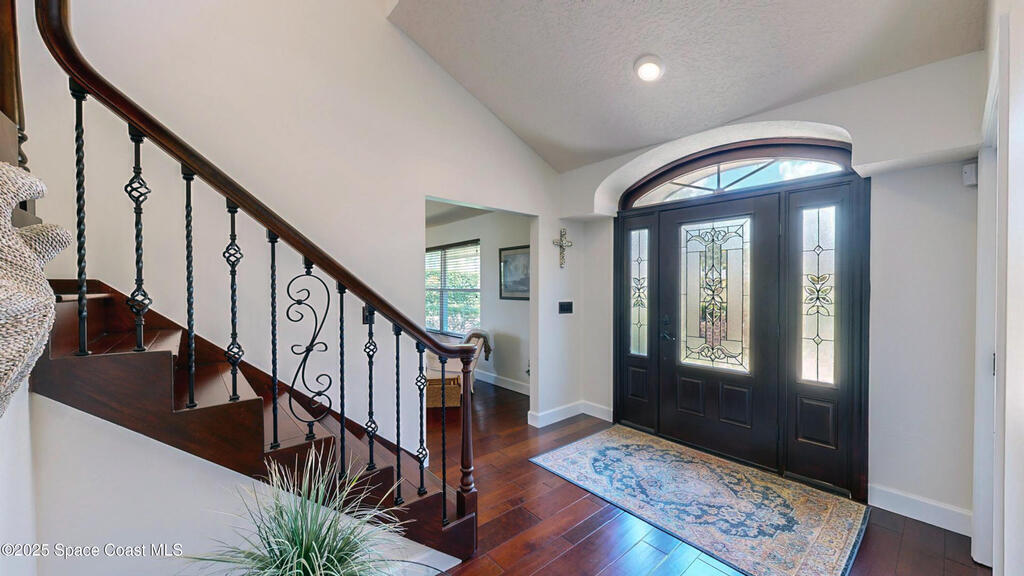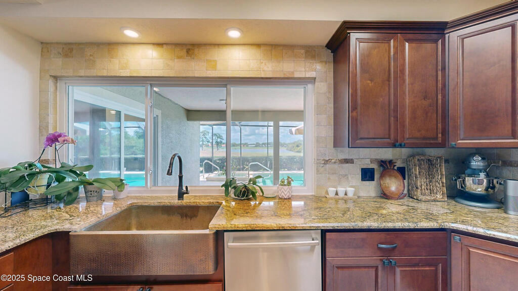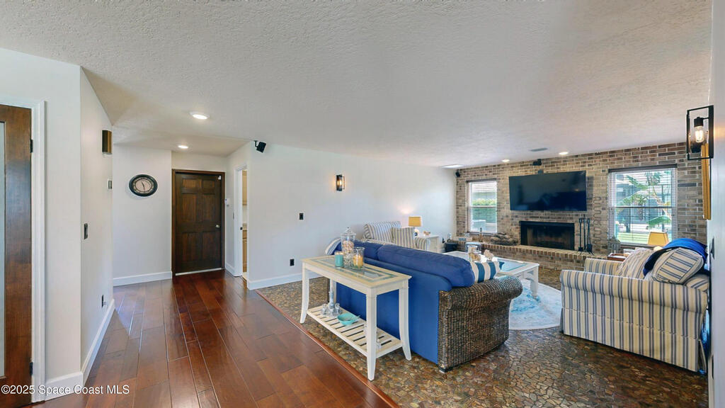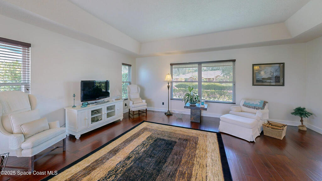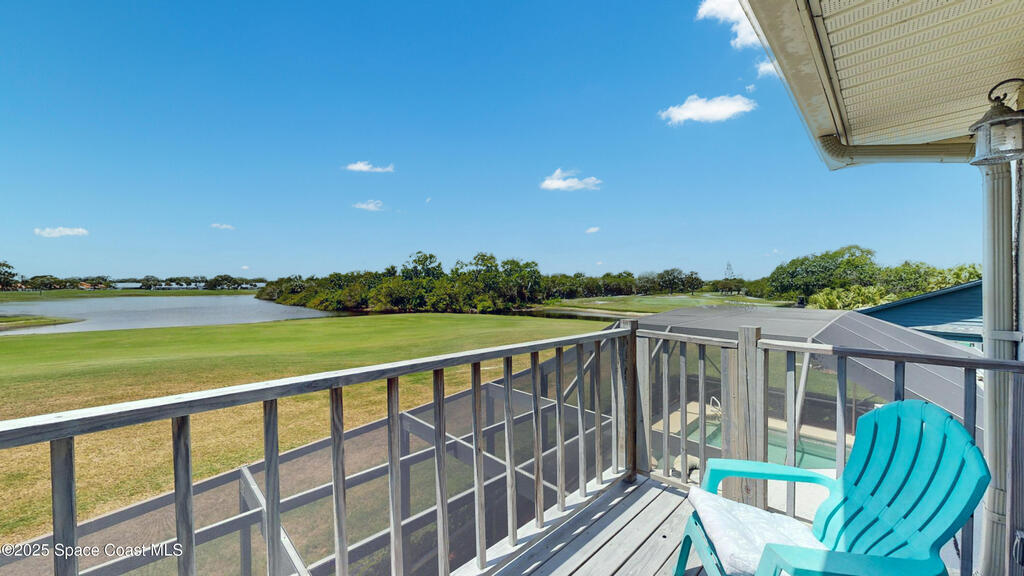 Beautifully situated on the #3 Challenge Course at Suntree Golf Club, this updated pool home offers over 3, 000 sq. ft. of living space with exceptional golf course views. The home features a 2023 A/C system, 2021 roof, and 40 solar panels for added energy efficiency(paid off). The kitchen includes cathedral ceilings, granite countertops, stainless steel appliances, a gas range, hammered copper farmhouse sink, and pantry. Additional highlights include skylights, cherry- wood flooring, and a family room with a brick fireplace(wood burning can covert back to gas). The screened, gas-heated salt water pool and spa, along with the covered patio, provide an ideal setting for year-round enjoyment. The upstairs primary suite features a private balcony with sunrise and sunset views! Conveniently located near schools, shopping, dining, and medical facilities.