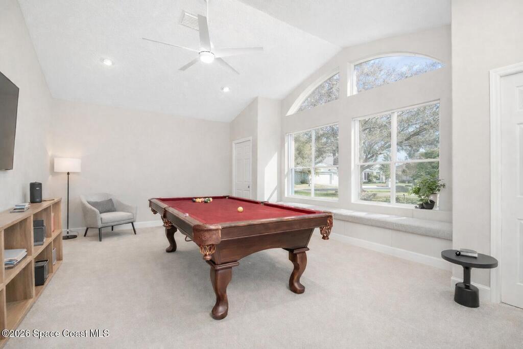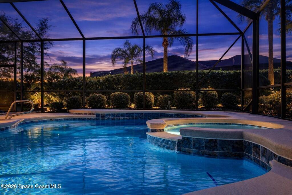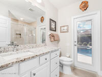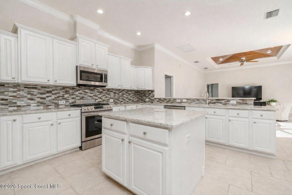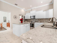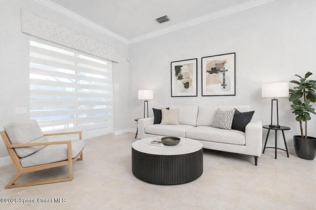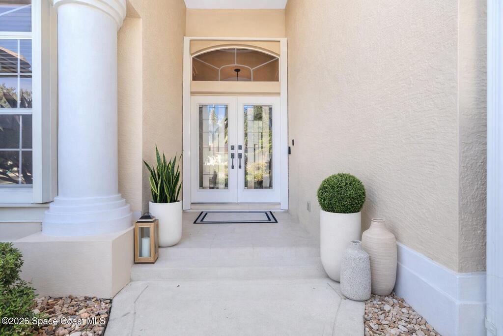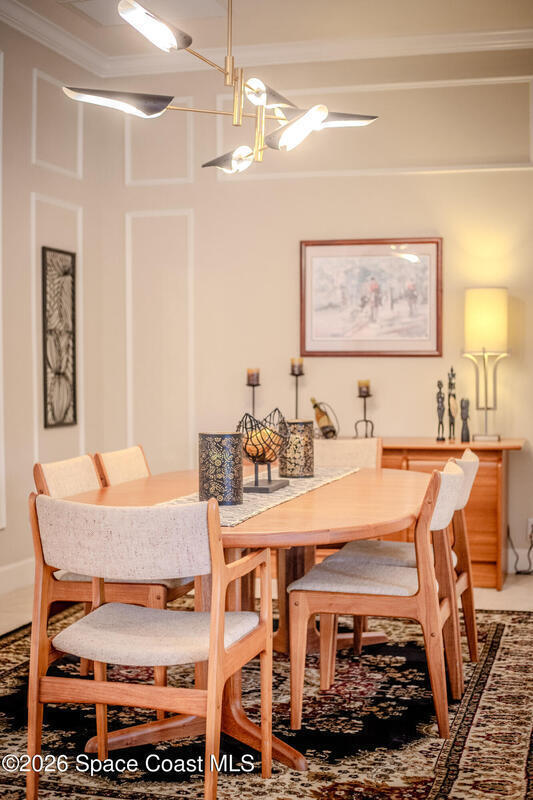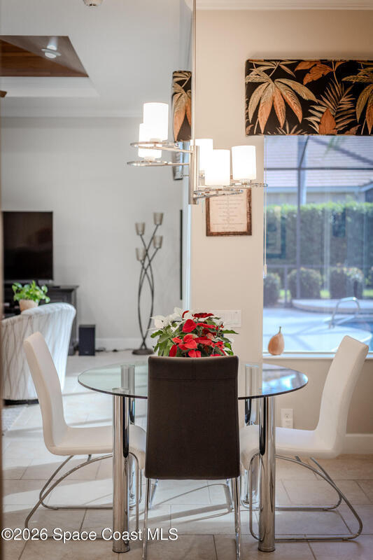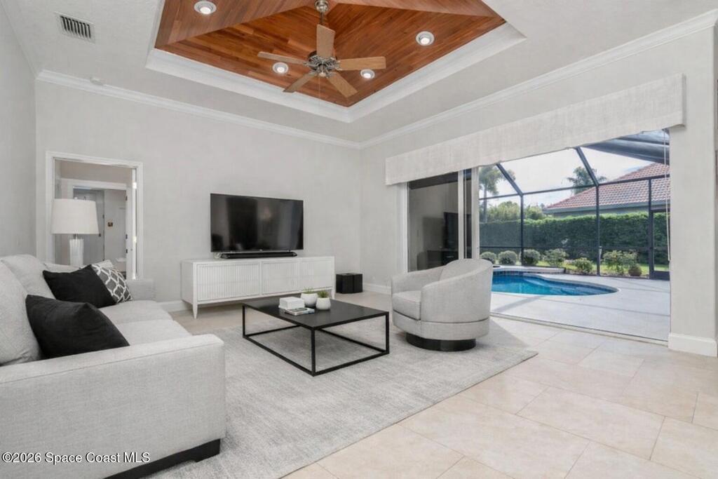 Welcome to this exceptional Arthur Rutenberg home in the 24-hour guard-gated community of Baytree in Suntree. Built in 2001 and offering 3, 203 square feet, this beautifully updated residence features 4 bedrooms, 3 bathrooms, a dedicated private office, and a spacious bonus room complete with a pool table -- ideal for entertaining or extended living. The desirable split floor plan includes a private wing with bedroom, full bath, double closets, bonus room, and direct pool access, allowing it to be closed off for multi-generational living or an in-law suite. From the moment you arrive, elegant double front doors with new glass inserts open to a designer foyer chandelier and refined architectural details, including 10-foot ceilings, crown molding, 6-inch baseboards, custom cedar tray ceiling, and triple pocket sliders that create seamless indoor-outdoor living. Five separate access points lead to the lanai, enhancing the home's open flow. The chef's kitchen is beautifully