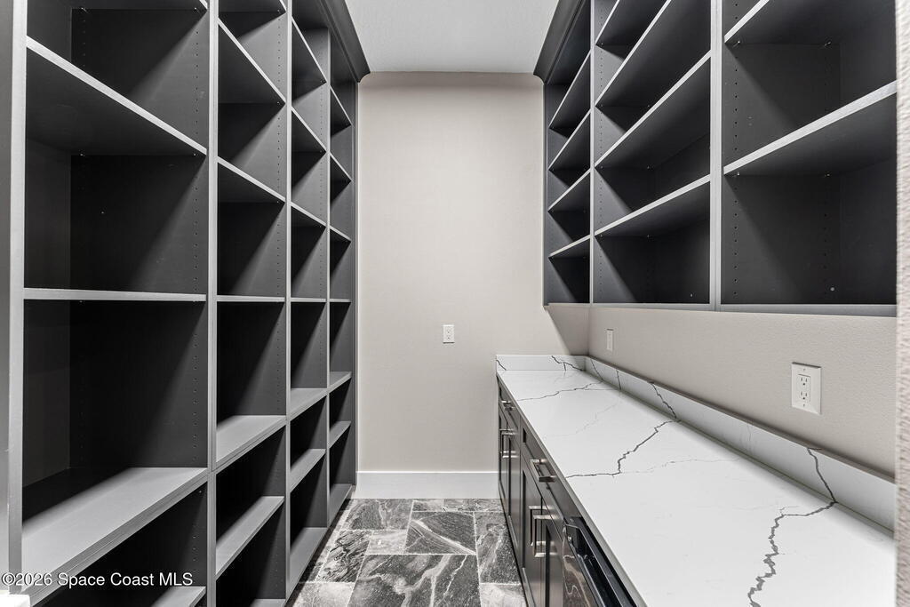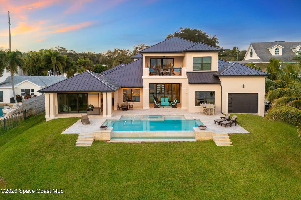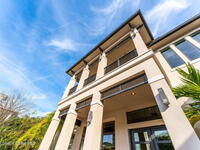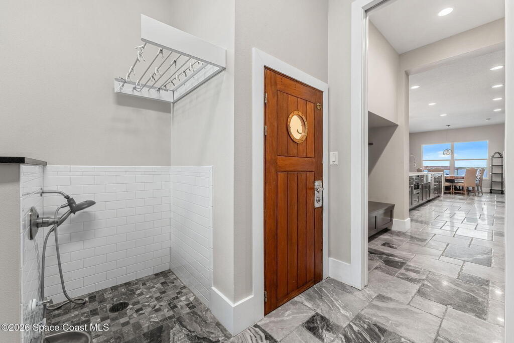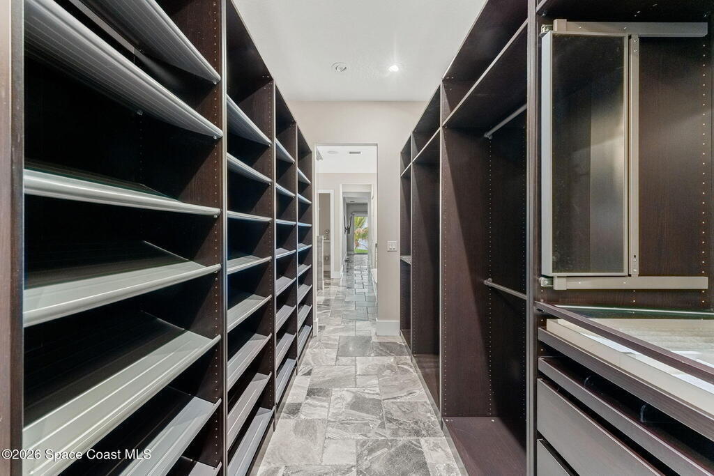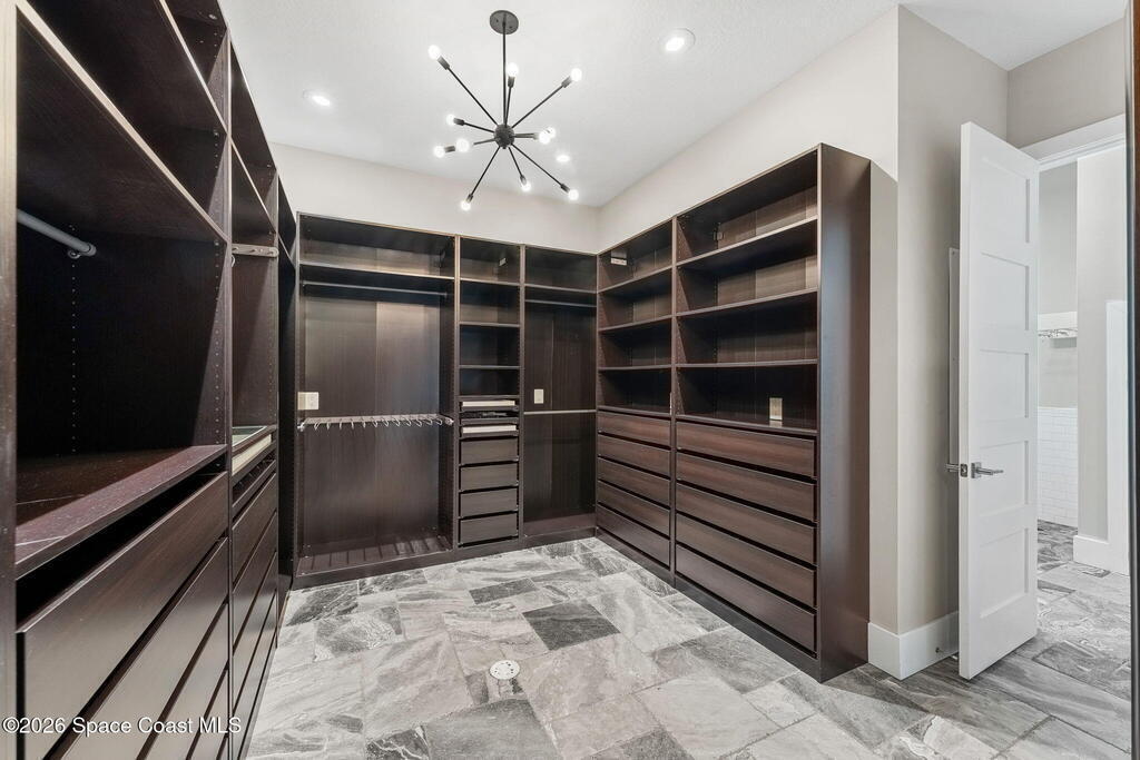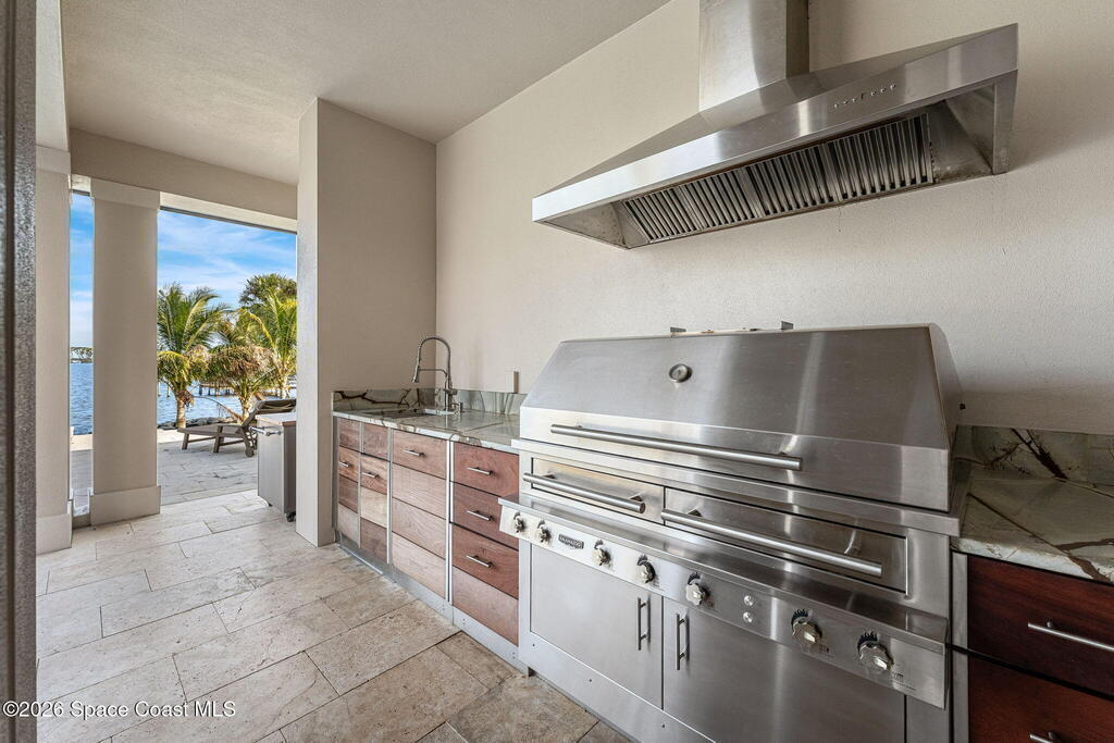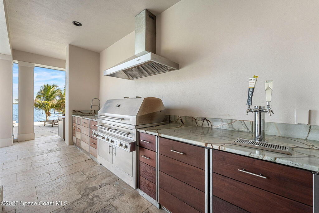 The ultimate private classic car showroom and motorcoach retreat. Stunning custom riverfront home w/ 8-car garage plus 10, 000 lb tandem lift for your curated vehicle collection, additional high-clearance, 55 ft RV/boat garage w/ full hookups. A mariner's paradise w/ 110 ft open water frontage, a granite rock shoreline, and direct views of the intracoastal river. Custom dock w/ 2 lifts to accommodate up to a 30 ft boat with shore power. Enhanced solid poured concrete exterior, freshly painted and sealed, 5 bed 4.5 bath home w/ infinity edge saltwater pool and built-in spa, summer kitchen w/ custom Kalamazoo cabinetry and marine grade stainless steel grille. Impact sliding glass pocket doors w/ expansive river views, custom imported marble floors. Primary suite w/ custom walk-in steam shower and a freestanding soaker tub, and a massive walk-in closet leading to the laundry room. Chef's kitchen w/ 15 ft quartz island w/ waterfall edges, but the hidden butler's pantry steals the show.