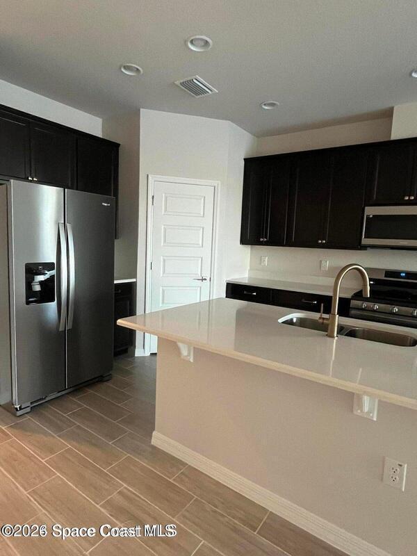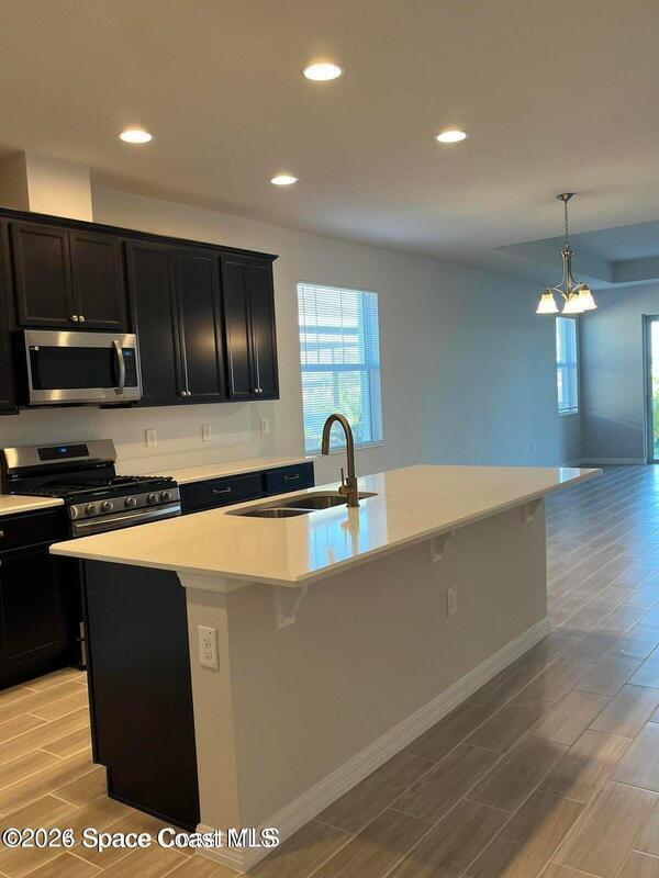 This beautiful waterfront home is ready for you! This stunning residence showcases high-end finishes throughout, including elegant quartz countertops, stylish wood-look tile flooring, hurricane-impact windows, and recessed lighting. Enjoy tranquil lake views that create a peaceful backdrop. The expansive chef's kitchen is designed to impress, featuring stainless steel appliances, gas range, a spacious walk-in pantry, abundant cabinetry and a large island perfect for gathering. The bright, open-concept layout flows effortlessly, creating an inviting space ideal for entertaining. This nearly new 4-bedroom, 2.5-bathroom home offers the perfect blend of luxury and comfort. Ideally situated in the heart of Viera's sought-after community, Pangea, with resort-style pool, playground, clubhouse and tennis/pickle courts. Residents enjoy convenient access to premier shopping, fine dining, top-rated schools, and quick connections to I-95. Includes cable, internet, lawn care and pest control.