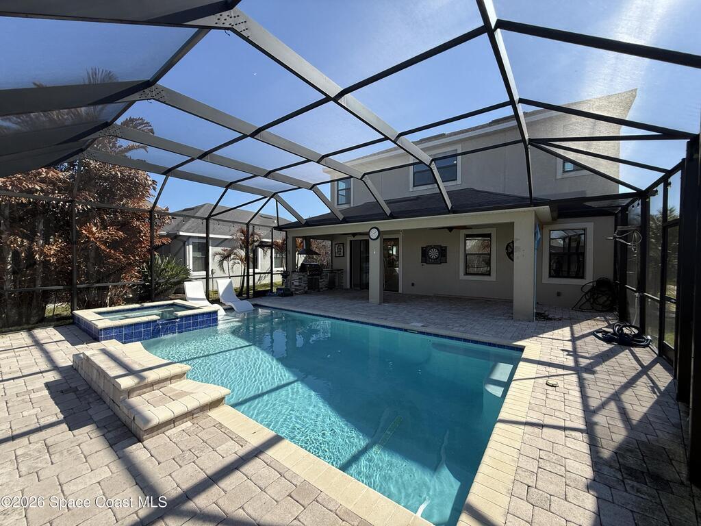 Beautiful 4BR, 2.5BA home with resort-style outdoor living. This 2-story property features a first-floor master suite and flex room, a spacious kitchen with island, walk-in pantry, and granite countertops, and a large great room. Tile and laminate flooring in main areas and carpeted bedrooms. Upstairs includes additional bedrooms and a laundry room.Enjoy a screened-in outdoor oasis with a heated pool and spa, outdoor kitchen featuring a built-in grill, refrigerator, and sink, plus an outdoor fire pit area. 2 car garage includes a Tesla/EV charger. Property includes access to desirable Addison Village Club which includes family pool with zero entry, lap and leisure pool, tennis pavillion, pickleball and bocce ball courts, family pavillion, and much more. This is a must-see home offering exceptional indoor and outdoor living. All residents are enrolled in the Resident Benefits Package at a cost of $55 a month, in addition to the monthly rent.