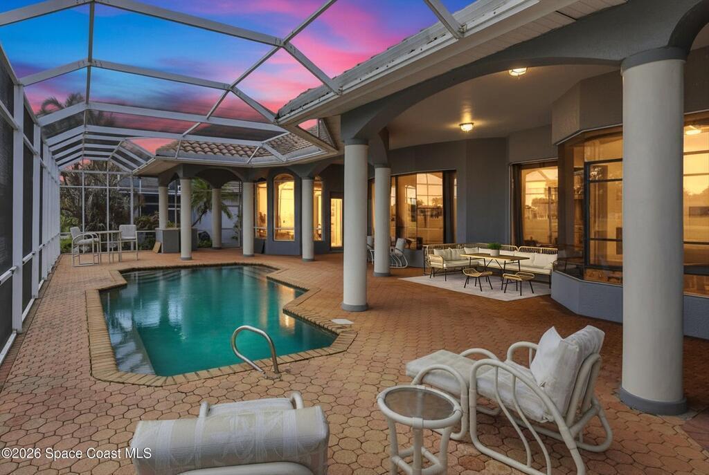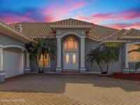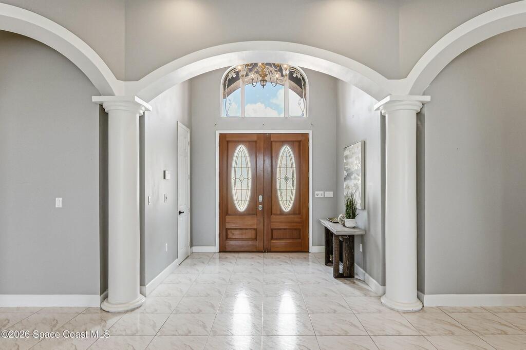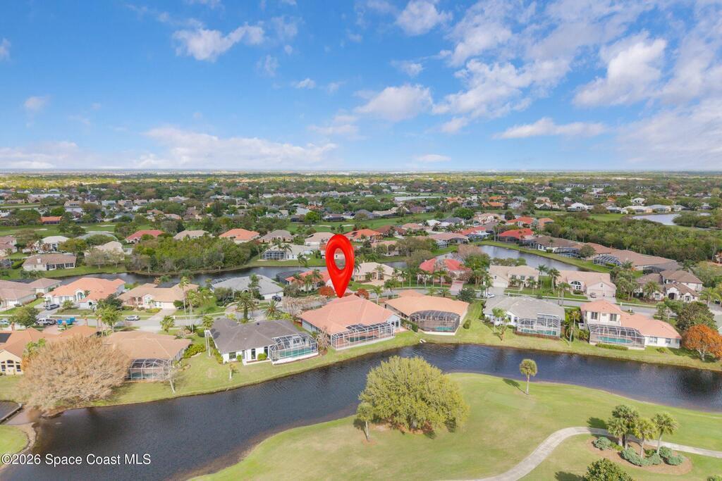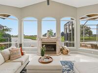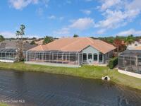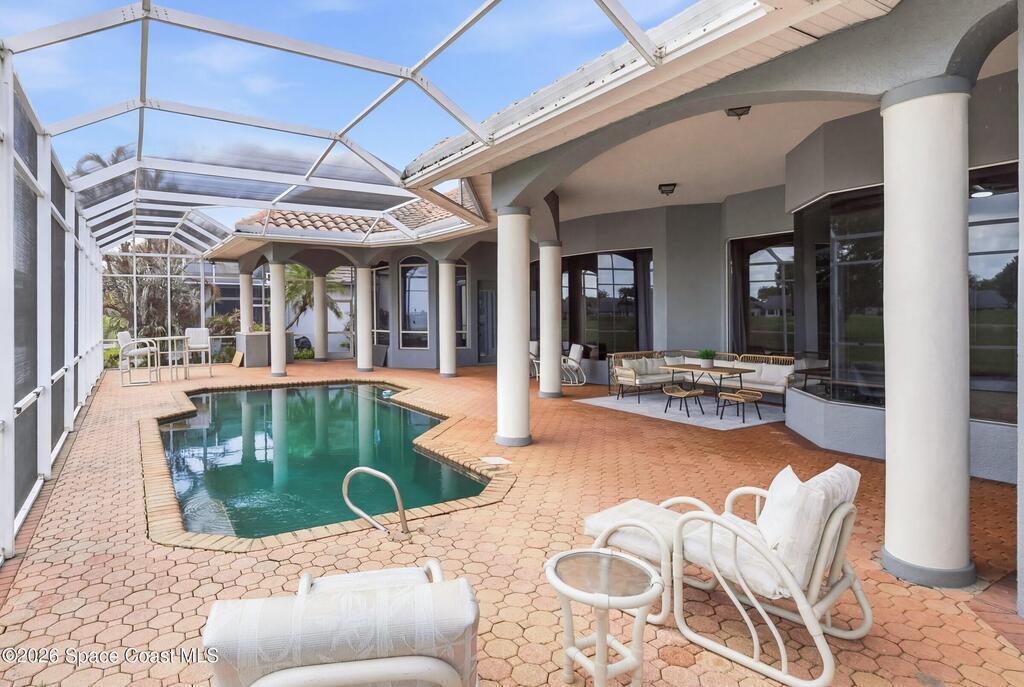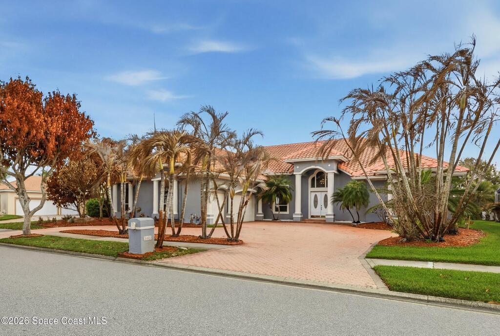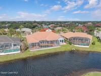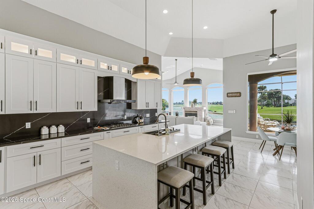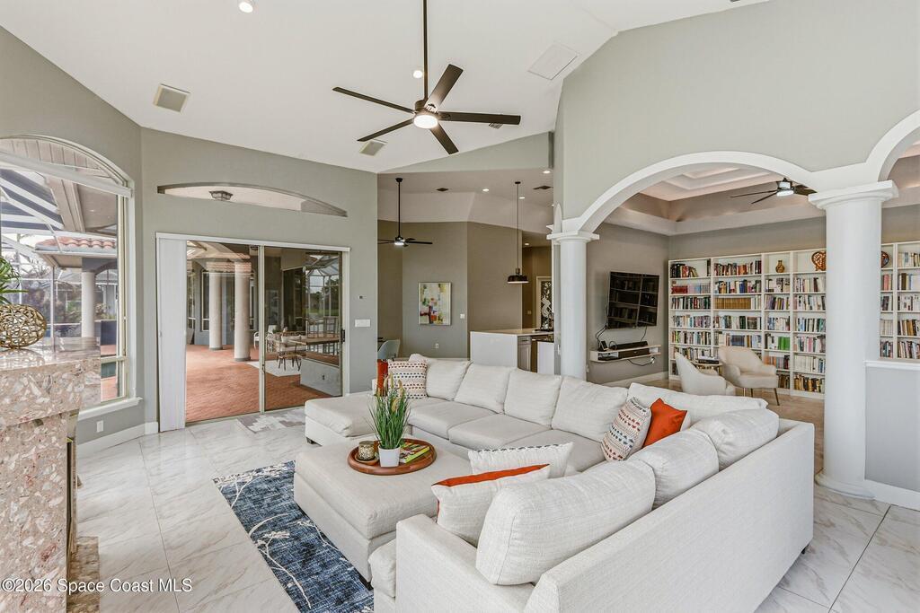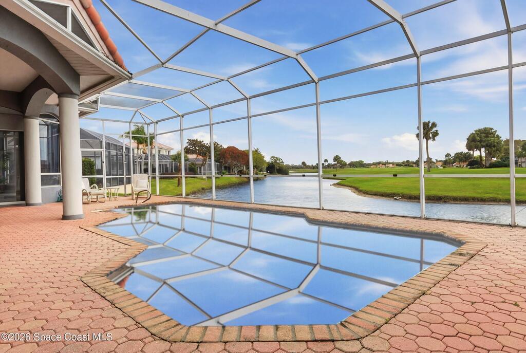 Discover an extraordinary lakefront estate in the Legends at Suntree. Offering 4, 449sq ft of refined living space with sweeping golf course and lake views, this impressive 5 bedroom 3.5 bath residence blends grand scale with elegant design. Beginning with a dramatic 16' foyer and soaring 12-14' ceilings throughout accented by tray ceilings in the primary suite, living, family and dining rooms this home is designed for both sophisticated entertaining and everyday comfort. The home features a private library, media room and open living flow that captures stunning water and fairway vistas. The chef kitchen is beautifully appointed with quartz countertops a striking waterfall island and GE Cafe appliances. The luxurious primary suite offers a slipper tub, oversized walk-in shower and expansive his and hers closets. Outdoors a resort style pool and screened lanai overlook the tranquil lake and golf course scenery, completing this exceptional three-car garage estate. Renovations done in 2024