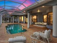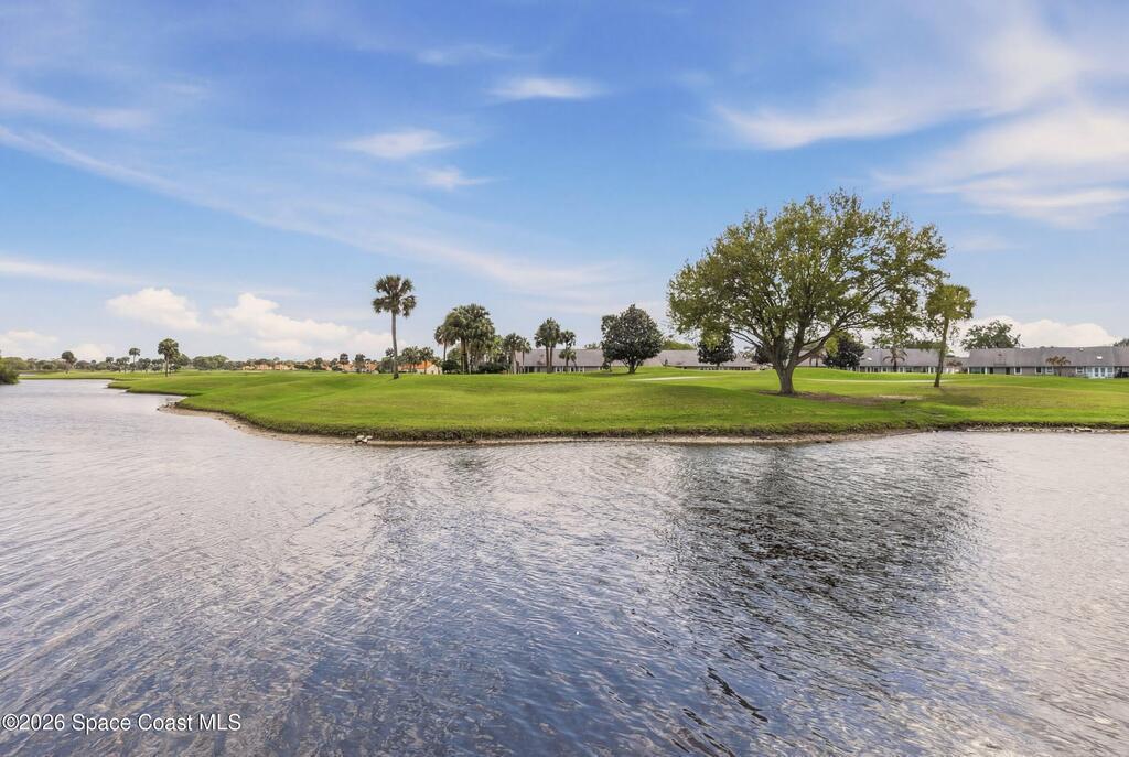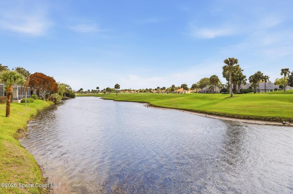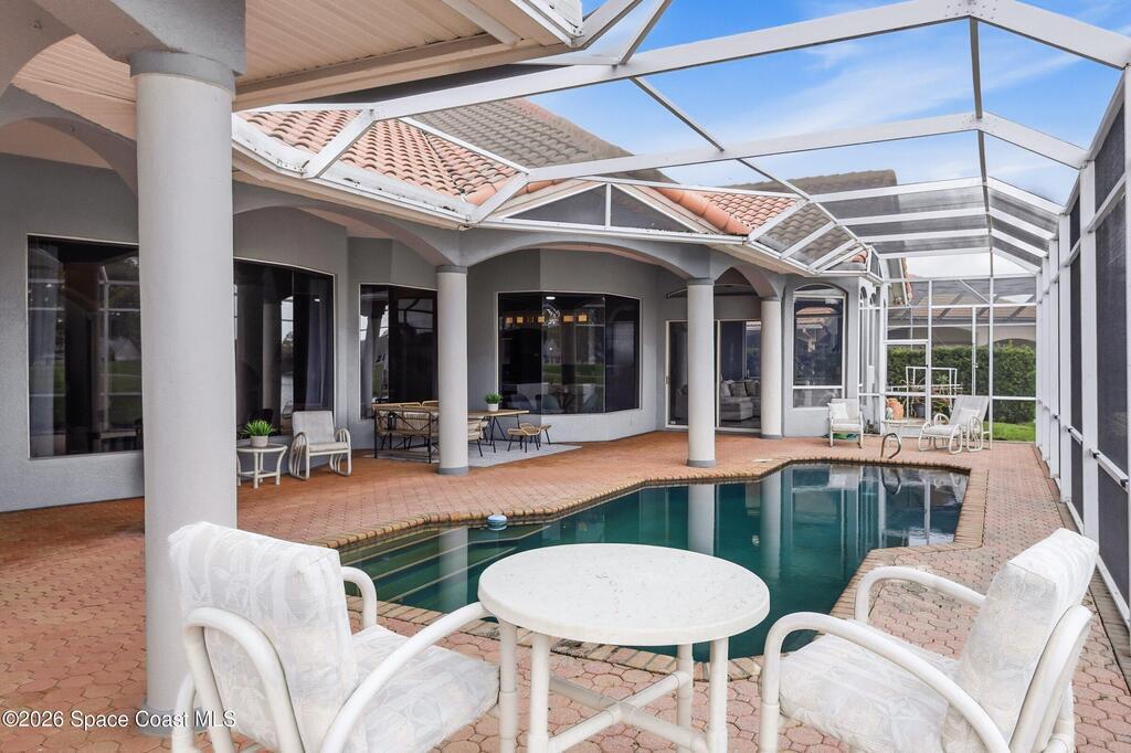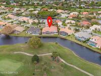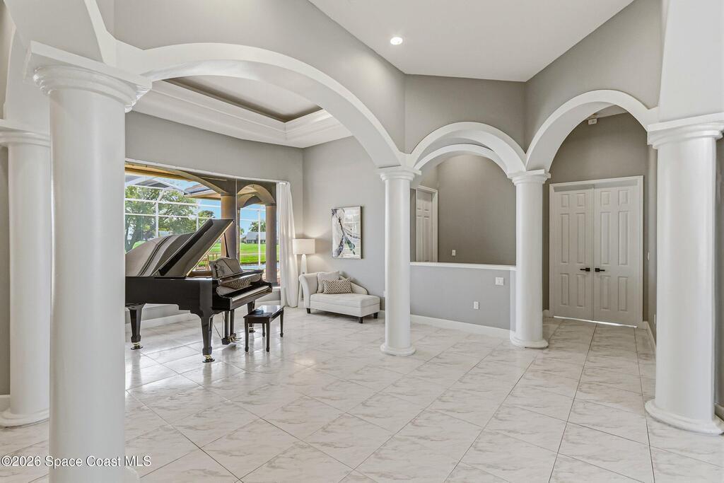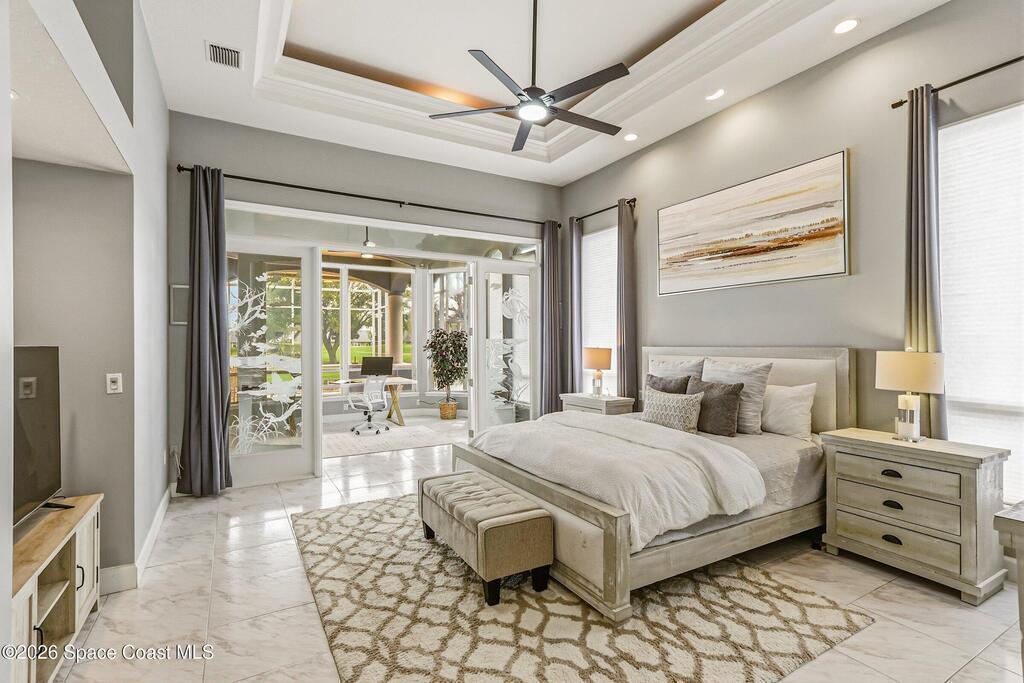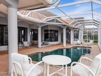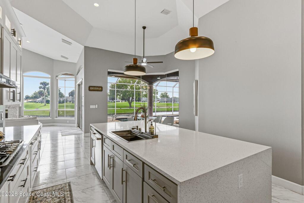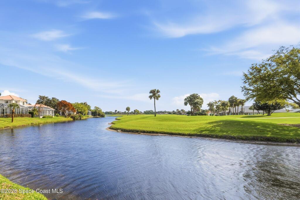 Discover an extraordinary lakefront estate in the Legends at Suntree. Offering 4, 449sq ft of refined living space with sweeping golf course and lake views, this impressive 5 bedroom 3.5 bath residence blends grand scale with elegant design. Beginning with a dramatic 16' foyer and soaring 12-14' ceilings throughout accented by tray ceilings in the primary suite, living, family and dining rooms this home is designed for both sophisticated entertaining and everyday comfort. The home features a private library, media room and open living flow that captures stunning water and fairway vistas. The chef kitchen is beautifully appointed with quartz countertops a striking waterfall island and GE Cafe appliances. The luxurious primary suite offers a slipper tub, oversized walk-in shower and expansive his and hers closets. Outdoors a resort style pool and screened lanai overlook the tranquil lake and golf course scenery, completing this exceptional three-car garage estate. Renovations done in 2024