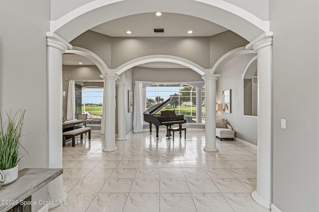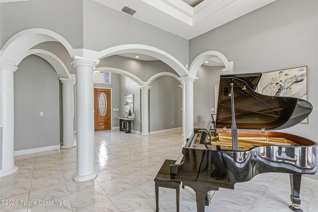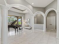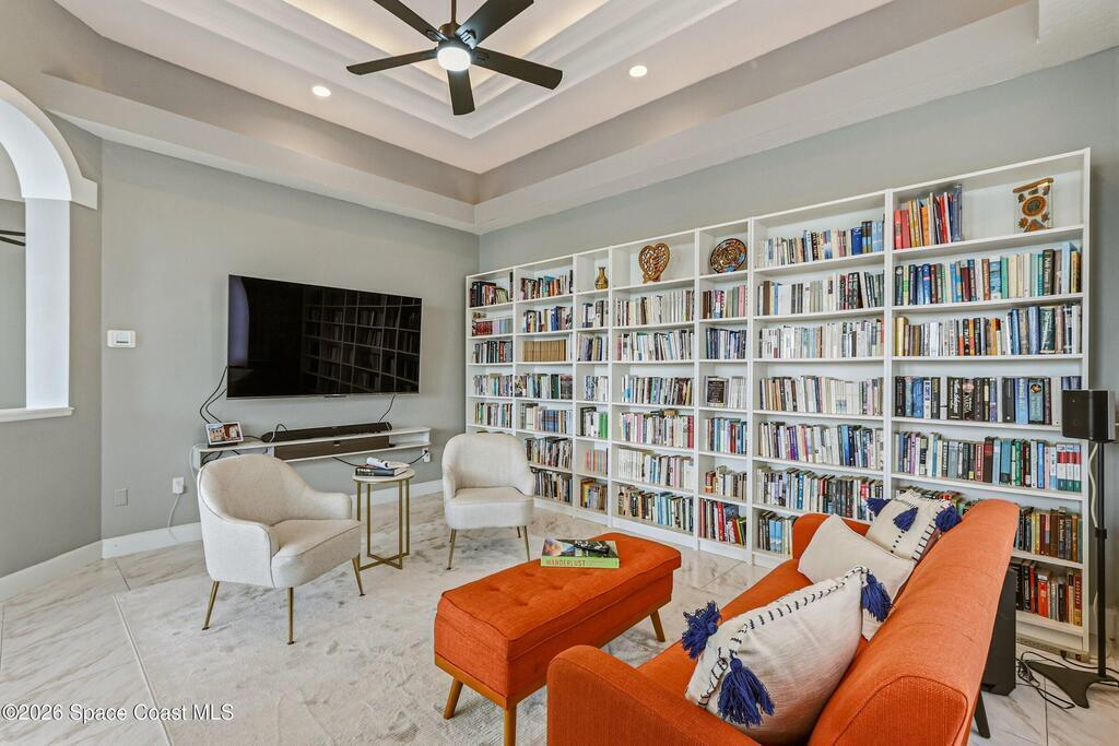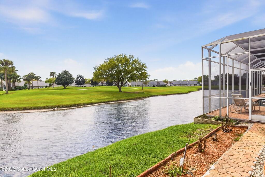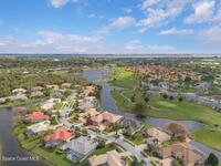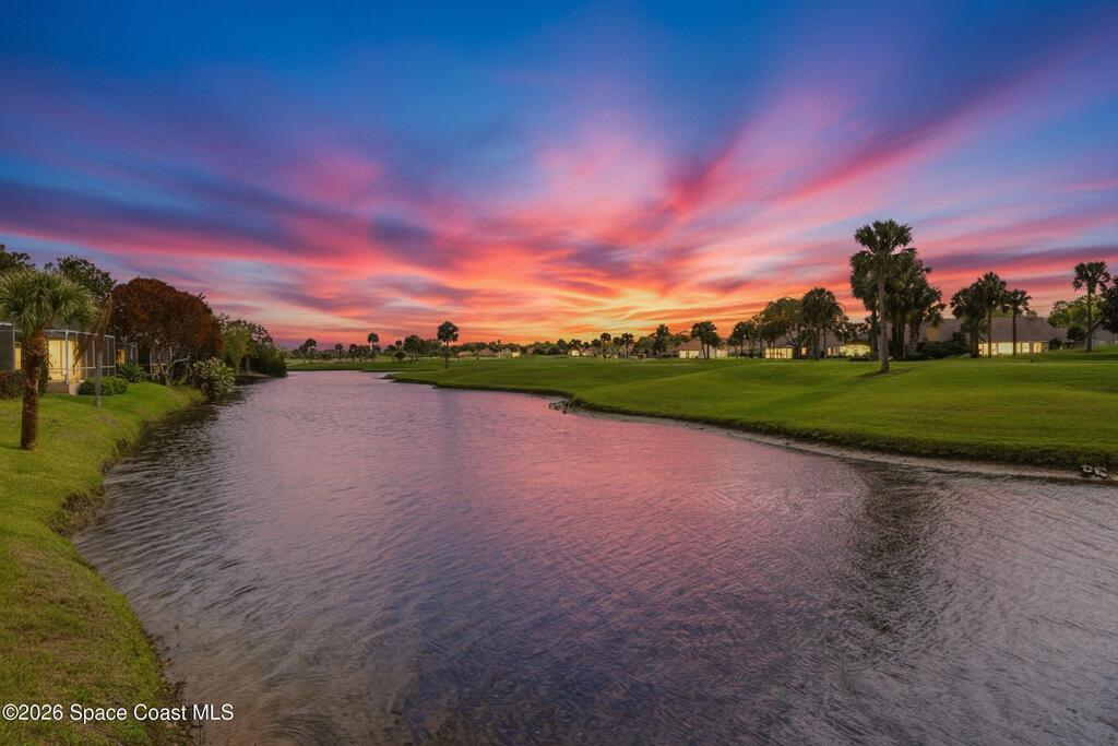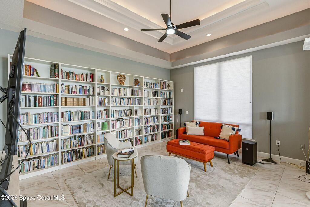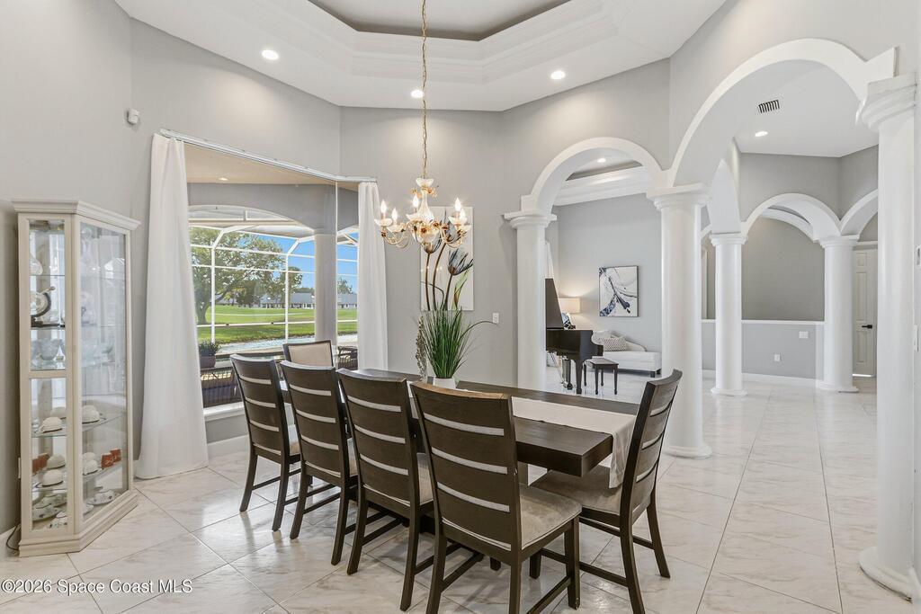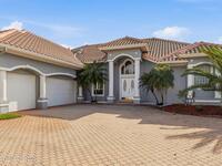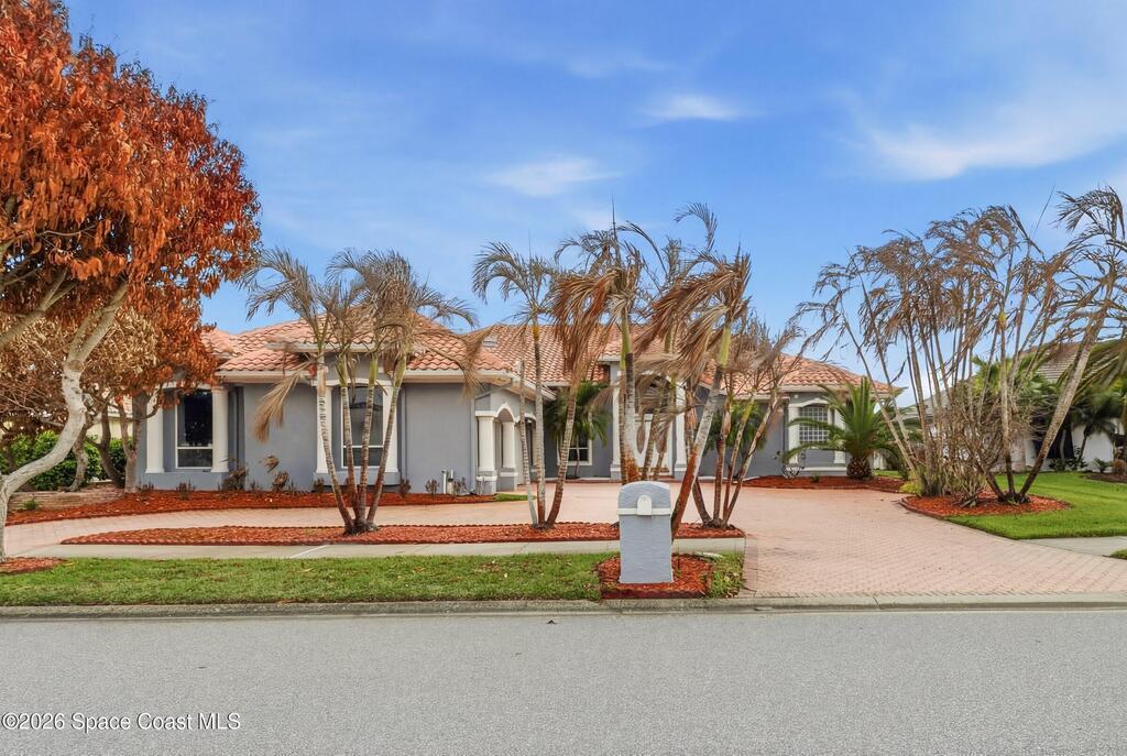 Discover an extraordinary lakefront estate in the Legends at Suntree. Offering 4, 449sq ft of refined living space with sweeping golf course and lake views, this impressive 5 bedroom 3.5 bath residence blends grand scale with elegant design. Beginning with a dramatic 16' foyer and soaring 12-14' ceilings throughout accented by tray ceilings in the primary suite, living, family and dining rooms this home is designed for both sophisticated entertaining and everyday comfort. The home features a private library, media room and open living flow that captures stunning water and fairway vistas. The chef kitchen is beautifully appointed with quartz countertops a striking waterfall island and GE Cafe appliances. The luxurious primary suite offers a slipper tub, oversized walk-in shower and expansive his and hers closets. Outdoors a resort style pool and screened lanai overlook the tranquil lake and golf course scenery, completing this exceptional three-car garage estate. Renovations done in 2024