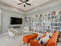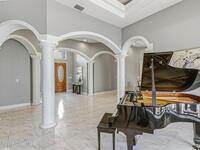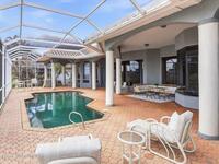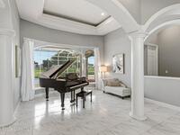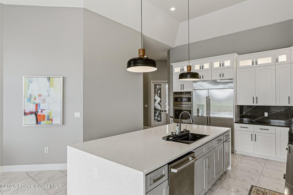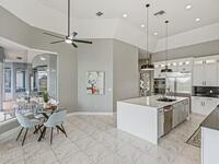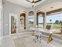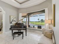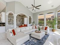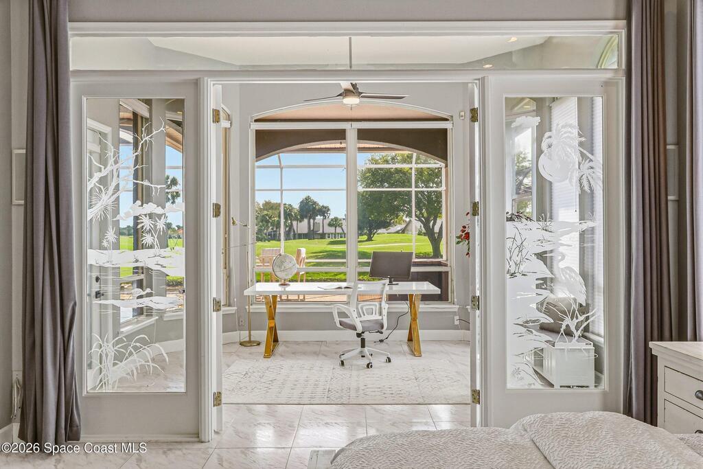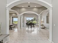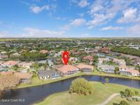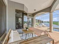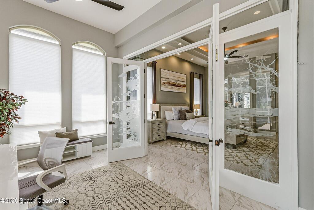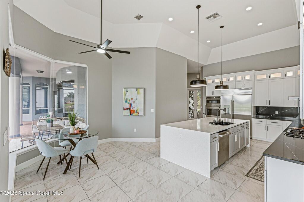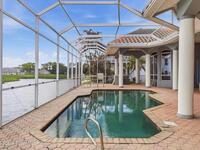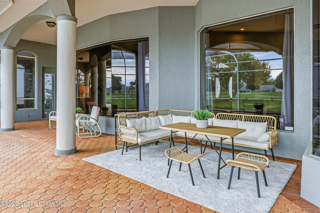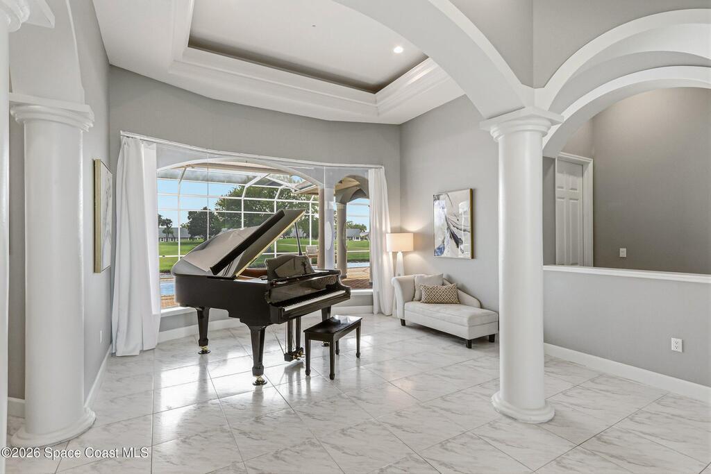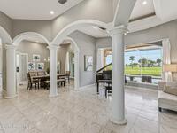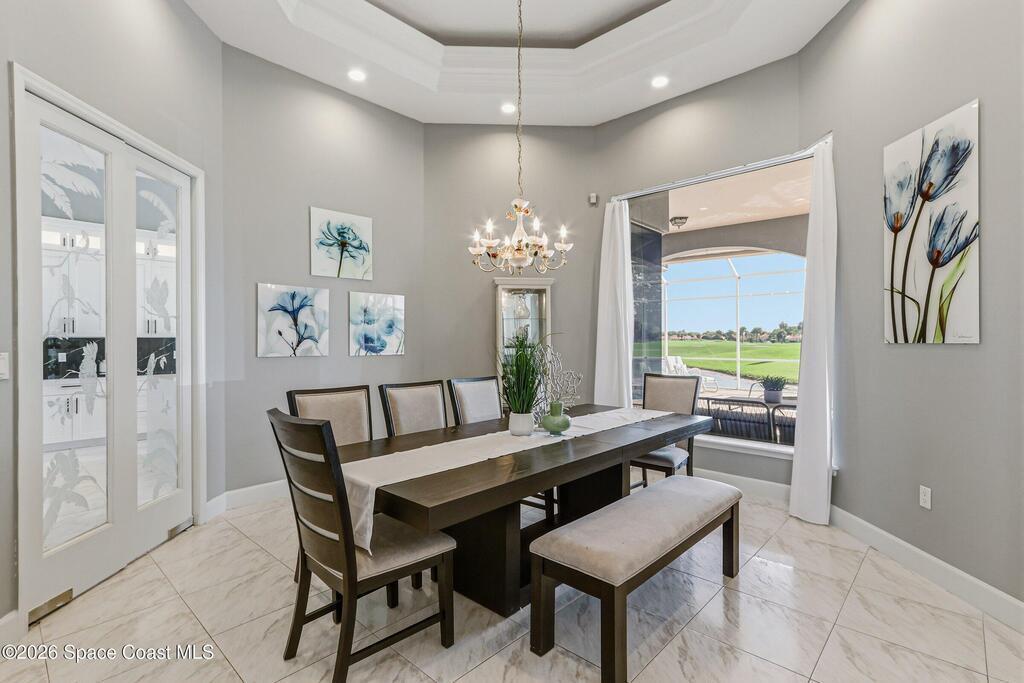 Discover an extraordinary lakefront estate in the Legends at Suntree. Offering 4, 449sq ft of refined living space with sweeping golf course and lake views, this impressive 5 bedroom 3.5 bath residence blends grand scale with elegant design. Beginning with a dramatic 16' foyer and soaring 12-14' ceilings throughout accented by tray ceilings in the primary suite, living, family and dining rooms this home is designed for both sophisticated entertaining and everyday comfort. The home features a private library, media room and open living flow that captures stunning water and fairway vistas. The chef kitchen is beautifully appointed with quartz countertops a striking waterfall island and GE Cafe appliances. The luxurious primary suite offers a slipper tub, oversized walk-in shower and expansive his and hers closets. Outdoors a resort style pool and screened lanai overlook the tranquil lake and golf course scenery, completing this exceptional three-car garage estate. Renovations done in 2024