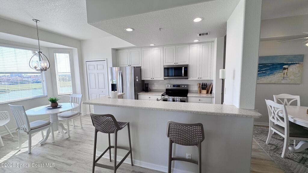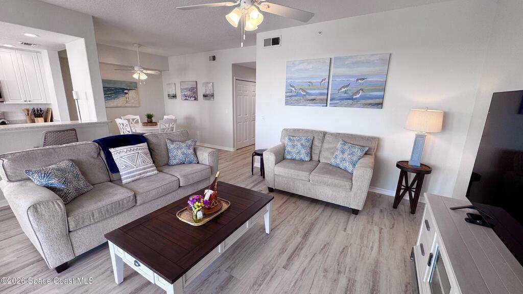 Welcome to The Terraces at Heritage Isle, widely regarded as one of the premier 55+ resort-style communities in Viera, Florida. This beautifully remodeled lakefront condo offers 1, 235 square feet of elegant living space, featuring 2 bedrooms, 2 bathrooms, and soaring ceilings, all located on the highly desirable quiet 4th floor with elevator access.From the living room, kitchen, and screened lanai, enjoy breathtaking panoramic views of the tranquil lake and the Duran Country Club Golf Course--one of the best vantage points in the community. Designed in a light, coastal style, this condo has been thoughtfully updated with top-of-the-line, all-climate waterproof LVP flooring throughout, soft white designer wall tones, and high-end appliances. The unit is fully furnished with tasteful, upscale coastal furniture and includes a large smart TV, making it truly move-in ready.The well-planned floor layout begins with a spacious foyer and hallway that leads to two private bedrooms, two bath