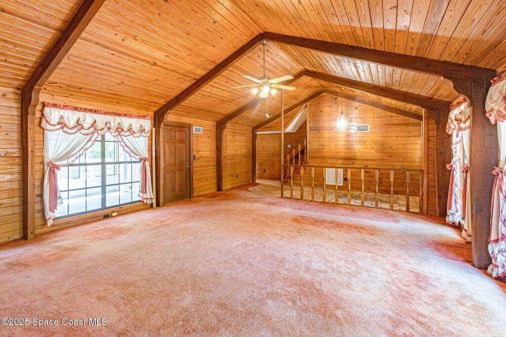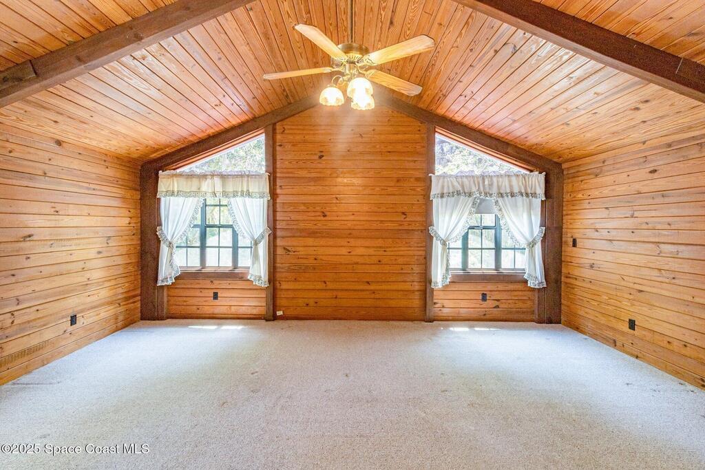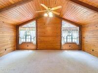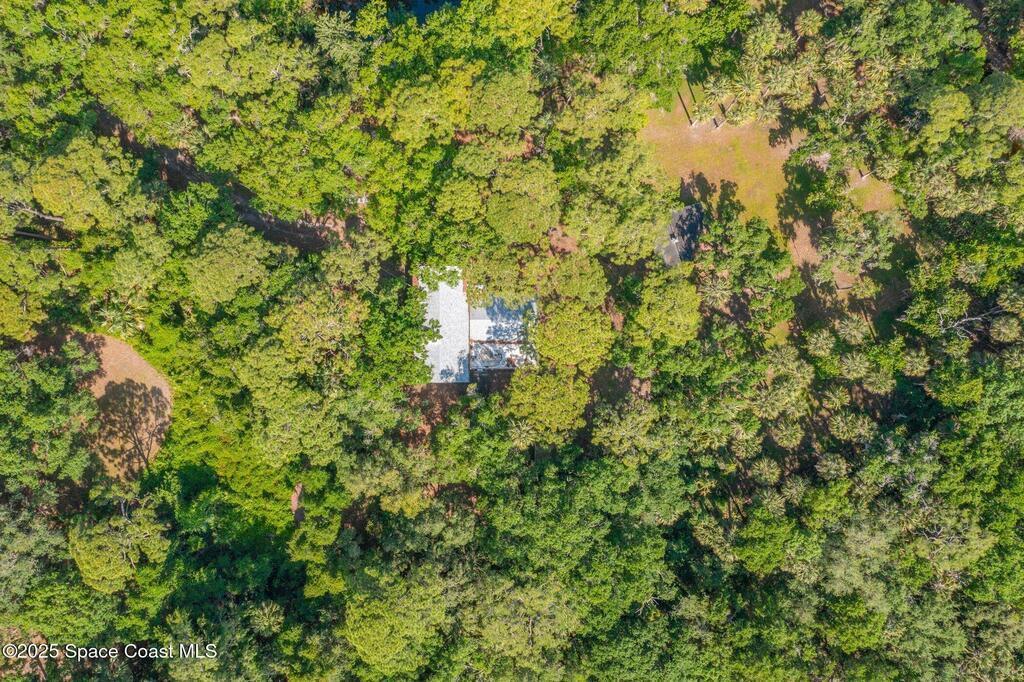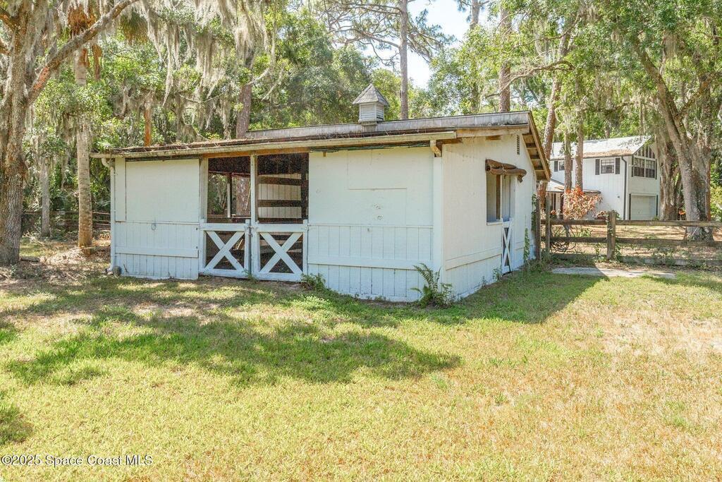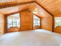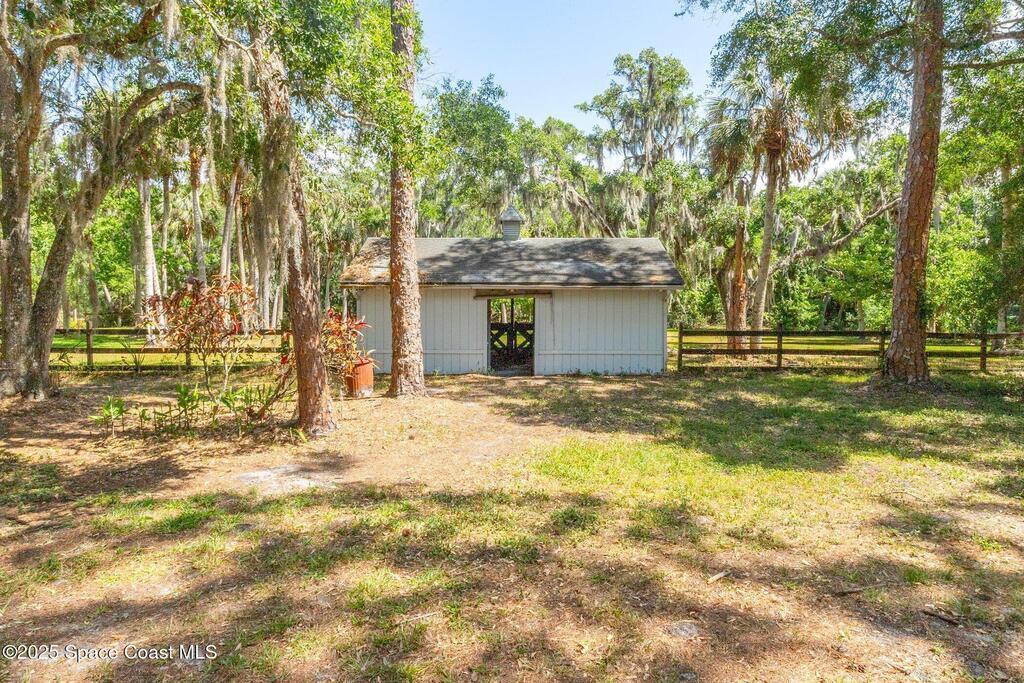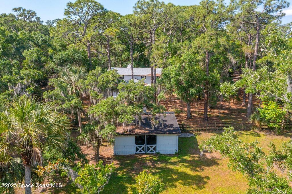See this great new price in time for the NEW YEAR ...this 3 acre property with 2 stall barn and fenced pasture for horses and beautifully wooded lot on north Merritt Island. You will enjoy the peace and quiet. This flag lot property boasts spacious 3 bedroom 2.5 bath home with 2 car garage. Large downstairs living area with vaulted ceilings, fireplace with oak wood walls and high beams make you feel you truly are living in the woods. Kitchen features oak cabinets with granite countertops. Den/office off the kitchen could function as 4th bedroom. Interior laundry. Upstairs master has large windows for lots of light and a fireplace for those cool nights. Large screen porch looks out to the horse pasture. 2 stall horse barn with electric and fans. Large fenced pasture. Roof approximately 3 years old, water heater 4 and septic replaced in 2007. Stop and see this property today!!