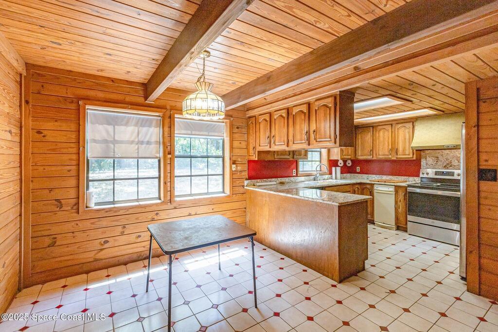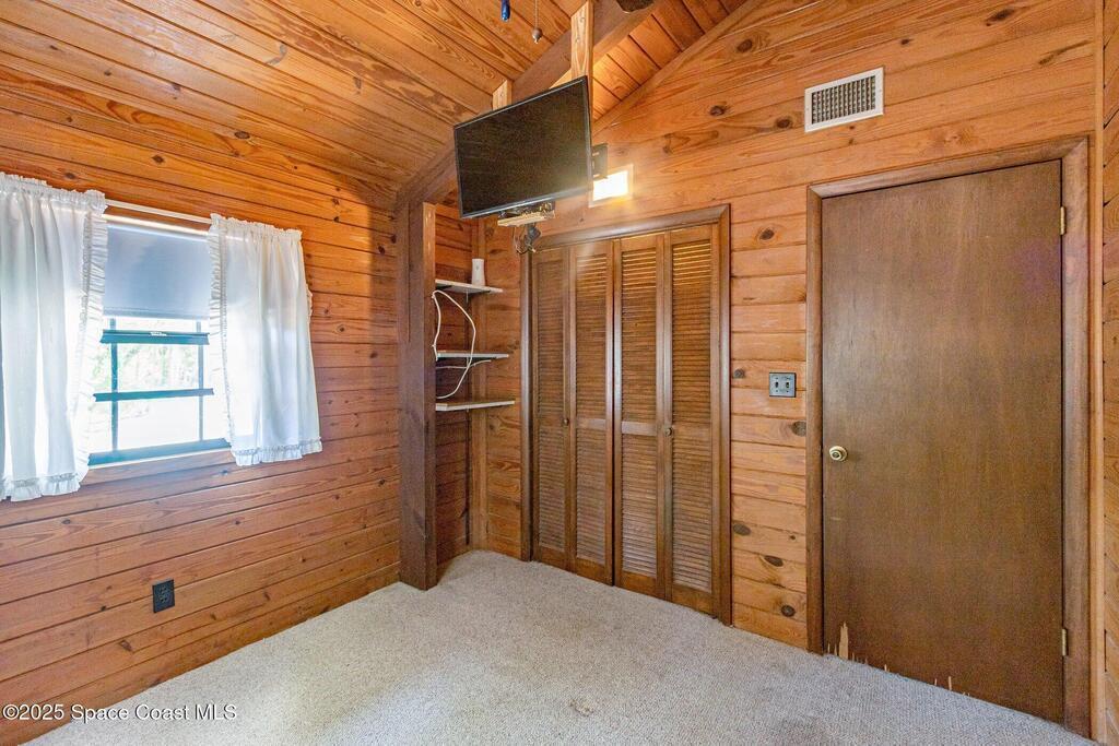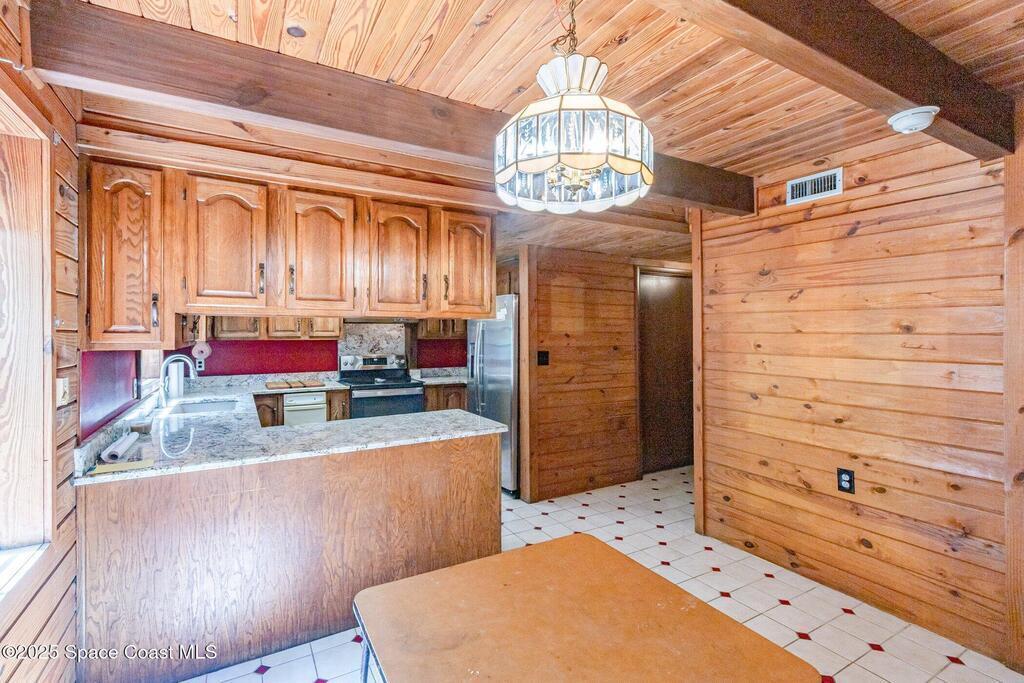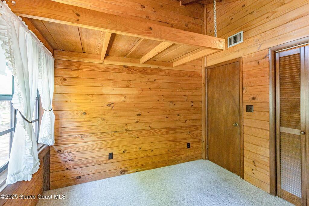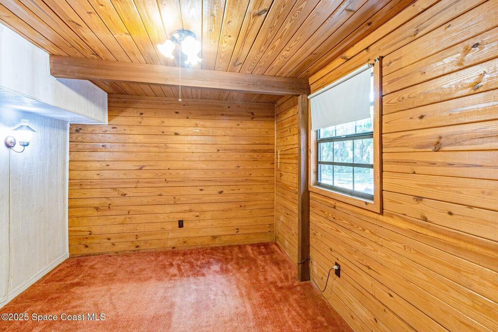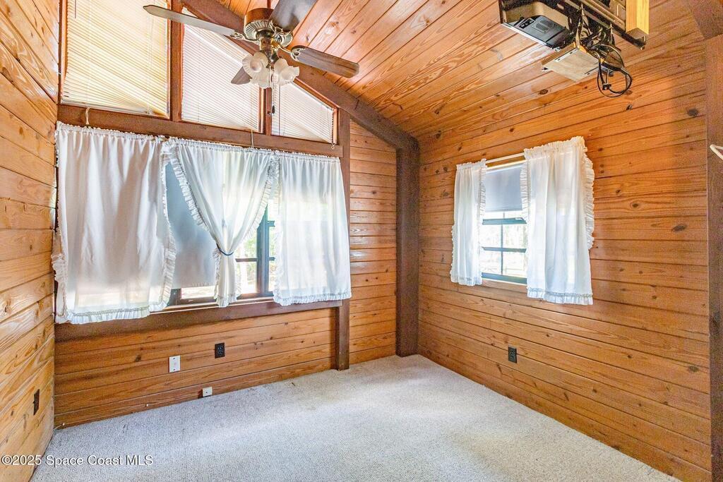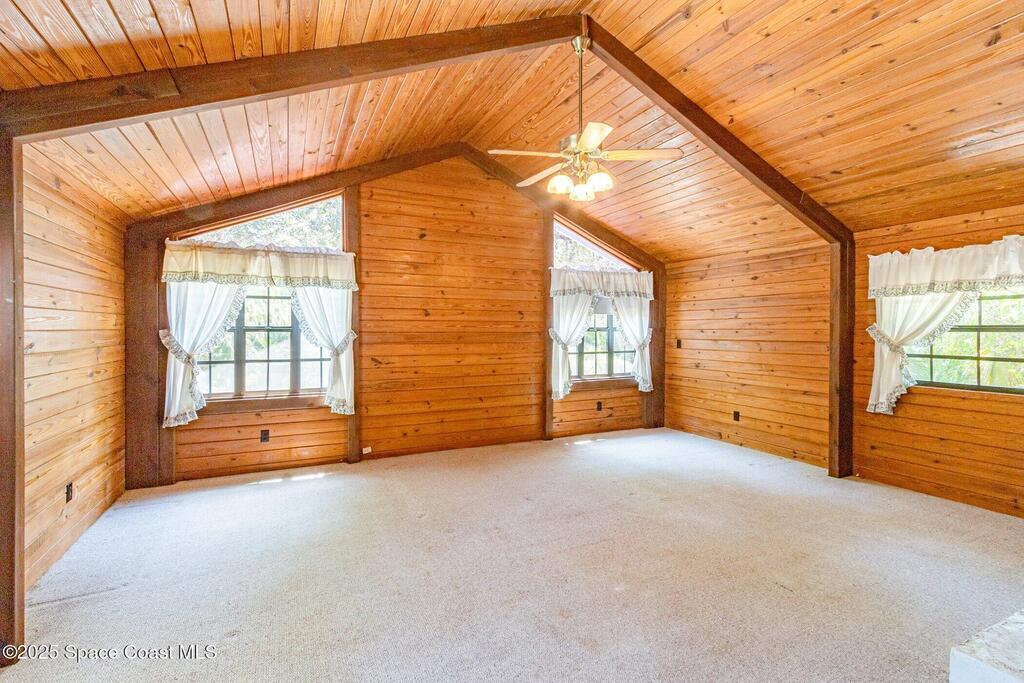 See this great new price in time for the NEW YEAR ...this 3 acre property with 2 stall barn and fenced pasture for horses and beautifully wooded lot on north Merritt Island. You will enjoy the peace and quiet. This flag lot property boasts spacious 3 bedroom 2.5 bath home with 2 car garage. Large downstairs living area with vaulted ceilings, fireplace with oak wood walls and high beams make you feel you truly are living in the woods. Kitchen features oak cabinets with granite countertops. Den/office off the kitchen could function as 4th bedroom. Interior laundry. Upstairs master has large windows for lots of light and a fireplace for those cool nights. Large screen porch looks out to the horse pasture. 2 stall horse barn with electric and fans. Large fenced pasture. Roof approximately 3 years old, water heater 4 and septic replaced in 2007. Stop and see this property today!!