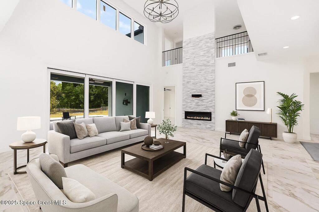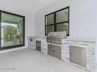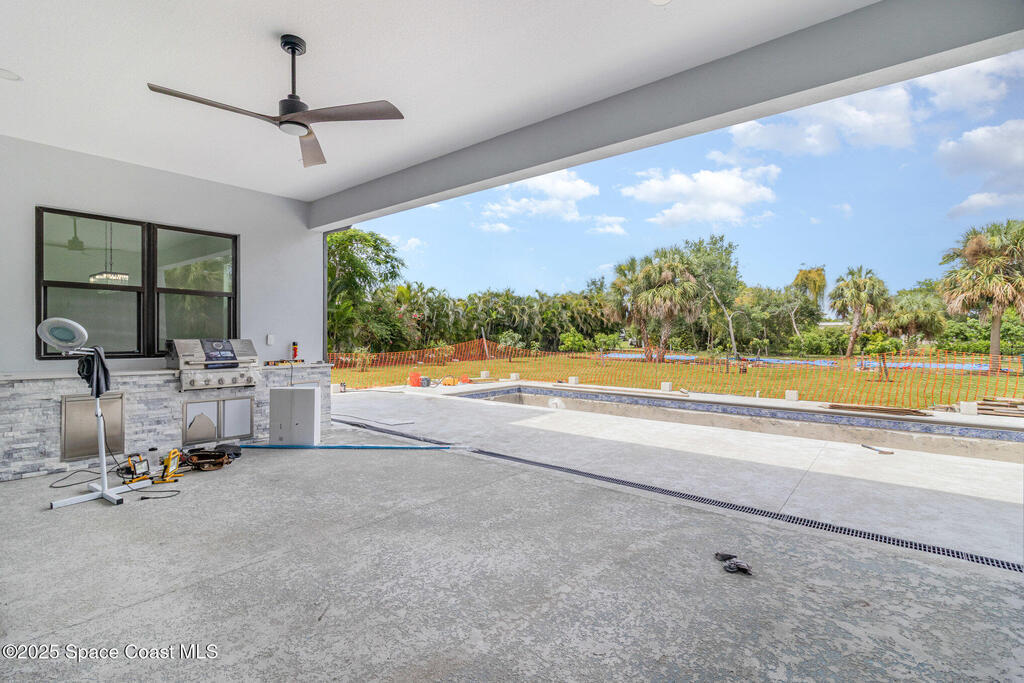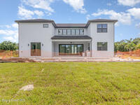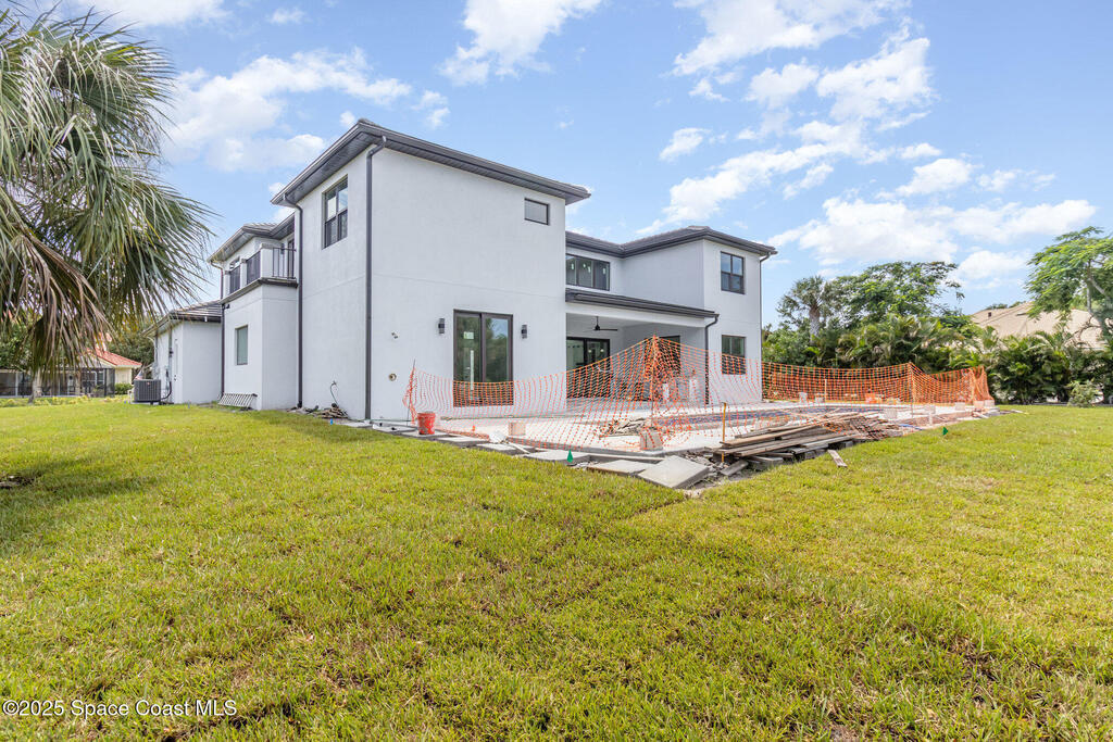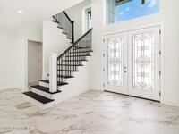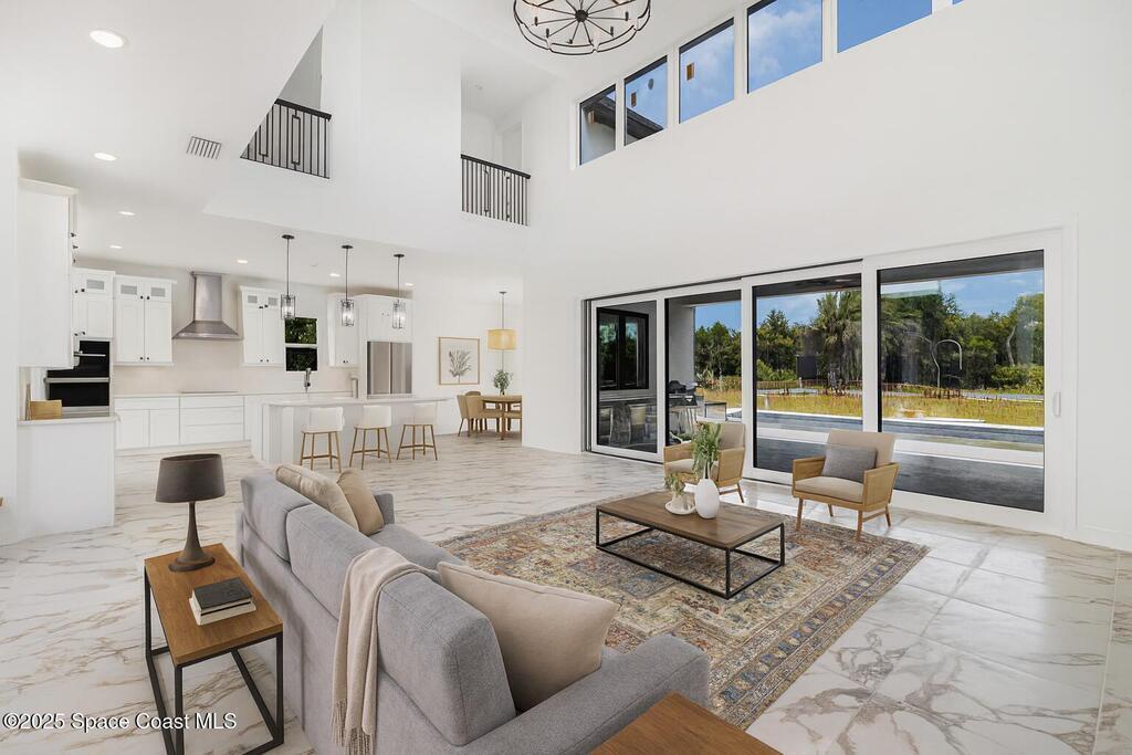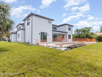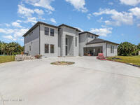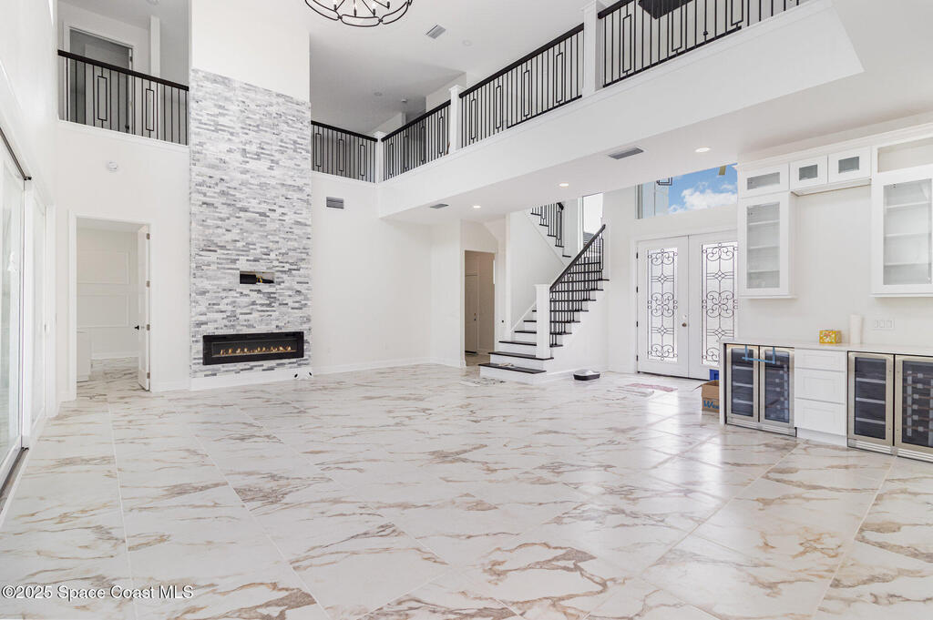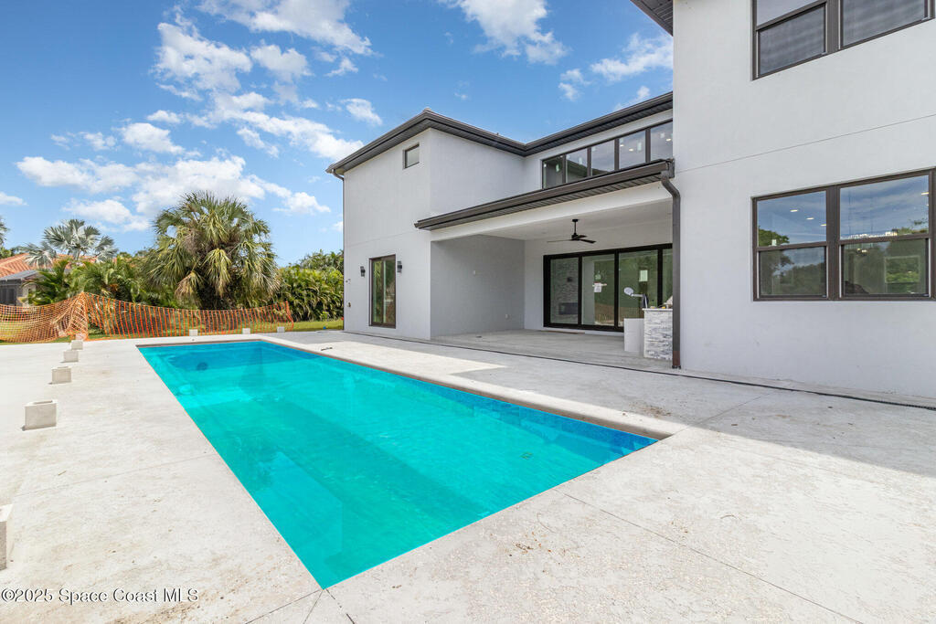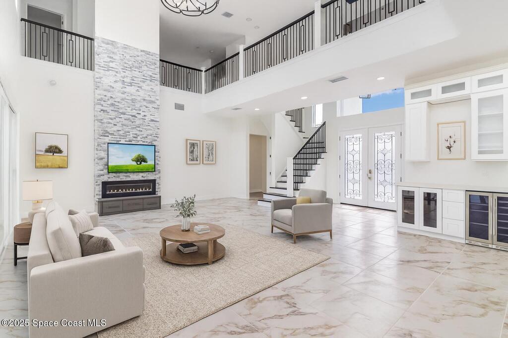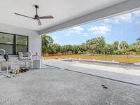 Brand-new luxury pool home in Merritt Island's coveted Hacienda neighborhood--perfectly set between the Banana River and the Intracoastal with community river access featuring 5 bedrooms plus an office/flex space, 4 baths, mud room, dedicated laundry, and 3, 712 SF under air (4, 865 SF total per plans). Highlights include marble floors, a dramatic black wrought-iron staircase, impact glass, and a 4-panel slider that opens to the fenced inground pool and covered outdoor living. The chef's kitchen showcases quartz countertops, double-stack cabinets, a farm sink, double oven with cooktop, hood vent, a breakfast bar, and a true wet bar/drink station with cabinetry and two wine/beverage coolers. Outside, architectural corbels accent the elevation, complemented by gutters and a 50-year clay tile roof. Enjoy a covered balcony with river views, an indoor electric fireplace with stone, and an outdoor kitchen with gas grill, cabinets, fridge, and quartz/ stone finishes for pool parties & BBQ's.