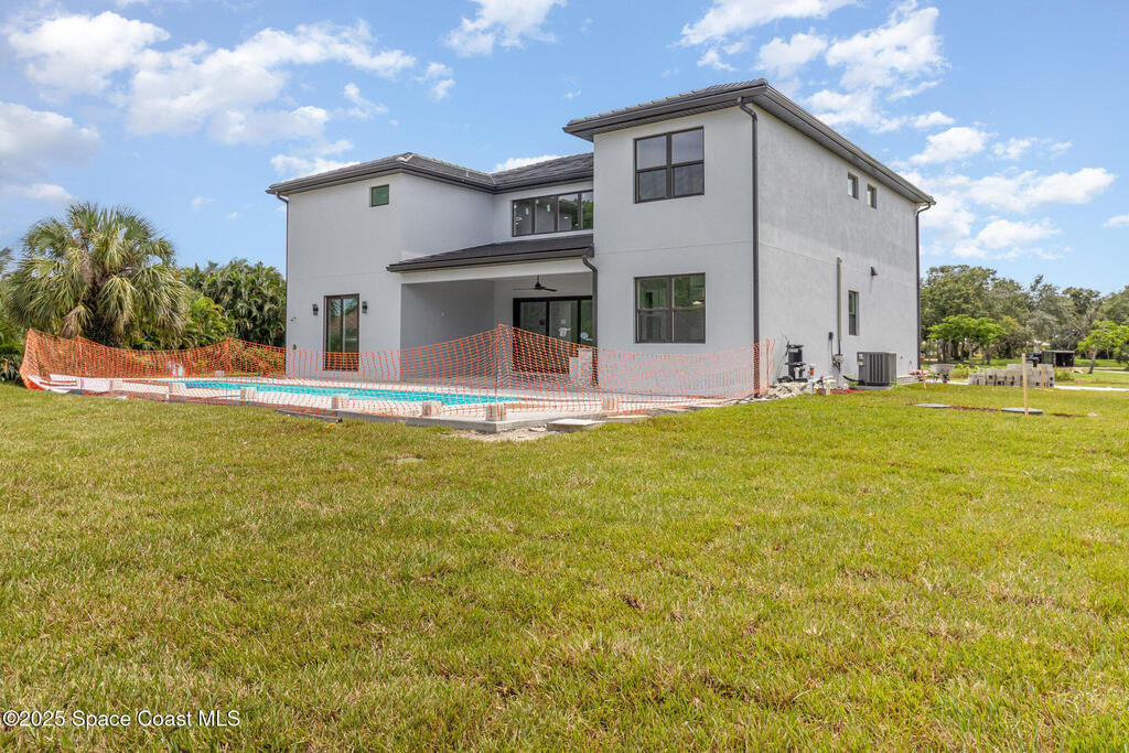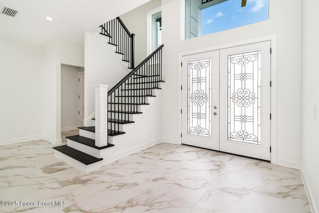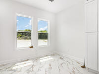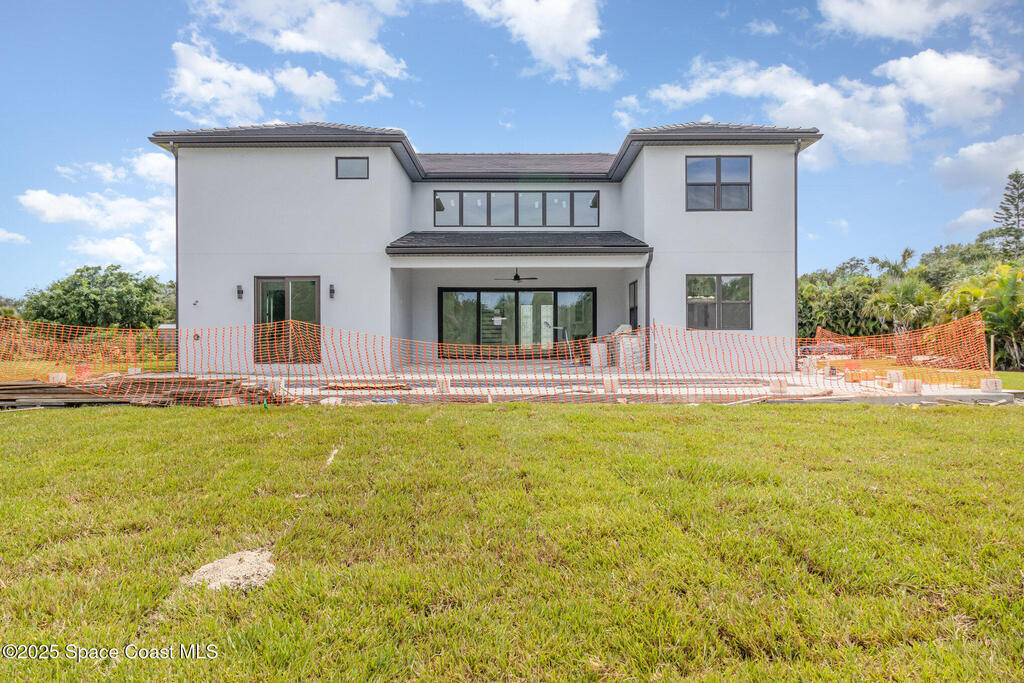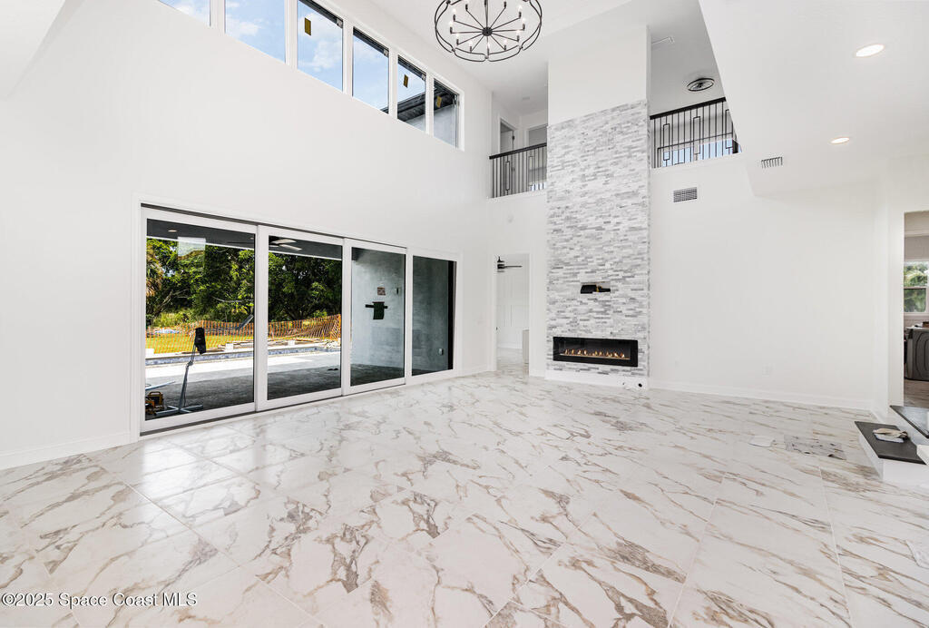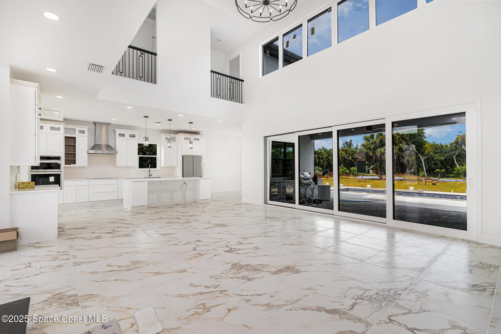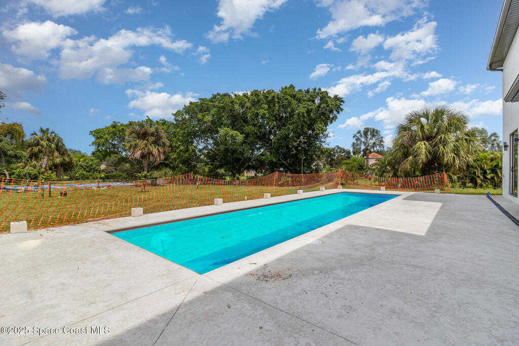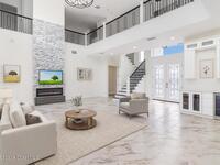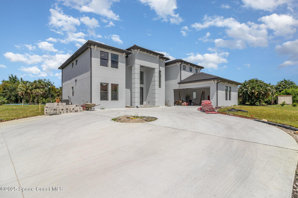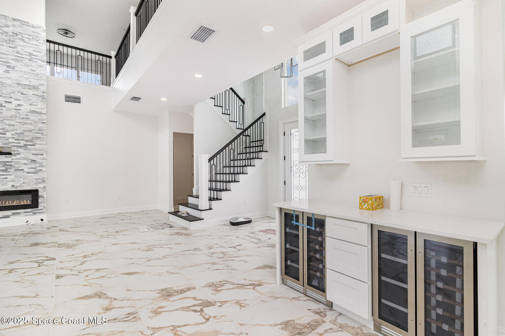 Brand-new luxury pool home in Merritt Island's coveted Hacienda neighborhood--perfectly set between the Banana River and the Intracoastal with community river access featuring 5 bedrooms plus an office/flex space, 4 baths, mud room, dedicated laundry, and 3, 712 SF under air (4, 865 SF total per plans). Highlights include marble floors, a dramatic black wrought-iron staircase, impact glass, and a 4-panel slider that opens to the fenced inground pool and covered outdoor living. The chef's kitchen showcases quartz countertops, double-stack cabinets, a farm sink, double oven with cooktop, hood vent, a breakfast bar, and a true wet bar/drink station with cabinetry and two wine/beverage coolers. Outside, architectural corbels accent the elevation, complemented by gutters and a 50-year clay tile roof. Enjoy a covered balcony with river views, an indoor electric fireplace with stone, and an outdoor kitchen with gas grill, cabinets, fridge, and quartz/ stone finishes for pool parties & BBQ's.