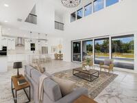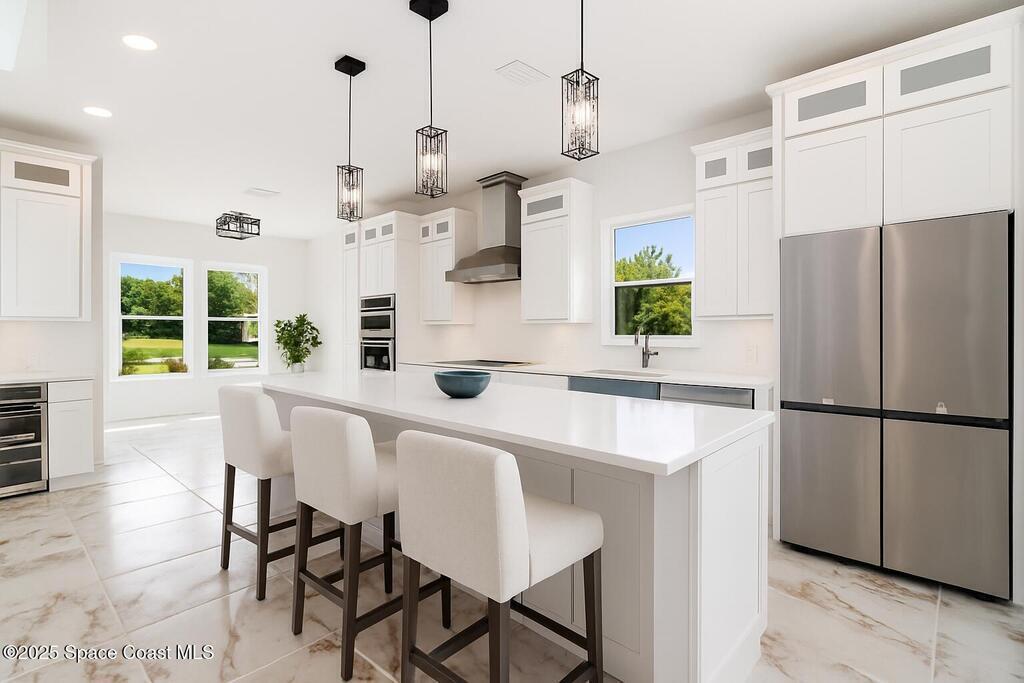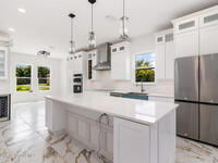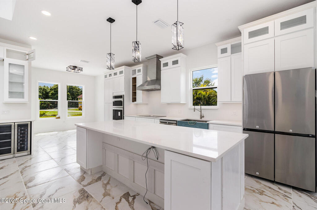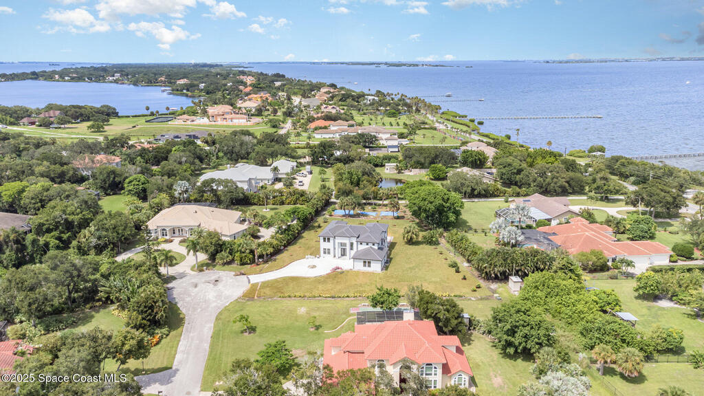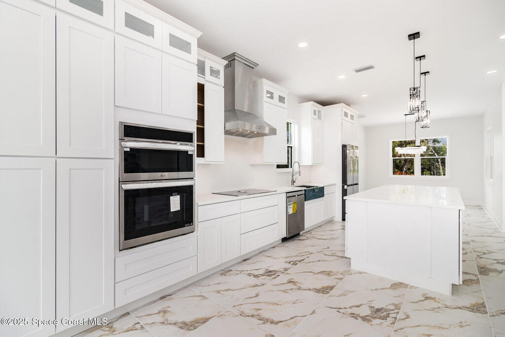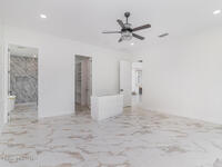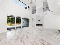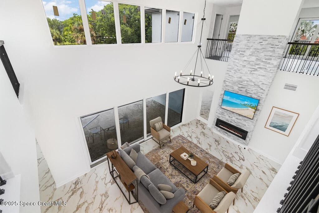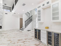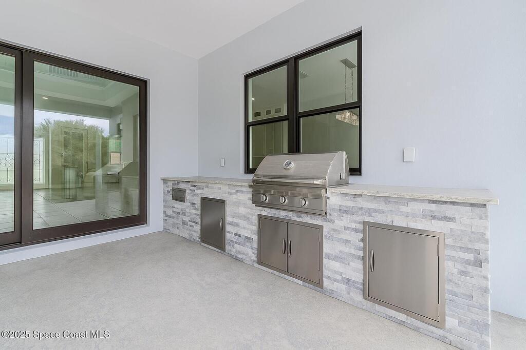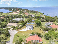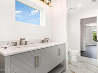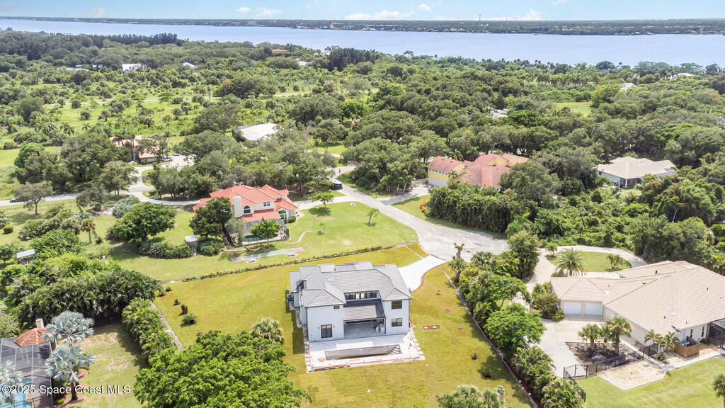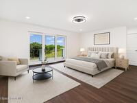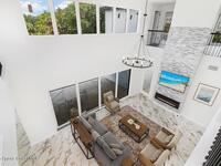 Brand-new luxury pool home in Merritt Island's coveted Hacienda neighborhood--perfectly set between the Banana River and the Intracoastal with community river access featuring 5 bedrooms plus an office/flex space, 4 baths, mud room, dedicated laundry, and 3, 712 SF under air (4, 865 SF total per plans). Highlights include marble floors, a dramatic black wrought-iron staircase, impact glass, and a 4-panel slider that opens to the fenced inground pool and covered outdoor living. The chef's kitchen showcases quartz countertops, double-stack cabinets, a farm sink, double oven with cooktop, hood vent, a breakfast bar, and a true wet bar/drink station with cabinetry and two wine/beverage coolers. Outside, architectural corbels accent the elevation, complemented by gutters and a 50-year clay tile roof. Enjoy a covered balcony with river views, an indoor electric fireplace with stone, and an outdoor kitchen with gas grill, cabinets, fridge, and quartz/ stone finishes for pool parties & BBQ's.