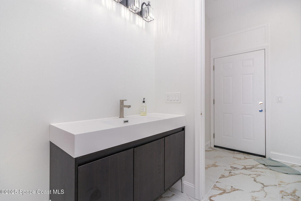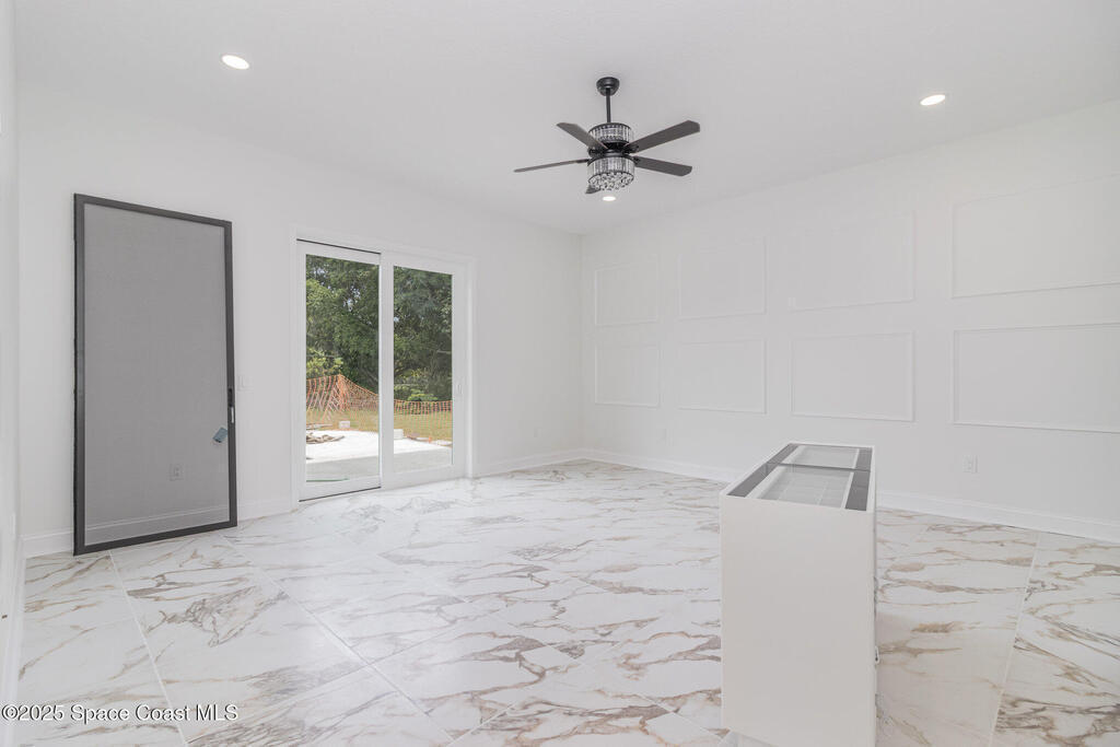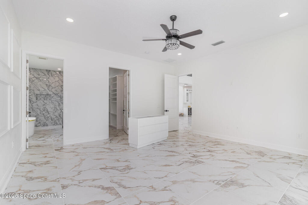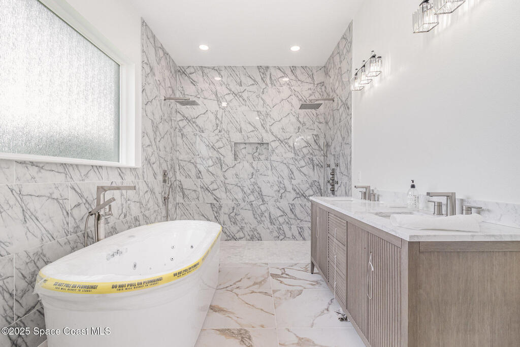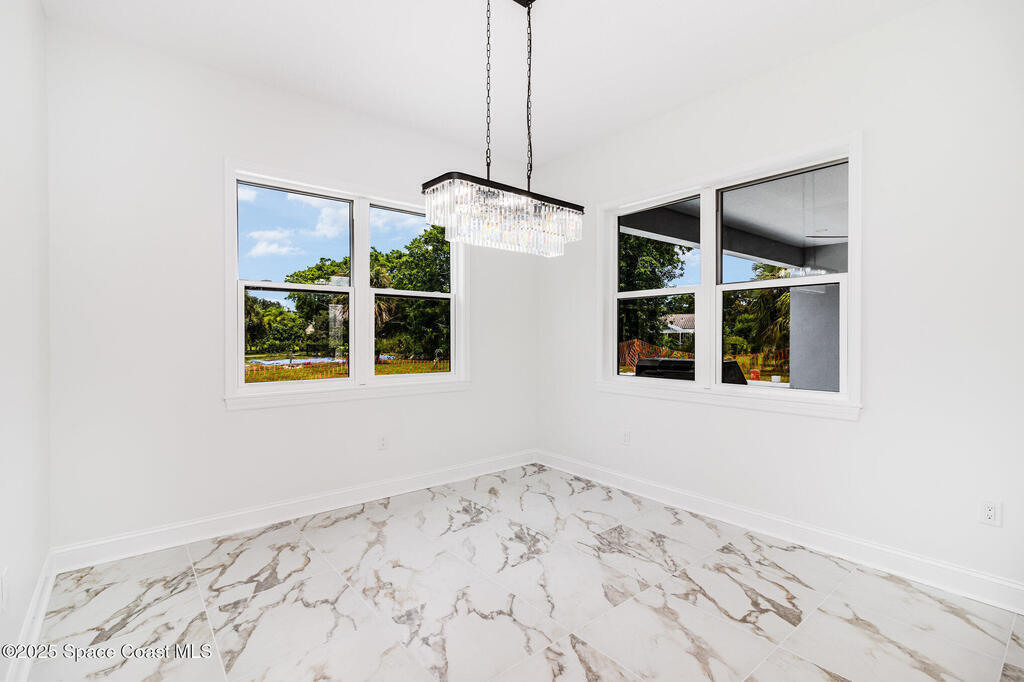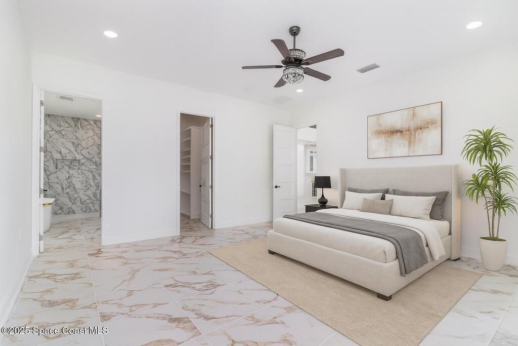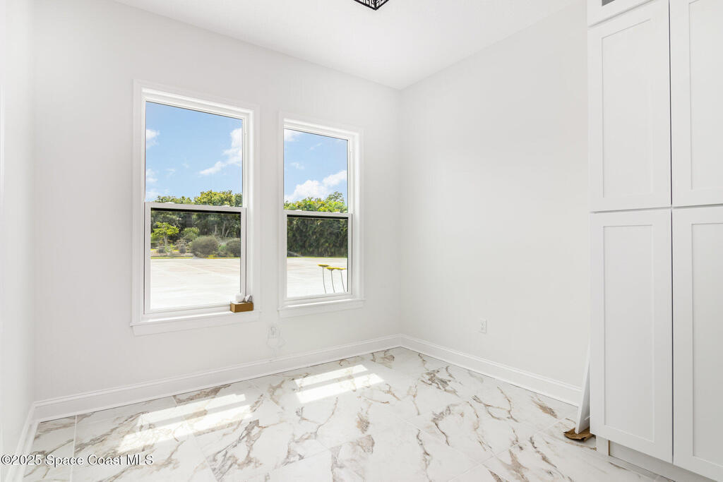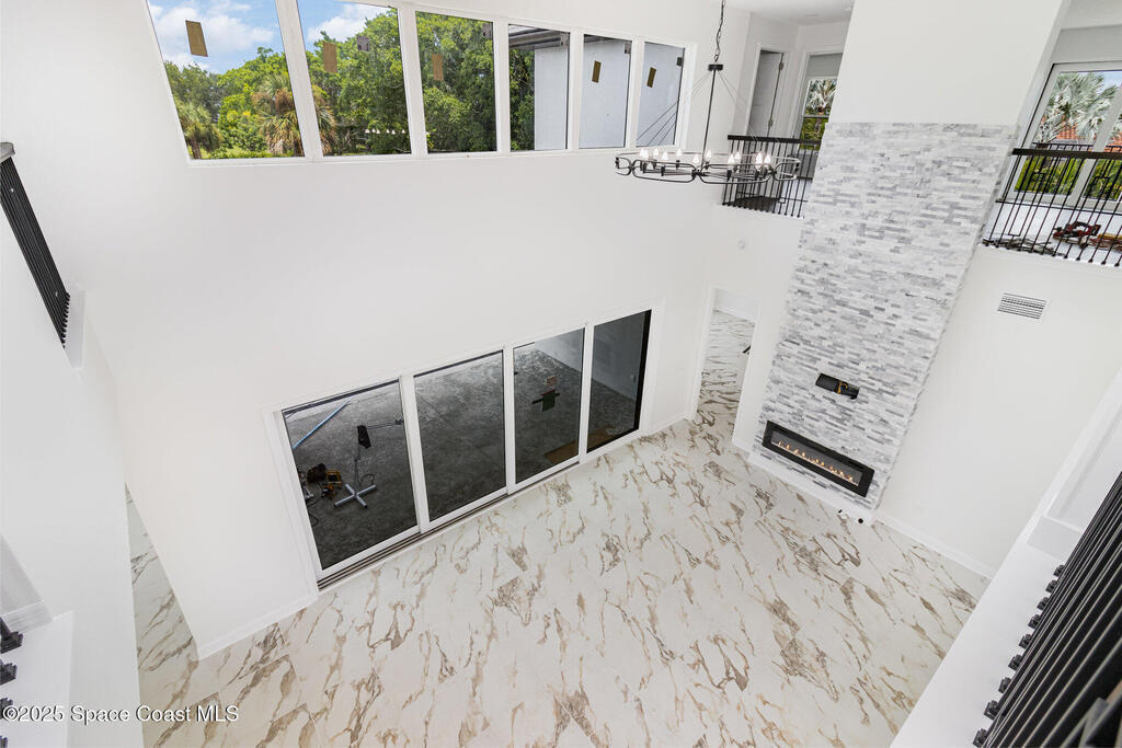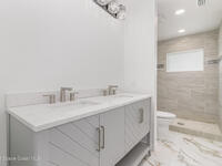 Brand-new luxury pool home in Merritt Island's coveted Hacienda neighborhood--perfectly set between the Banana River and the Intracoastal with community river access featuring 5 bedrooms plus an office/flex space, 4 baths, mud room, dedicated laundry, and 3, 712 SF under air (4, 865 SF total per plans). Highlights include marble floors, a dramatic black wrought-iron staircase, impact glass, and a 4-panel slider that opens to the fenced inground pool and covered outdoor living. The chef's kitchen showcases quartz countertops, double-stack cabinets, a farm sink, double oven with cooktop, hood vent, a breakfast bar, and a true wet bar/drink station with cabinetry and two wine/beverage coolers. Outside, architectural corbels accent the elevation, complemented by gutters and a 50-year clay tile roof. Enjoy a covered balcony with river views, an indoor electric fireplace with stone, and an outdoor kitchen with gas grill, cabinets, fridge, and quartz/ stone finishes for pool parties & BBQ's.