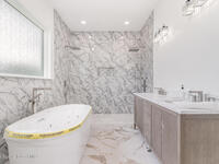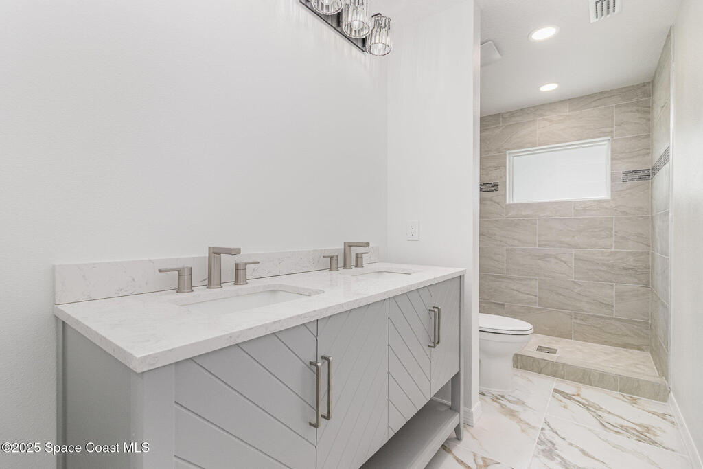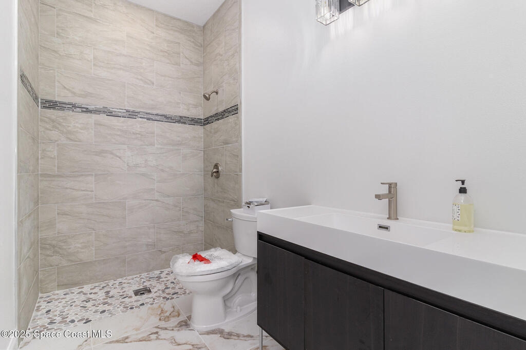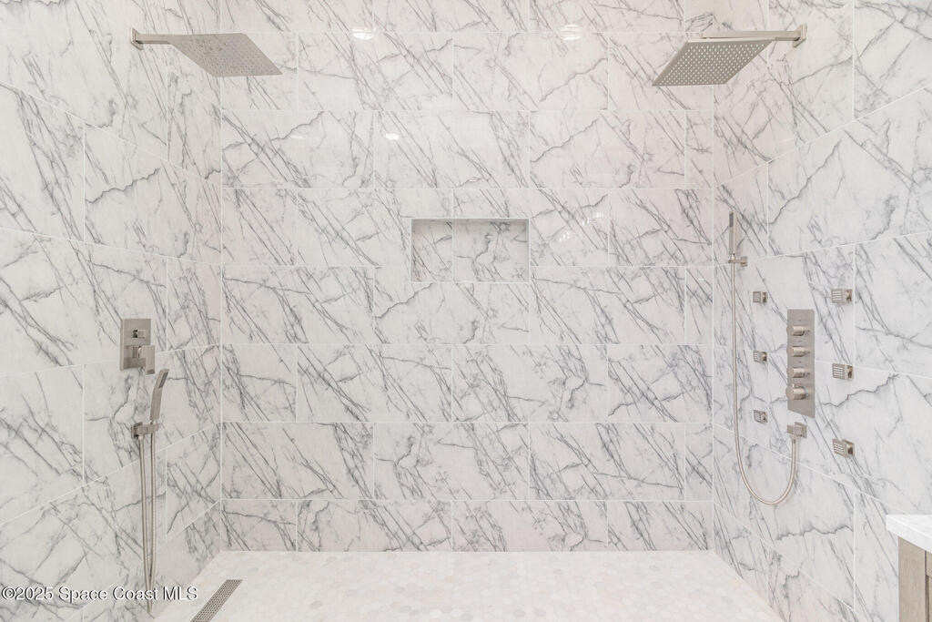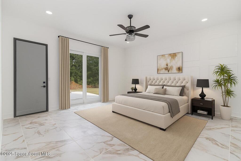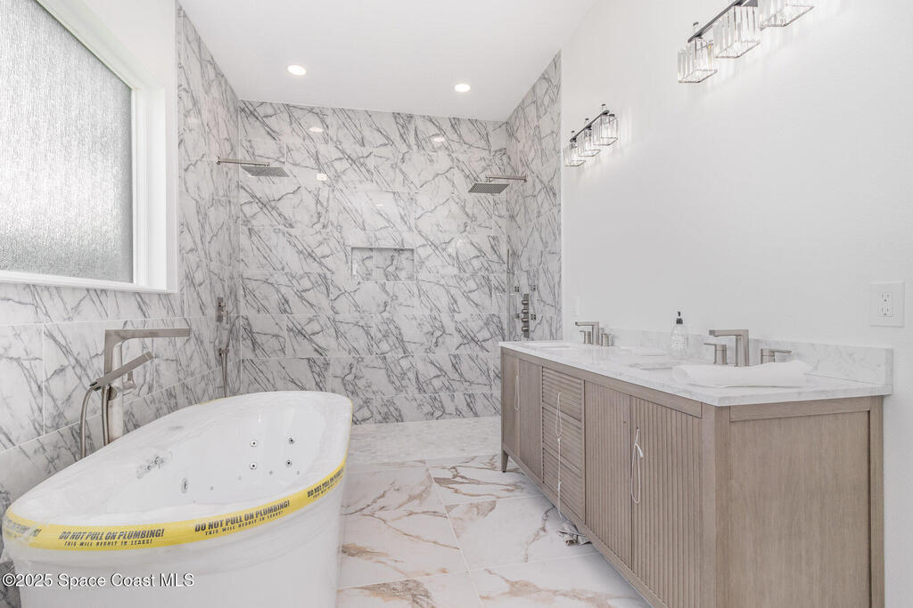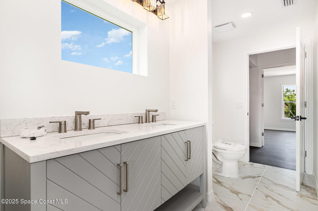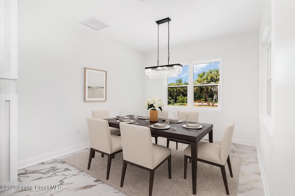 Brand-new luxury pool home in Merritt Island's coveted Hacienda neighborhood--perfectly set between the Banana River and the Intracoastal with community river access featuring 5 bedrooms plus an office/flex space, 4 baths, mud room, dedicated laundry, and 3, 712 SF under air (4, 865 SF total per plans). Highlights include marble floors, a dramatic black wrought-iron staircase, impact glass, and a 4-panel slider that opens to the fenced inground pool and covered outdoor living. The chef's kitchen showcases quartz countertops, double-stack cabinets, a farm sink, double oven with cooktop, hood vent, a breakfast bar, and a true wet bar/drink station with cabinetry and two wine/beverage coolers. Outside, architectural corbels accent the elevation, complemented by gutters and a 50-year clay tile roof. Enjoy a covered balcony with river views, an indoor electric fireplace with stone, and an outdoor kitchen with gas grill, cabinets, fridge, and quartz/ stone finishes for pool parties & BBQ's.