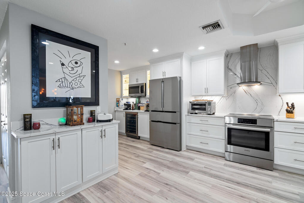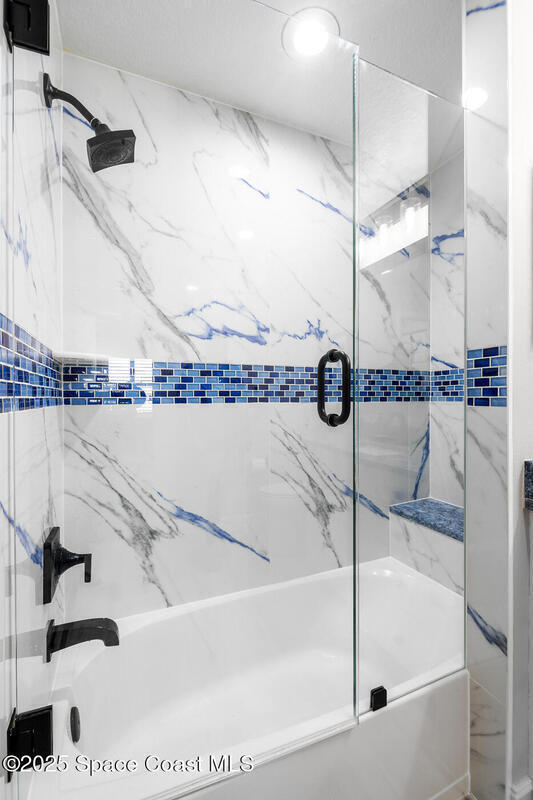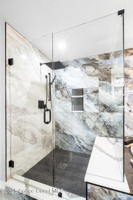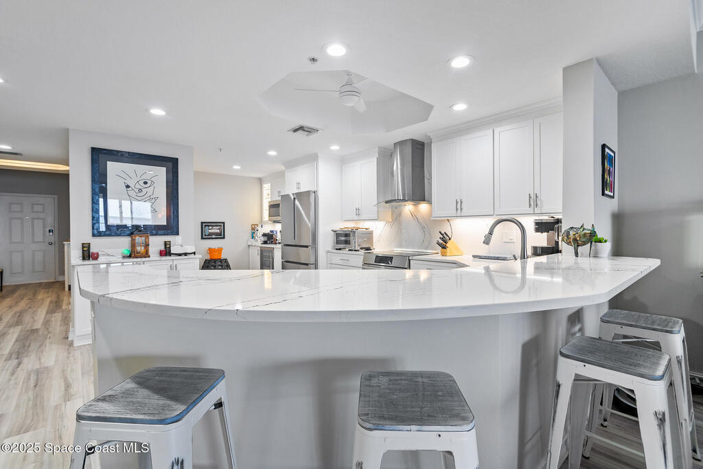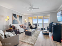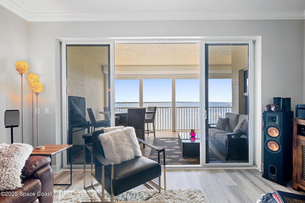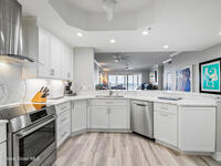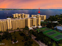THE STANDOUT TOP FLOOR direct riverfront unit at Island Pointe! Don't go through the hassle of a Condo Renovation! This is the unit you have been waiting for. Arguably the most modern renovated unit on the market in this gated community in Merritt Island with two pools, clubhouse, gym, tennis and more. Inside you'll find a Miami-style renovation with a beautiful Cambria Quartz kitchen with tons of counter space and all Bosch SS appliances. Dry bar with built in wine fridge. Open concept with lots of space and large pantry. Complete bathroom renovations with matching quartz/resin/stone features, defog backlit mirrors and high end hardware. Tons of storage and super high 10ft ceiling with floor to ceiling sliders to waterfront balcony. Laundry room with sink and high end washer/dryer included. Guest rooms have nice view and plantation shutters. Sweeping Indian River views and beautiful rocket launch/sunset views! Private one car garage with shelving and open guest parking.