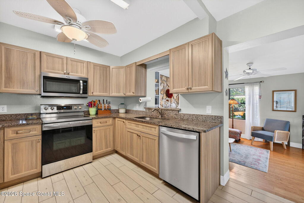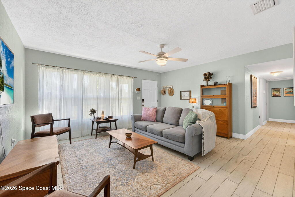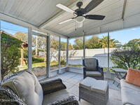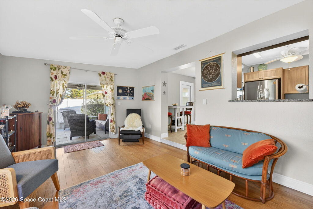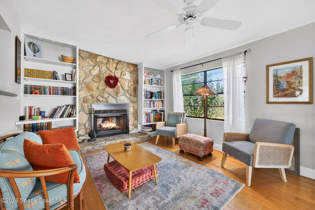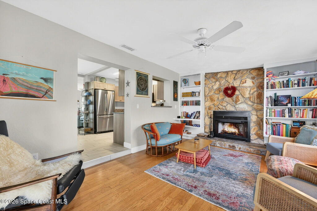 There's No Place Like Home! And, this MCM cottage is simply adorable and move in ready with so many updates - full remodel in 2023 of roof, plank tile flooring throughout, kitchen, HVAC, interior/exterior paint, bathrooms & paver driveway ... 2025: ceiling fans & bathroom drain lines replaced ... other recent updates: electric panel, septic 2020, water heater, chimney vent & windows. Modern kitchen with plenty of cabinets, granite counters & stainless appliances. Family room with original wood flooring, fireplace & built in bookcases. Screened patio offers view of gazebo. Yard completely fenced with room for pool or garden. Best part? Just a few blocks from local restaurants, courtyard wine bar, coffee bar, live music, pet resort, personal spa ... a few more blocks to brand name shopping or the Indian River with boat/kayak launch! Quick ride over the bridge to everything that is Cocoa Village! Short drive to space related work, cruise port & beaches! Location! Location! Location!