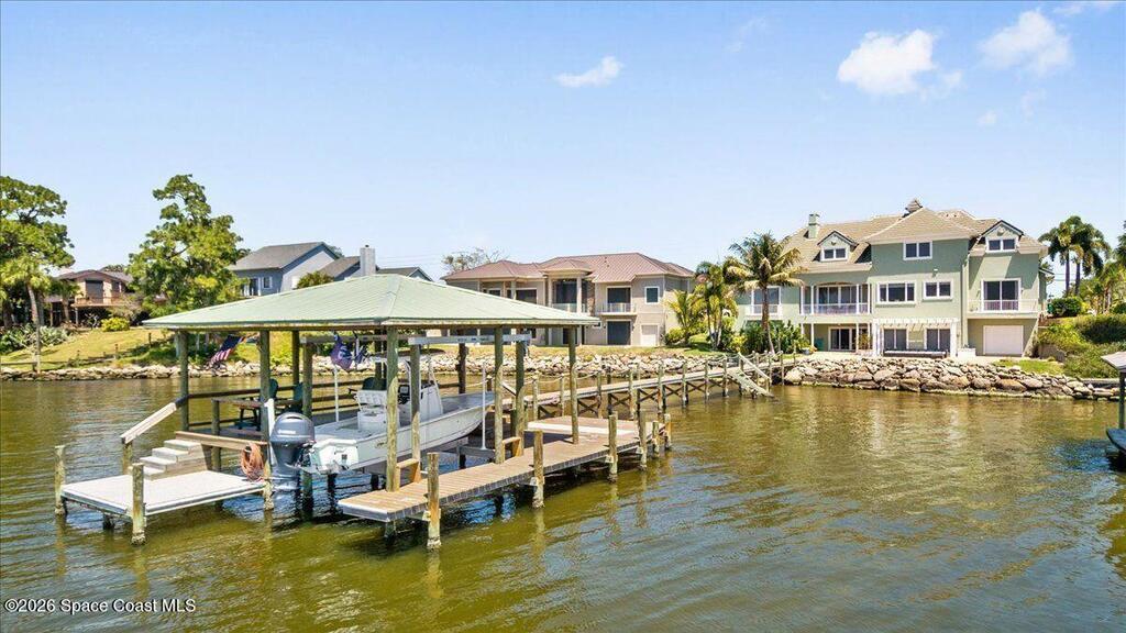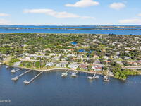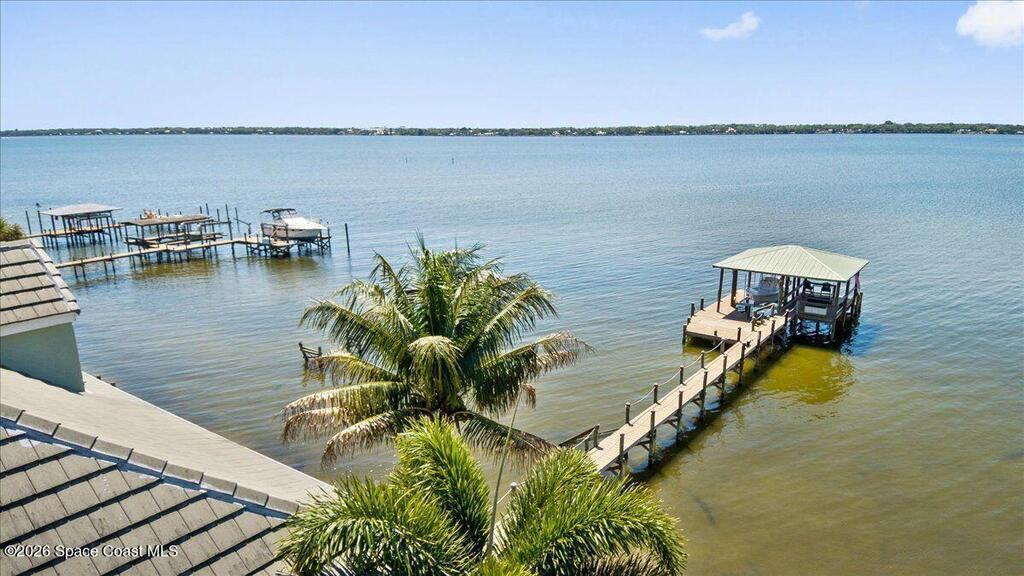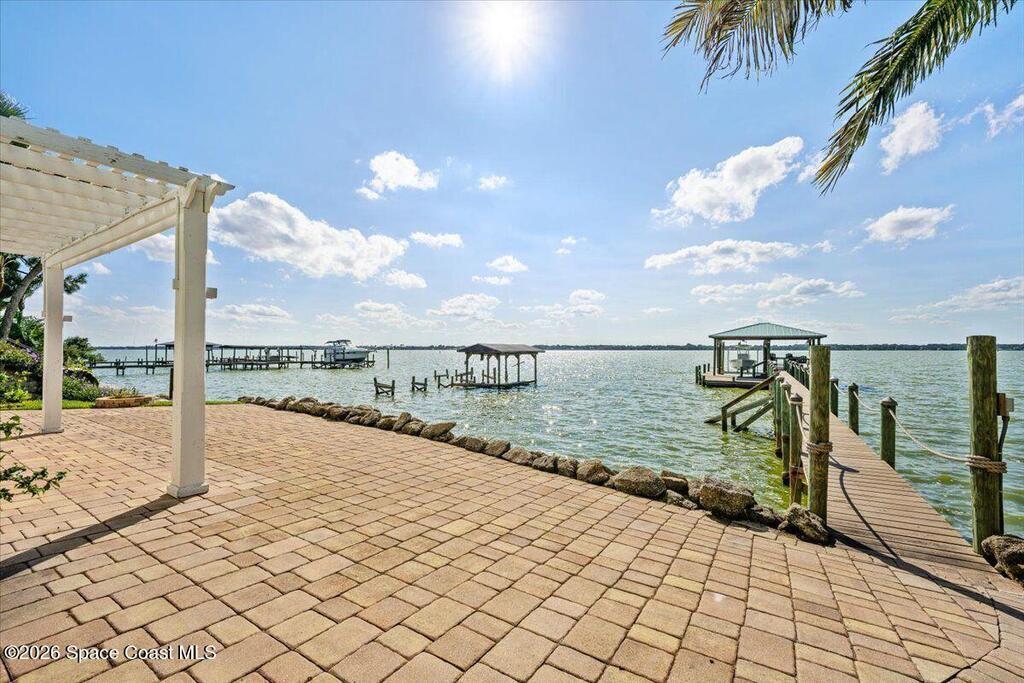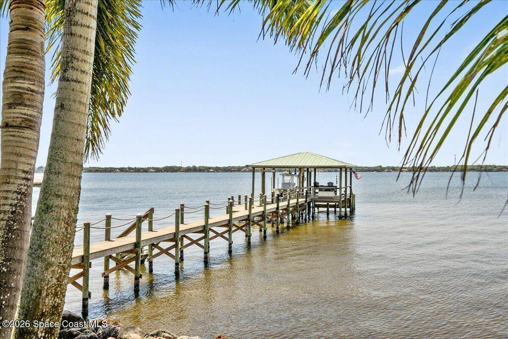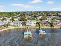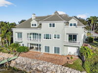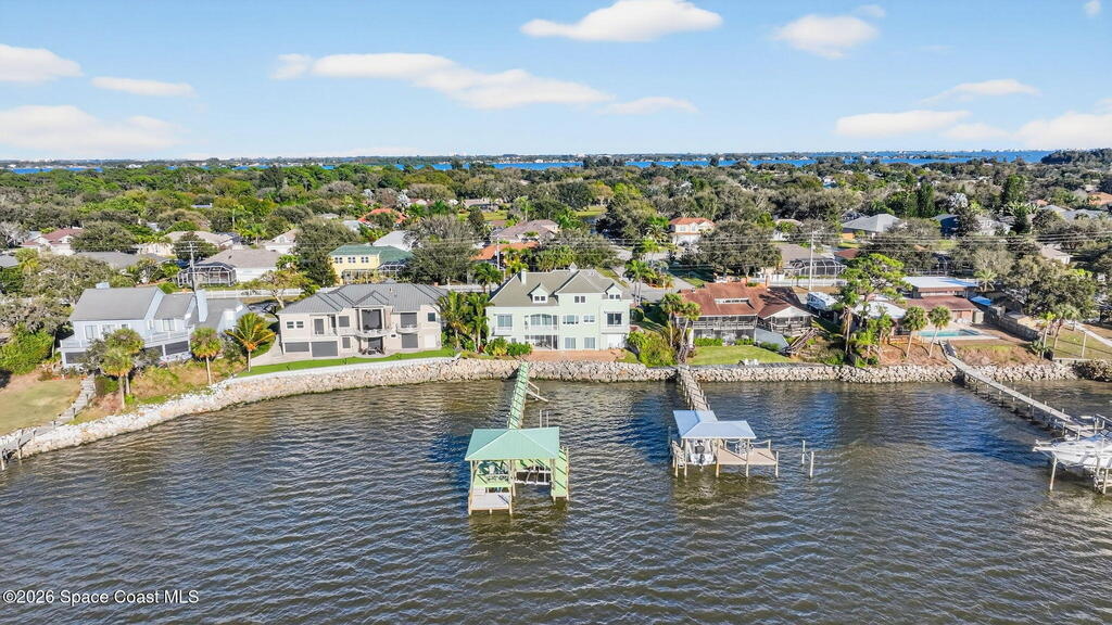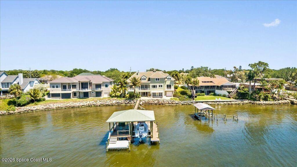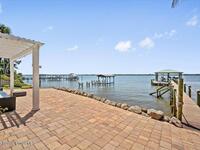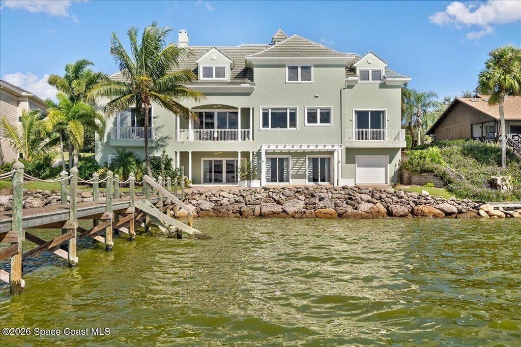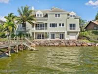 Experience expansive views of the marine-life-filled Indian River and breathtaking sunsets from every room of this 5200 sq ft waterfront home. Featuring 5 bedrooms, 6 baths, an office, and bonus room, this residence offers exceptional space for multi-generational living or entertaining. The stunning eat-in kitchen boasts river views, a balcony, custom cabinetry, granite counters, chef's island, and Sub-Zero refrigerator. The primary suite on the main level includes a private riverfront terrace. A lower-level suite offers living space, kitchenette area, and walk-out access to the river. Architectural details include tray ceilings, wood beams, crown molding, and high ceilings throughout. Enjoy the expanded dock with boat lift (2018), step-down fishing area, coquina rock shoreline, and large paved patio with fire pit. Oversized bedrooms, abundant storage, large closets, 2 NEW a/c units, no-see-um screened balcony, and jet ski lift, complete this exceptional riverfront retreat.